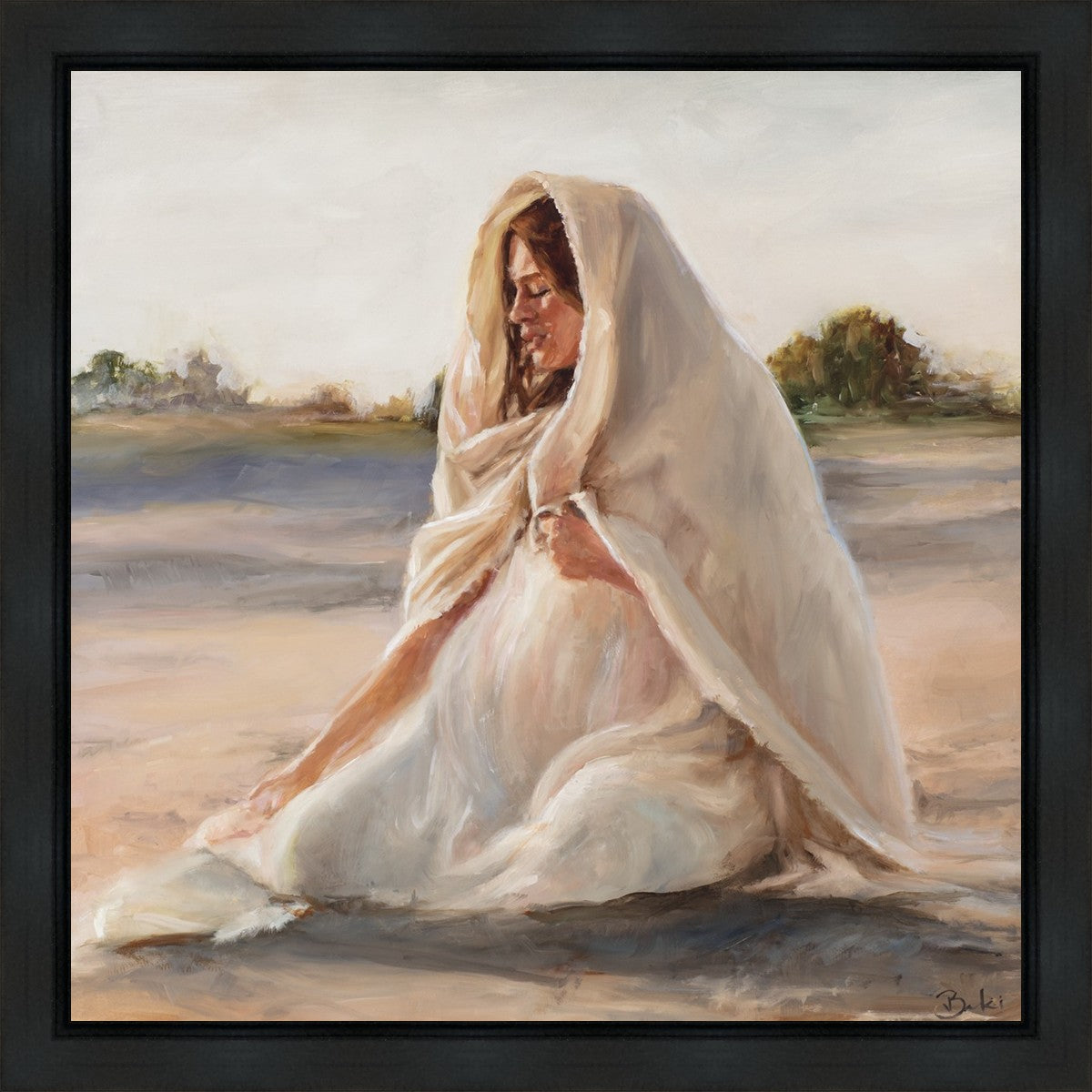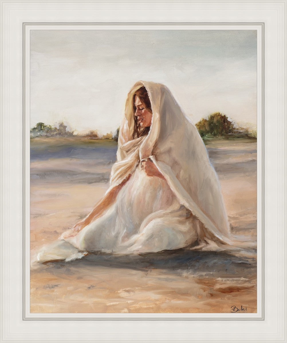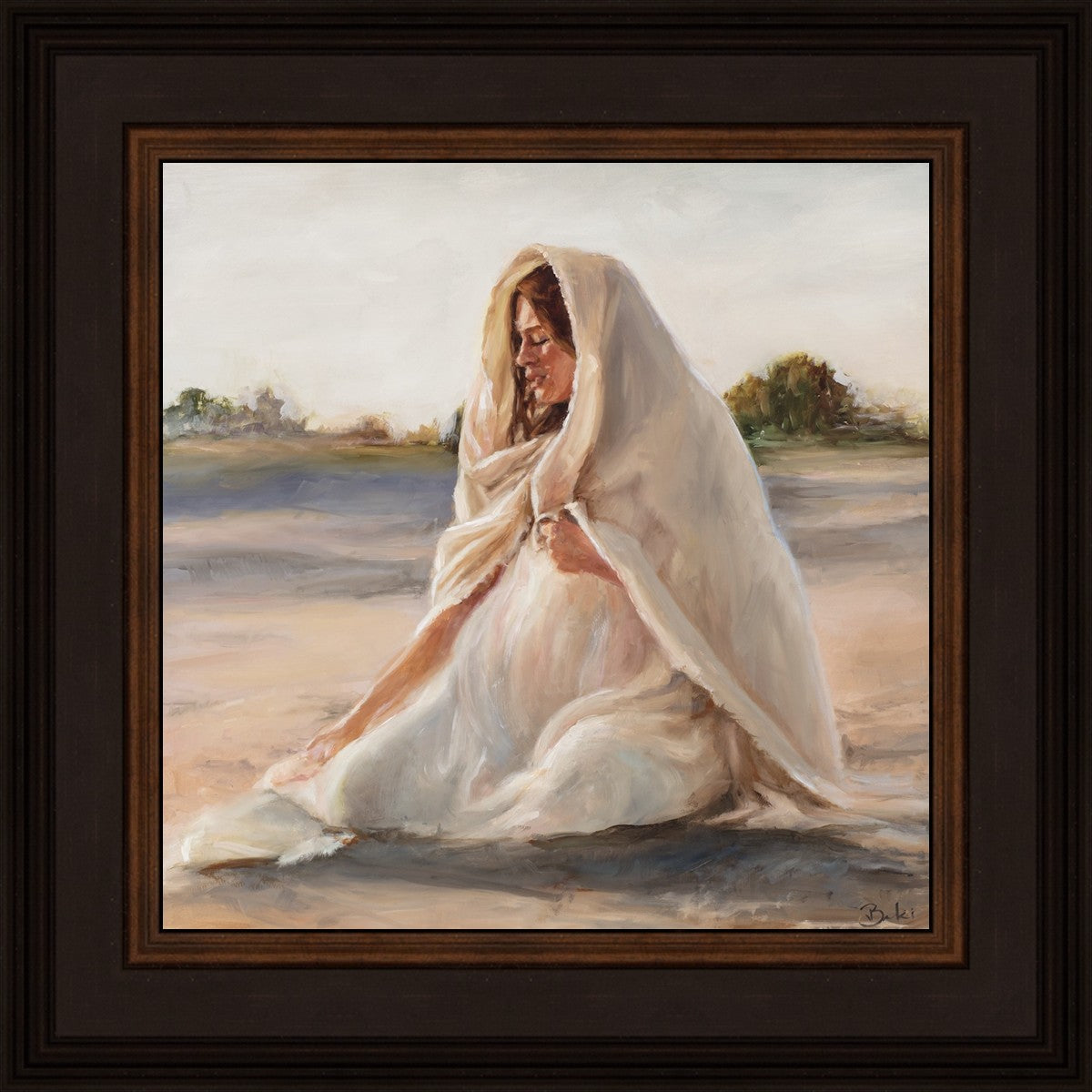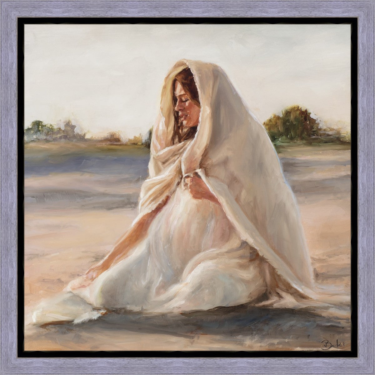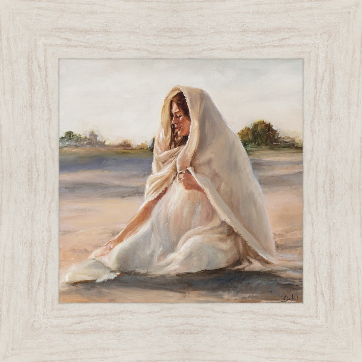 This painting is my tribute to Mary, an attempt at capturing the emotions she must have had to conquer as she prepared to travel to Bethlehem. With her time drawing near, leaving behind comfort and family support, she was about to bring the Child of God into the world.
