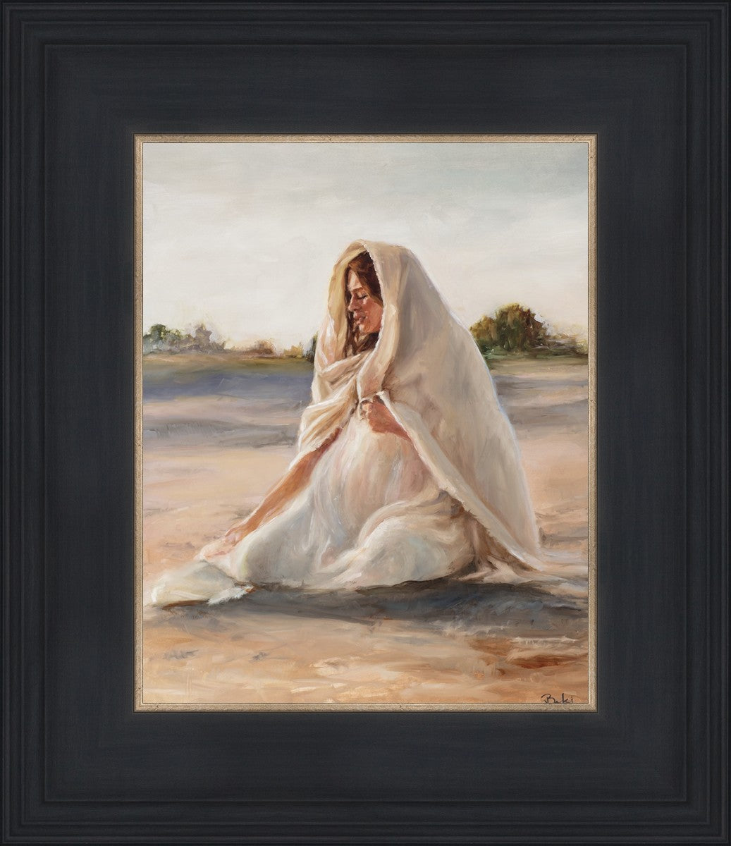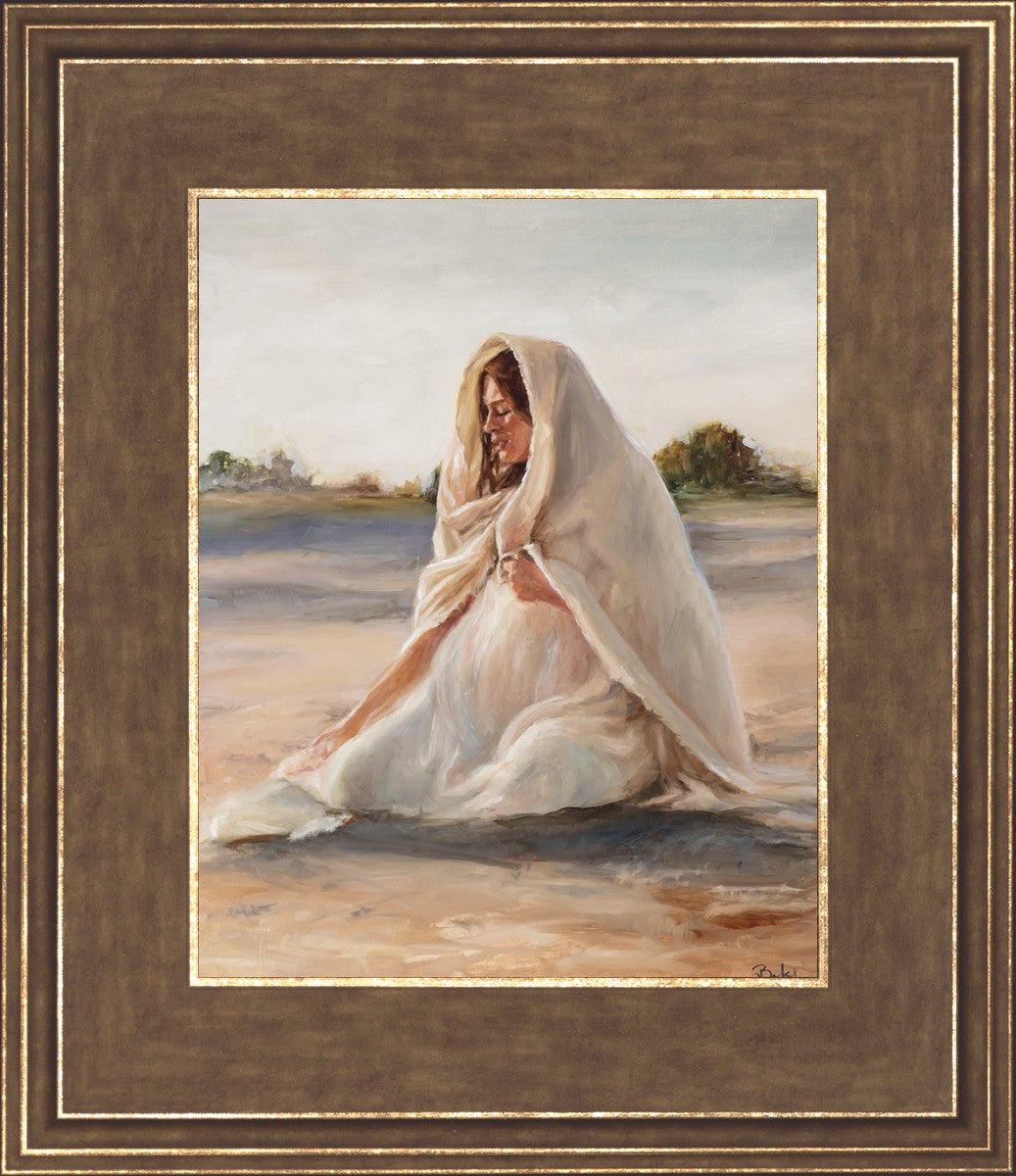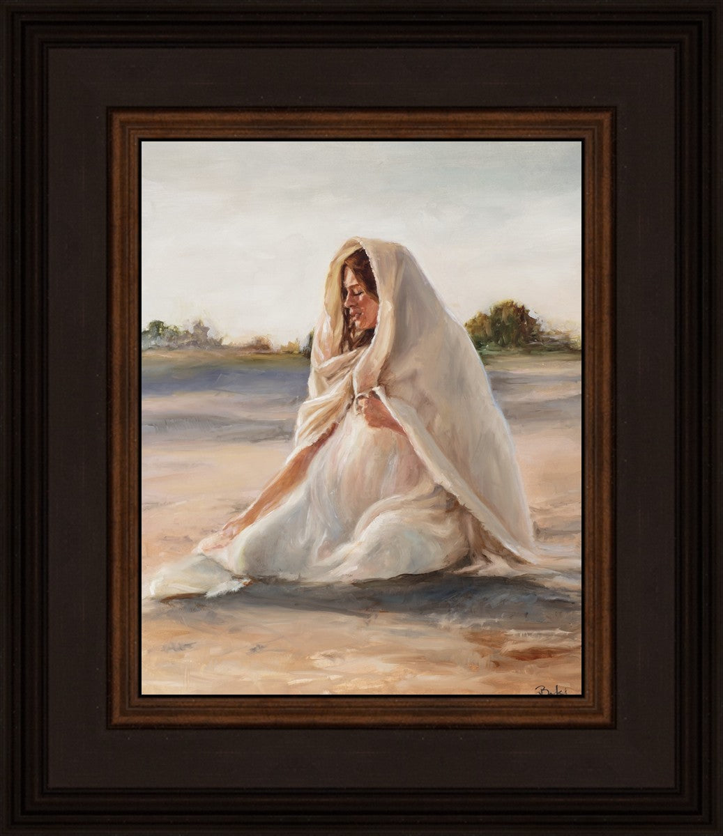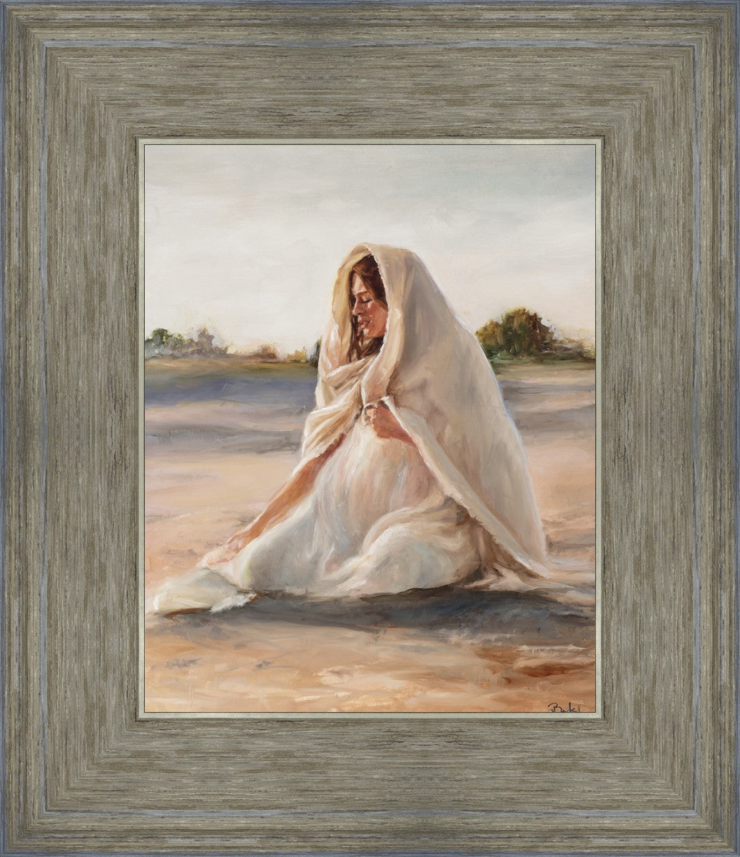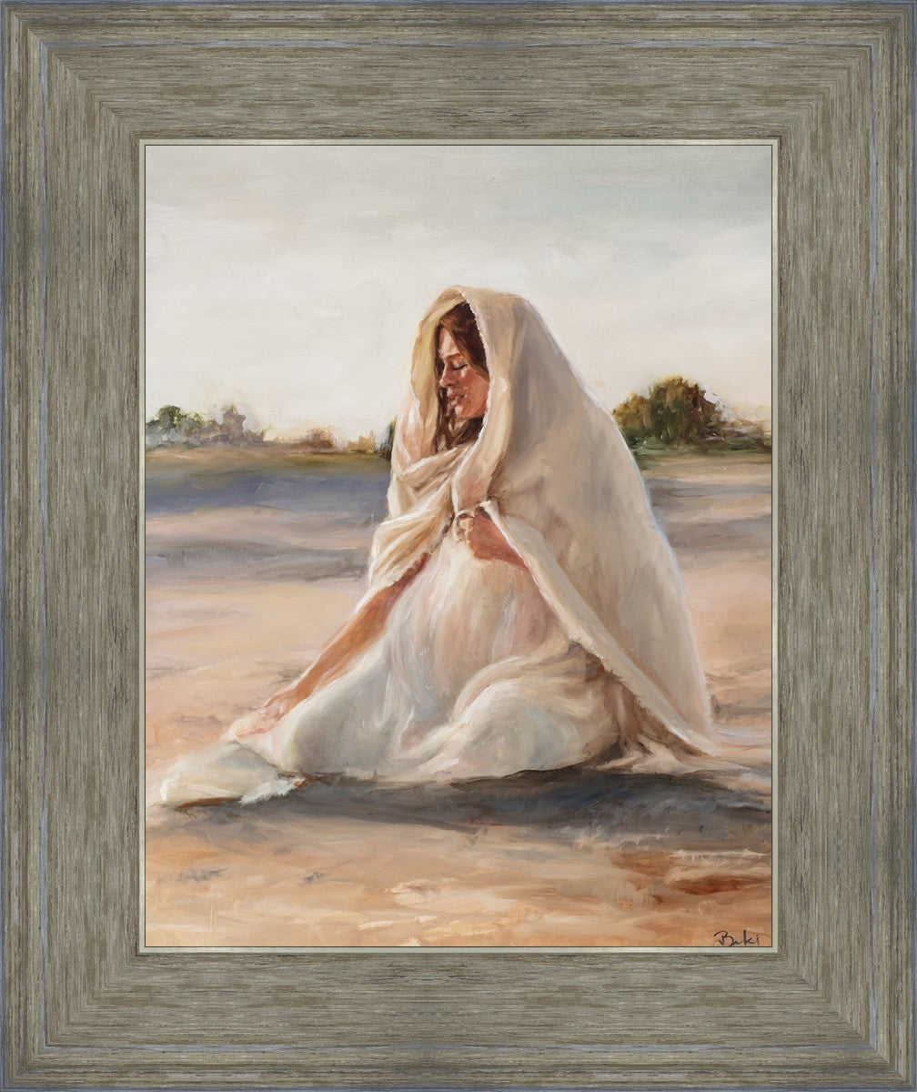 This painting is my tribute to Mary, an attempt at capturing the emotions she must have had to conquer as she prepared to travel to Bethlehem. With her time drawing near, leaving behind comfort and family support, she was about to bring the Child of God into the world.