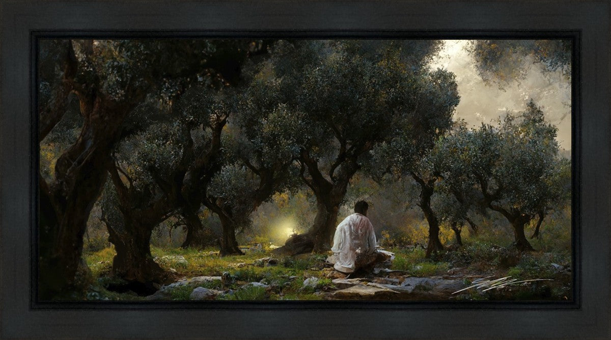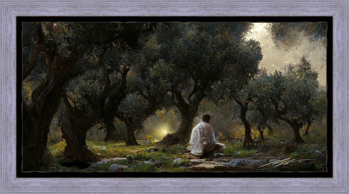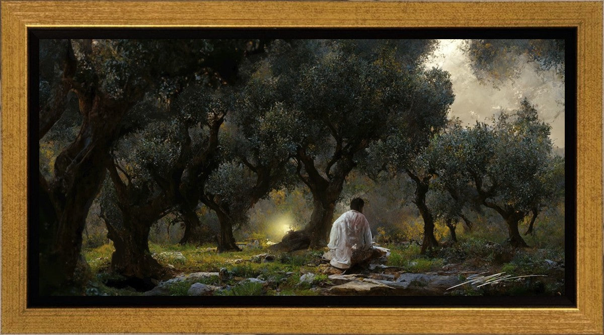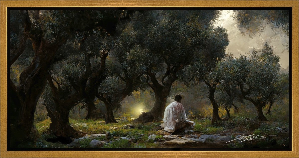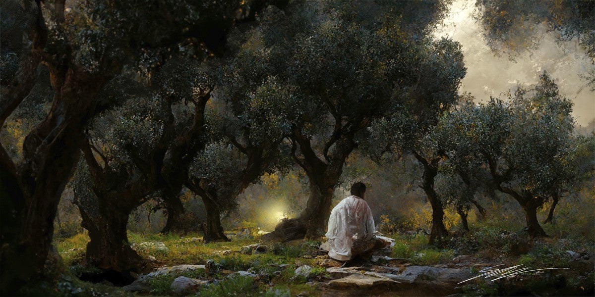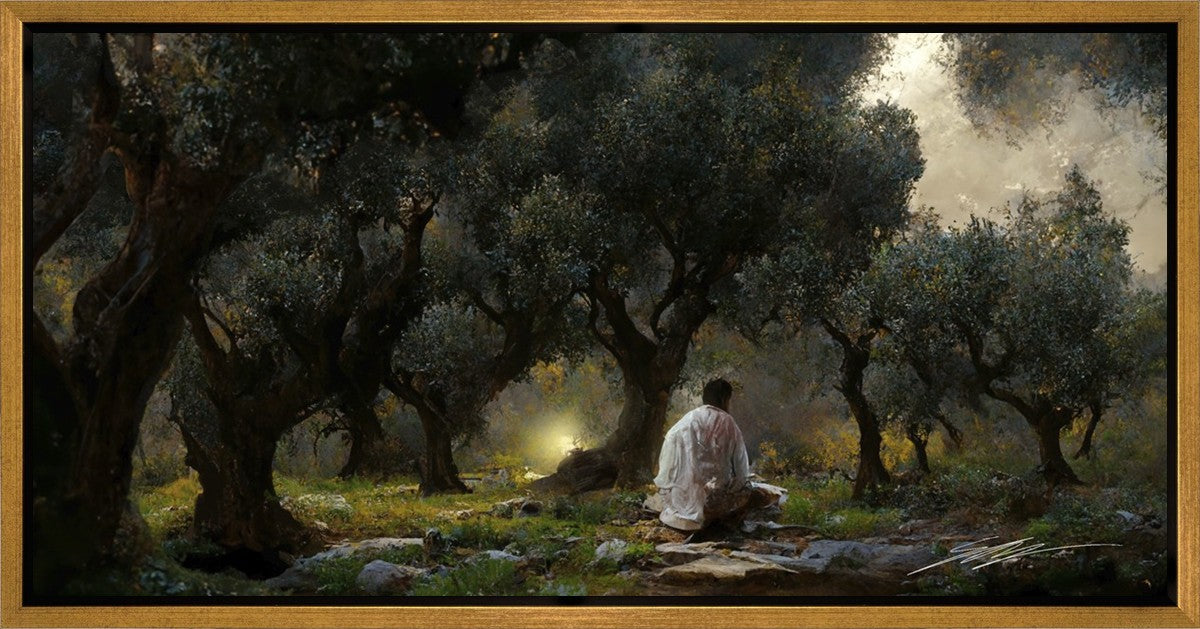 In this painting - Jesus kneels beside an olive press in the garden of Gethsemane, holding an empty cup. The setting is not by chance—Gethsemane was a place where olives were crushed under immense pressure, releasing rich red oil (almost like scarlet). This pressing of the olives parallels the crushing weight of the world’s sins that Jesus bore that night. Luke 22:44 describes how "being in agony, He prayed more earnestly; and His sweat was as it were great drops of blood falling down to the ground." Just as olives release their oil under pressure, Jesus’ suffering caused Him to bleed from every pore as He took upon Himself the full weight of human sin, sorrow, and pain.