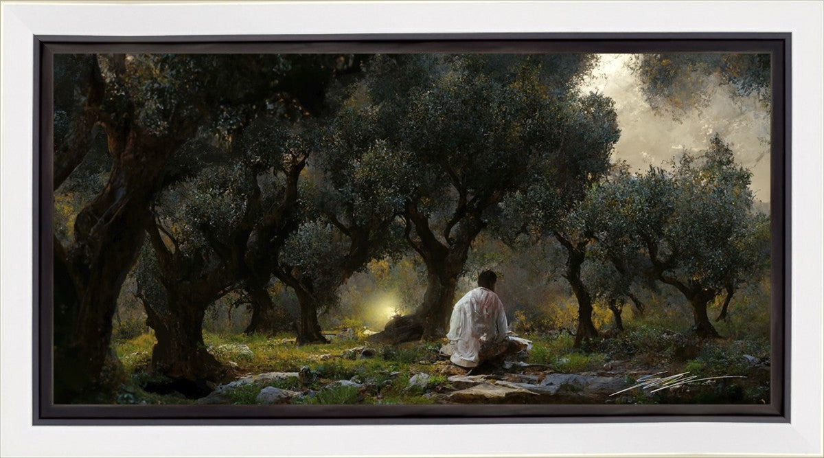 In the background, a dark olive tree with ripe black olives — Jesus being the tree is a reminder of the burden He carried alone. Yet beneath the press, amid the scene of suffering, stands a single white flower. That flower represents me—and you. We could only watch as He suffered, powerless to ease His burden. And yet, because of His suffering, we are made pure and clean - without any other spots. Isaiah 1:18 reminds us, "Though your sins are like scarlet, they shall be as white as snow." His atoning sacrifice means that no matter how stained or broken we are, we can always be restored to purity through Him.