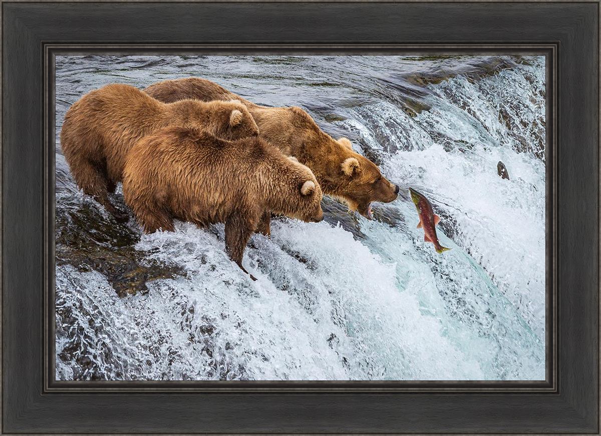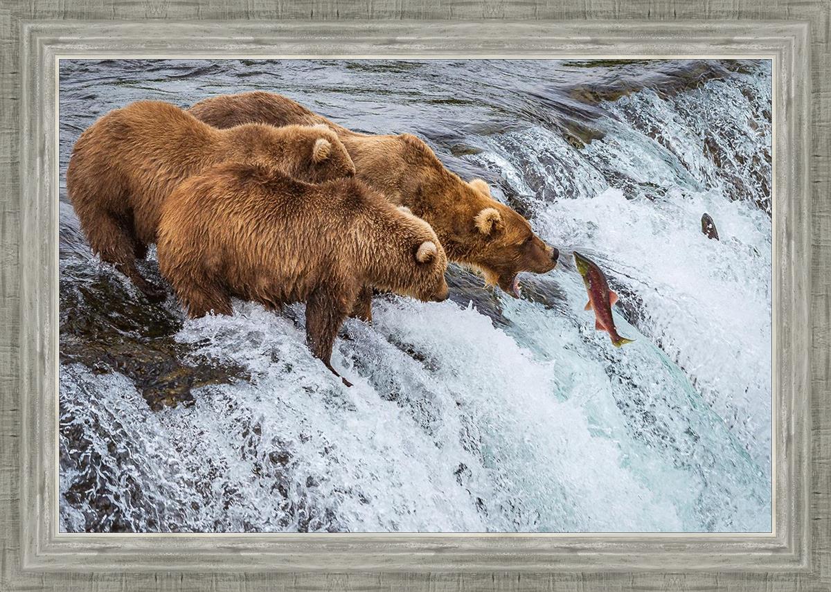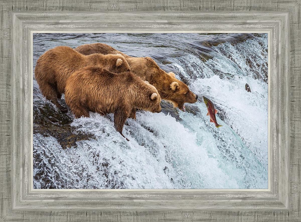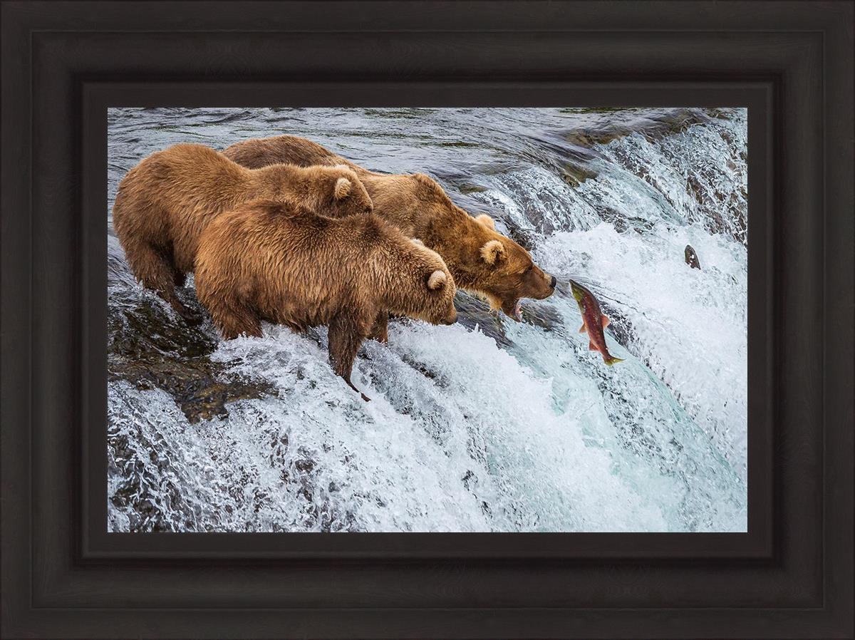 This image is amazing. Bears are generally solitary creatures. Capturing 3 together and seeing them not fighting but rather looking to be in awe of their meal, that is miraculous. The bright colors and vivid detail make me feel like I'm on the shore watching them myself.