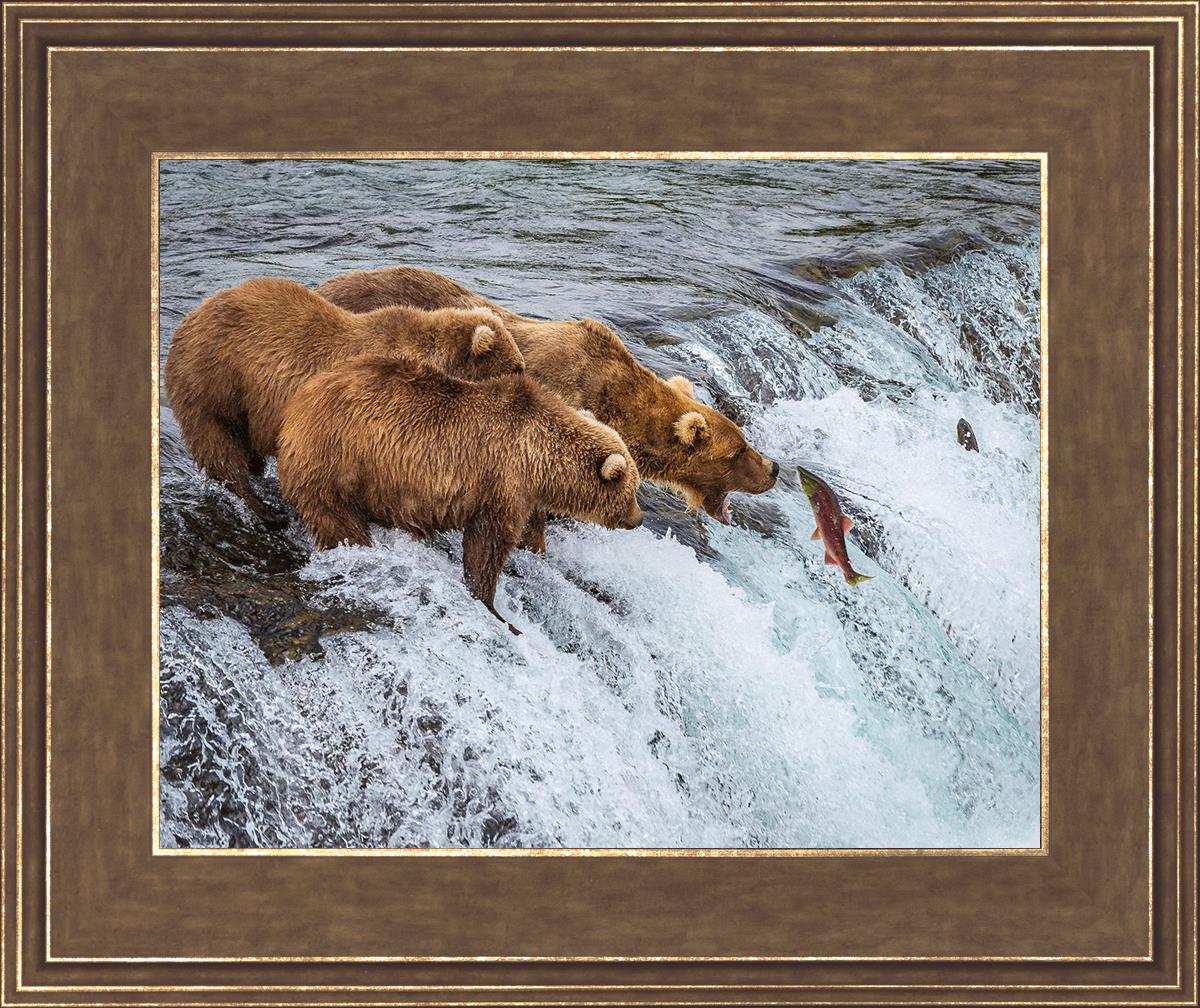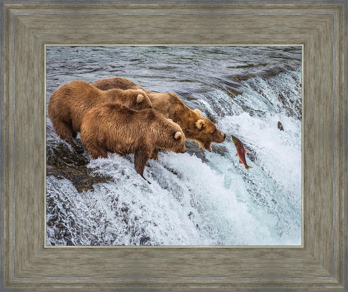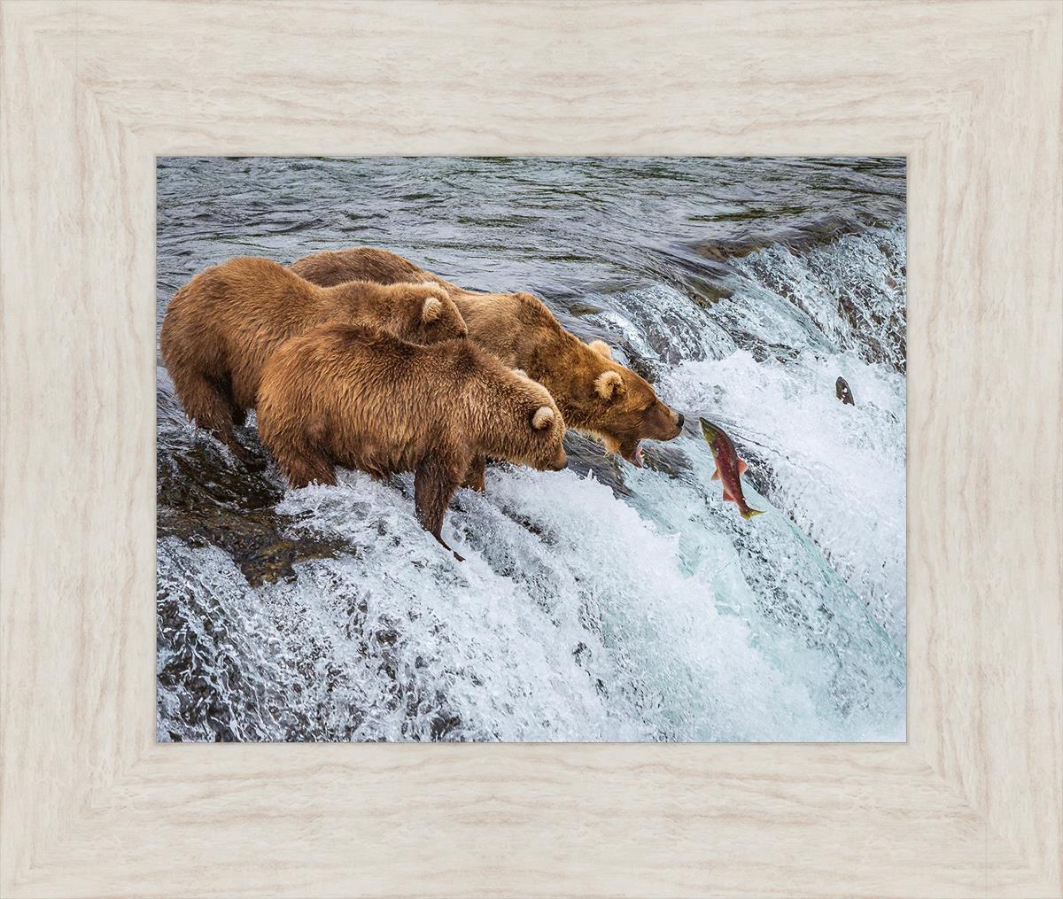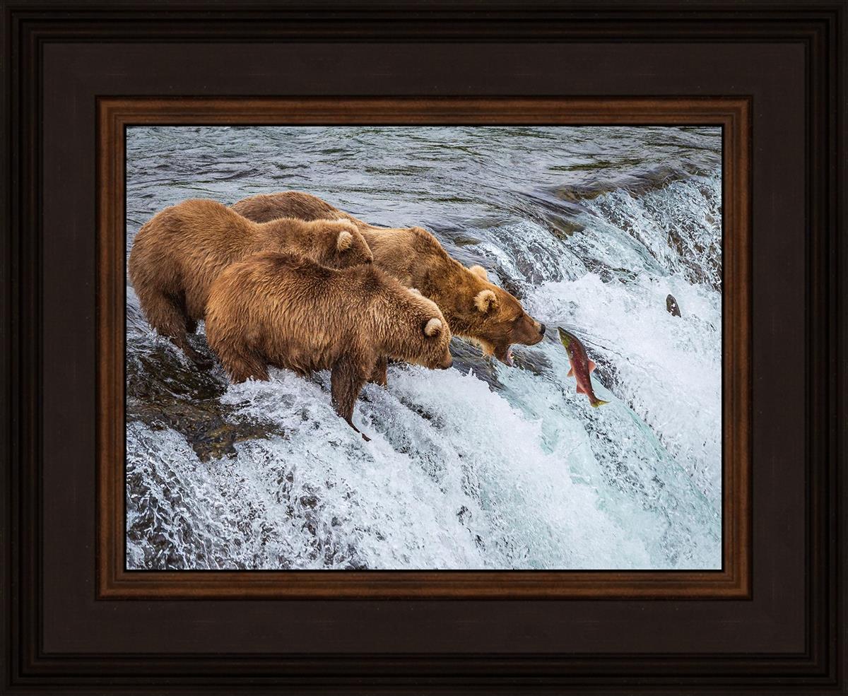 This image is amazing. Bears are generally solitary creatures. Capturing 3 together and seeing them not fighting but rather looking to be in awe of their meal, that is miraculous. The bright colors and vivid detail make me feel like I'm on the shore watching them myself.