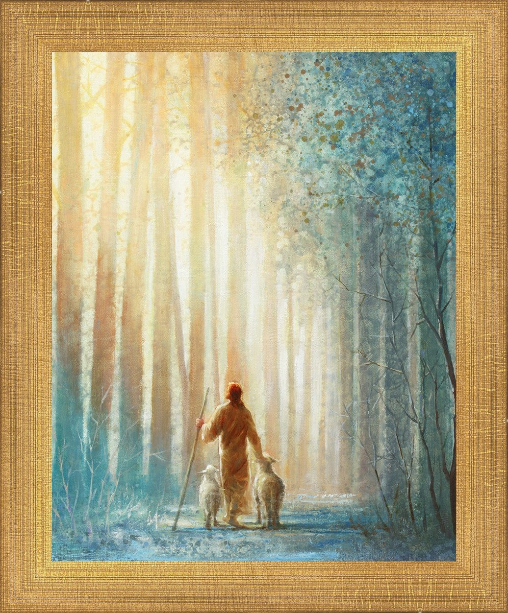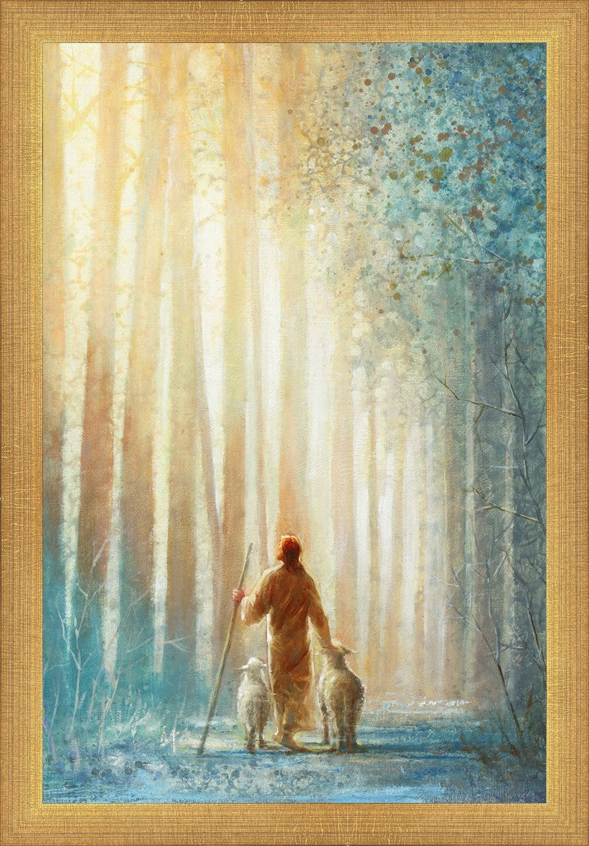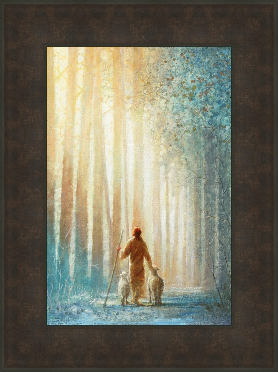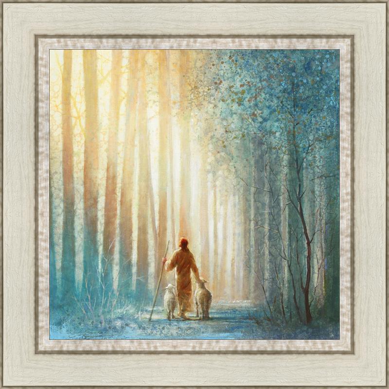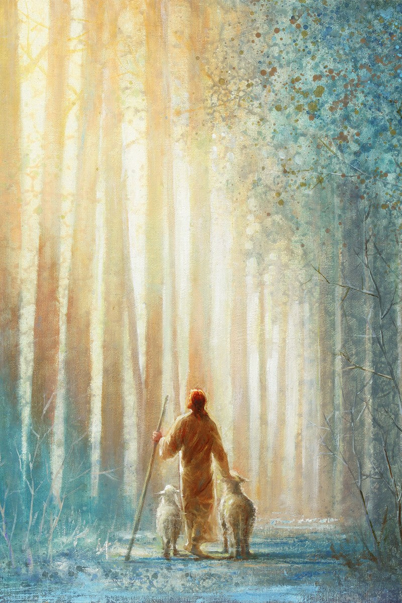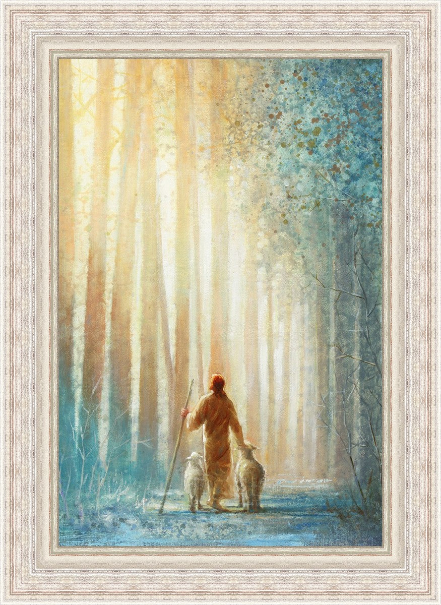He Leadeth Me is a painting by Yongsung Kim. This painting depicts Jesus walking down a trail with one of His sheep.