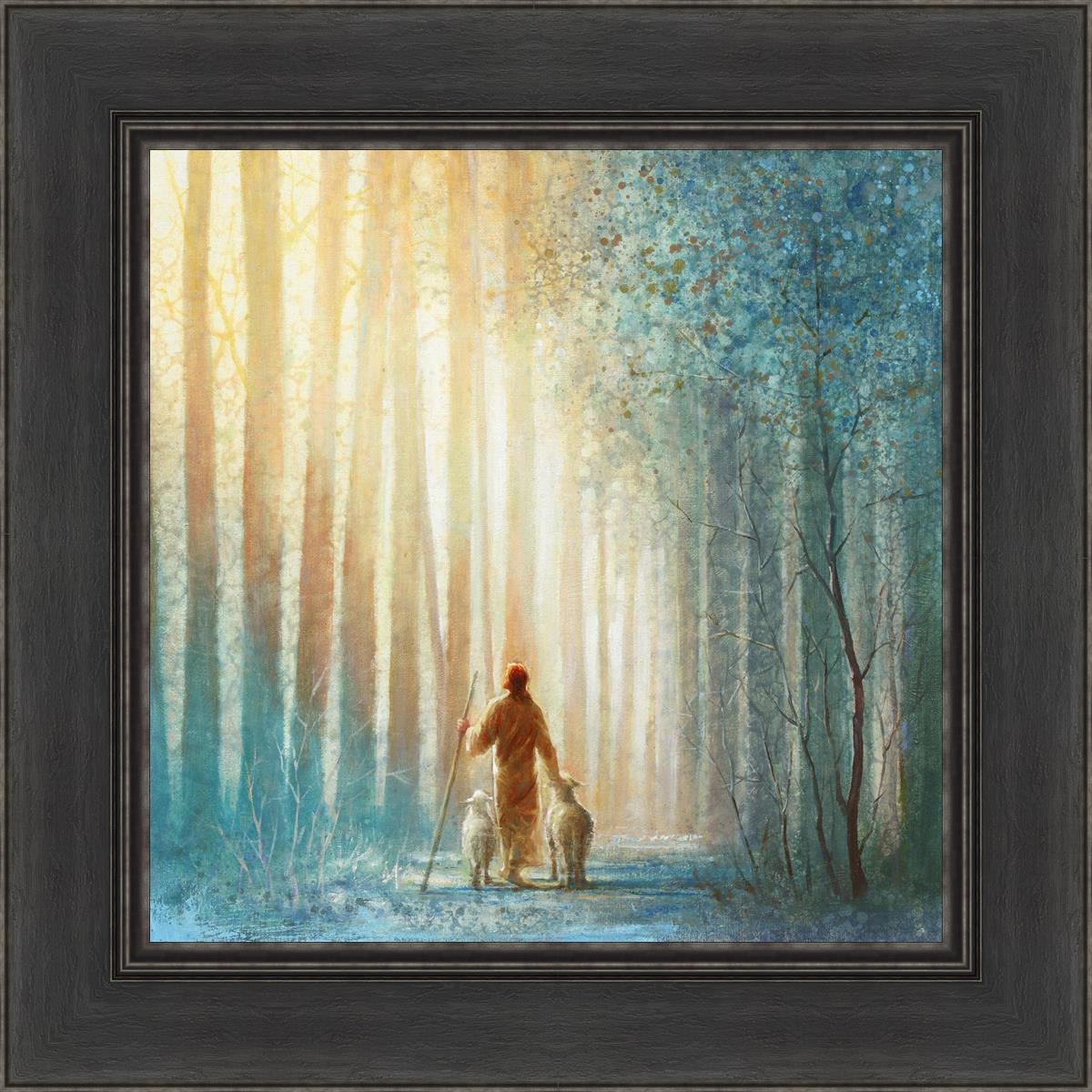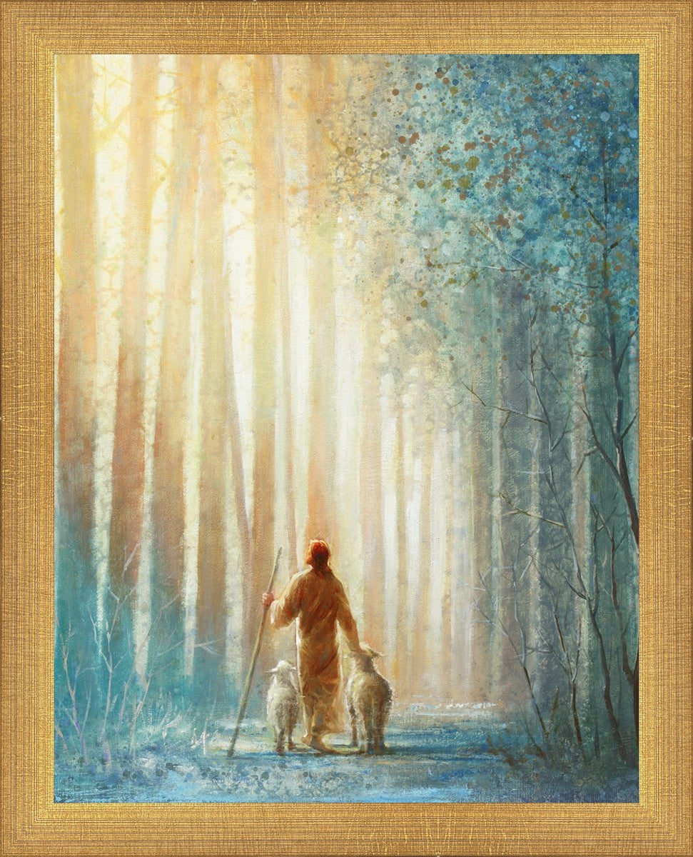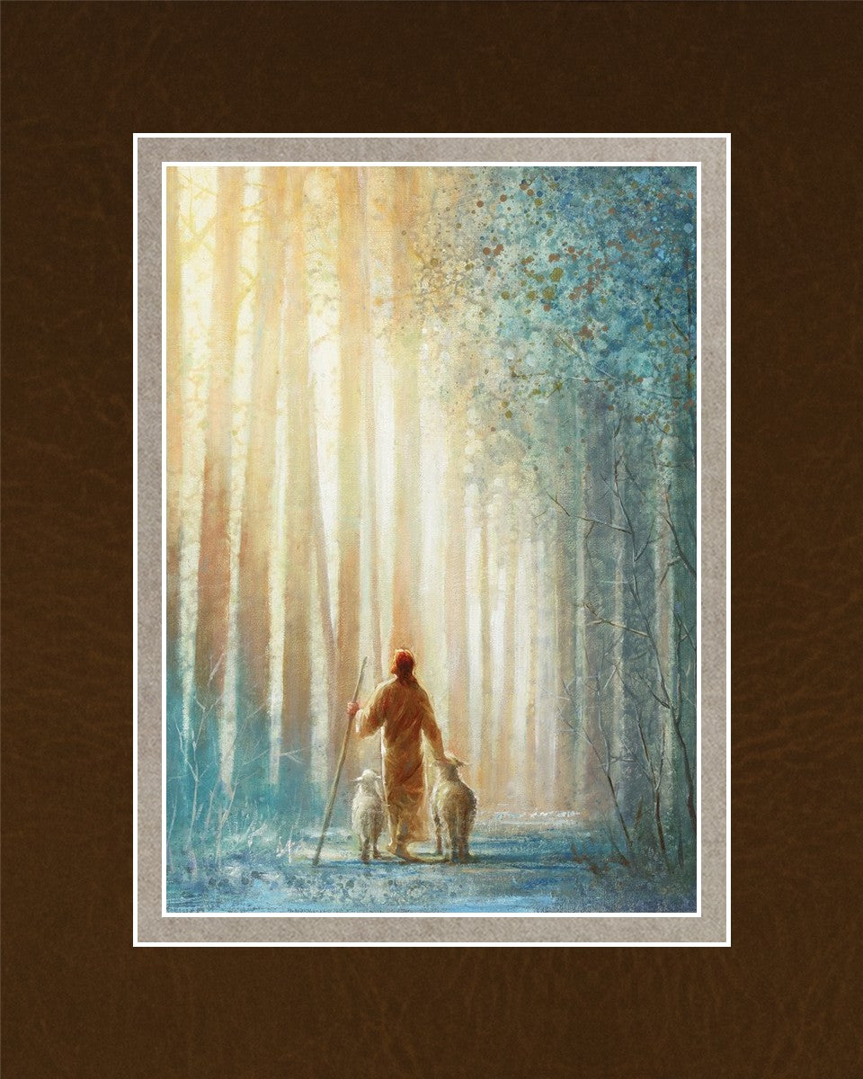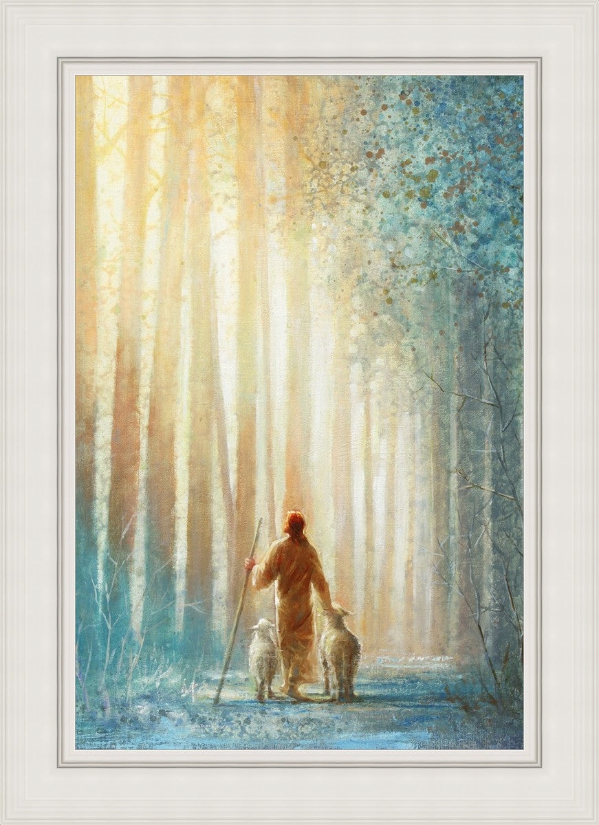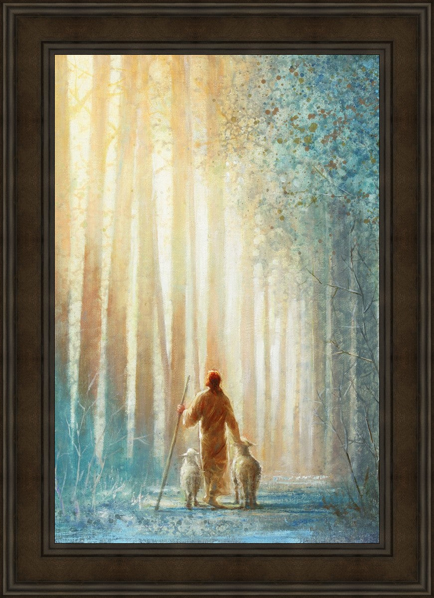 He Leadeth Me is a painting by Yongsung Kim. This painting depicts Jesus walking down a trail with one of His sheep.