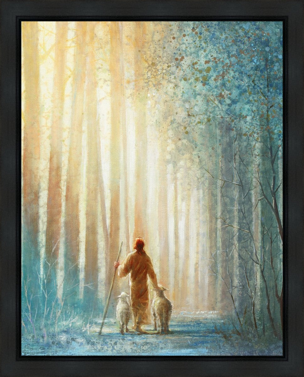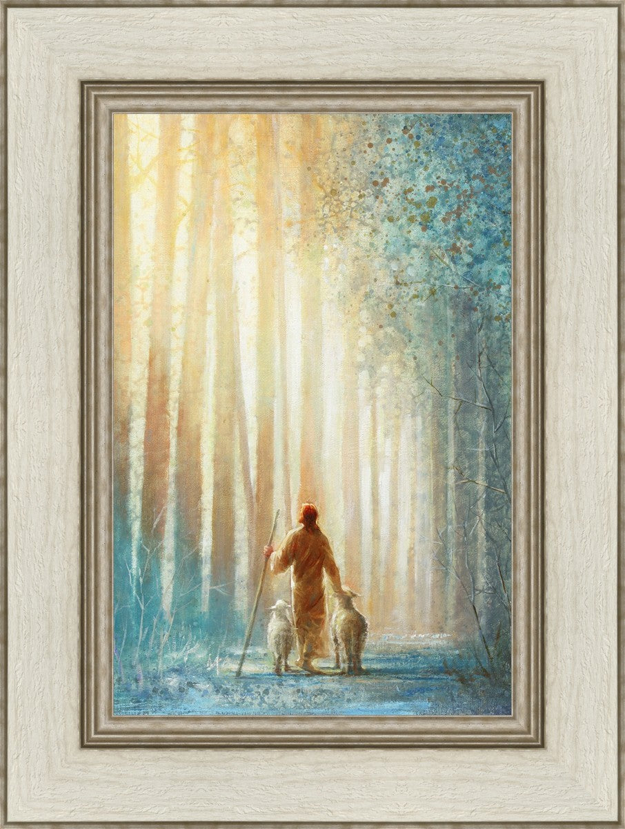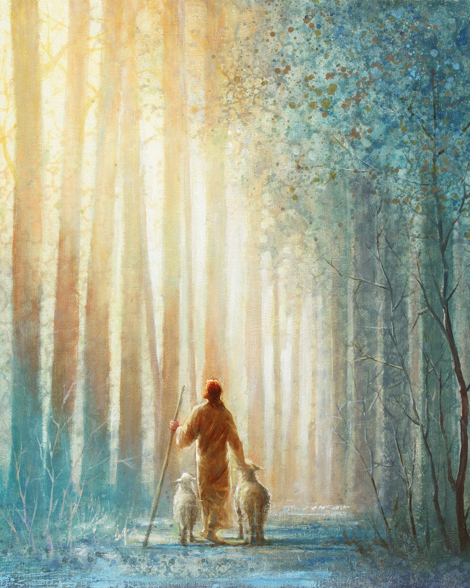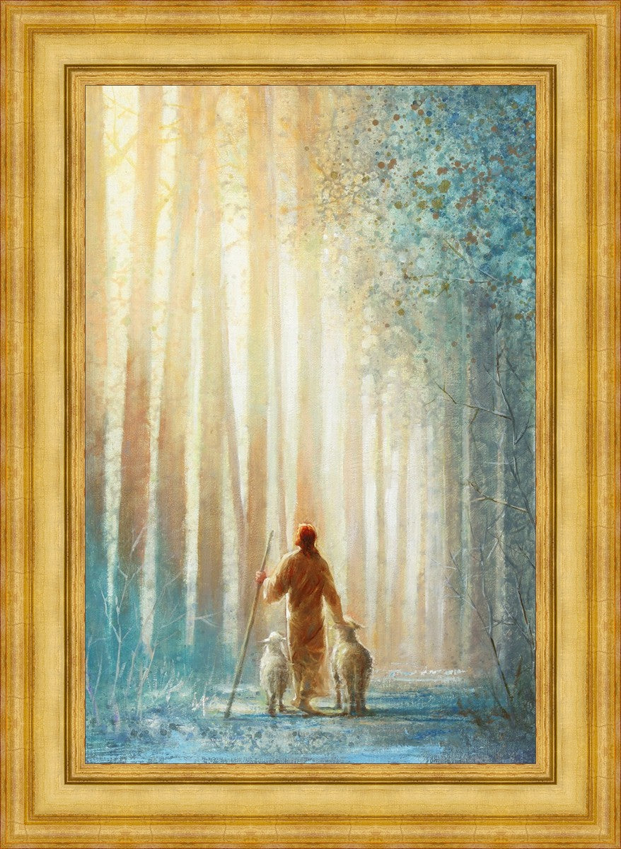 He Leadeth Me is a painting by Yongsung Kim. This painting depicts Jesus walking down a trail with one of His sheep.