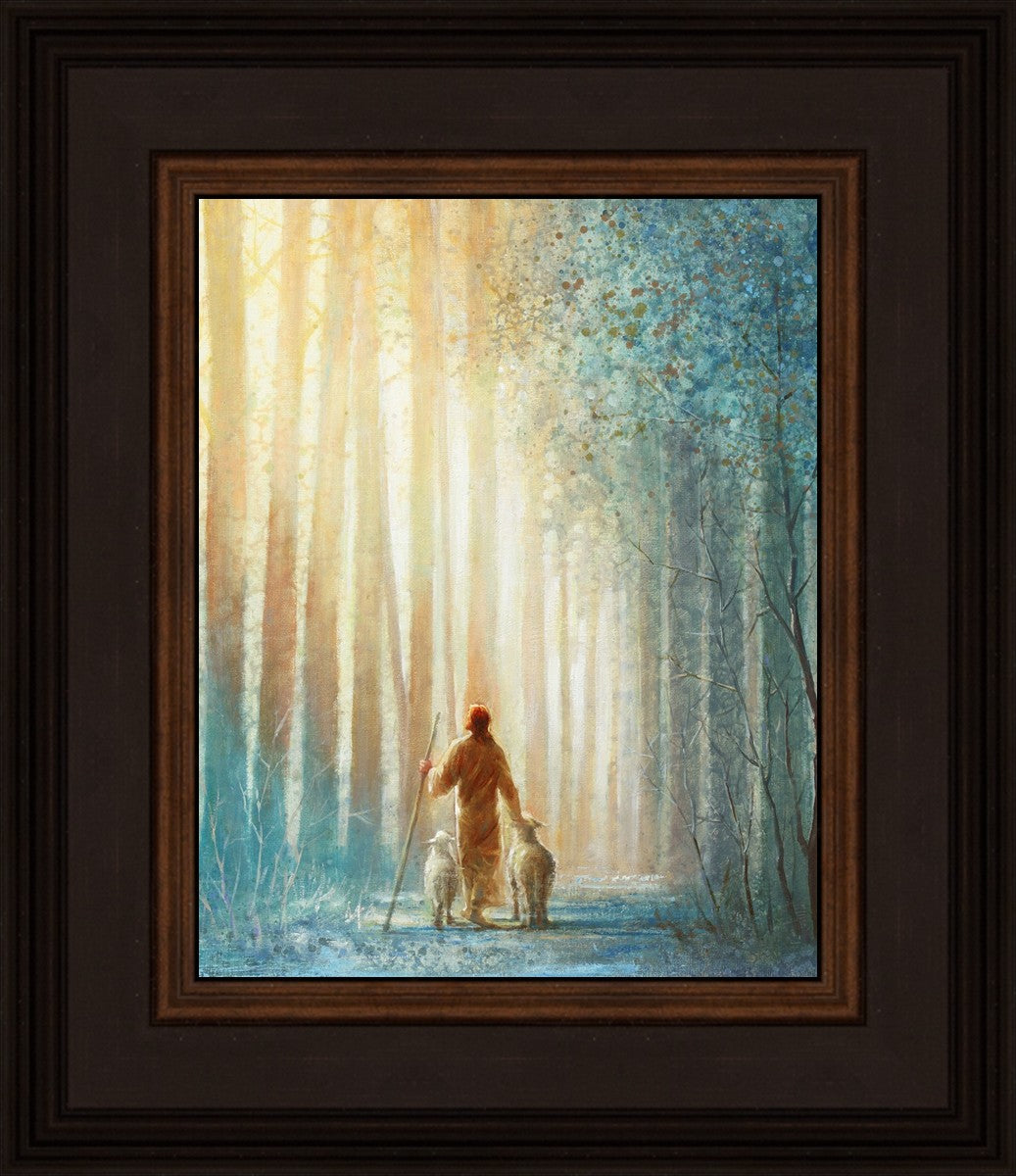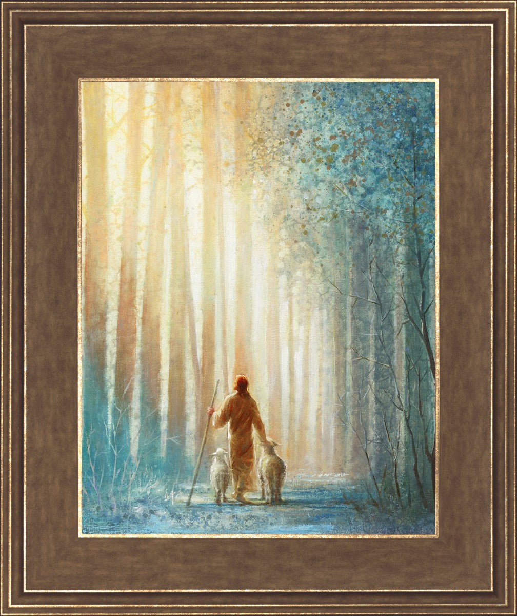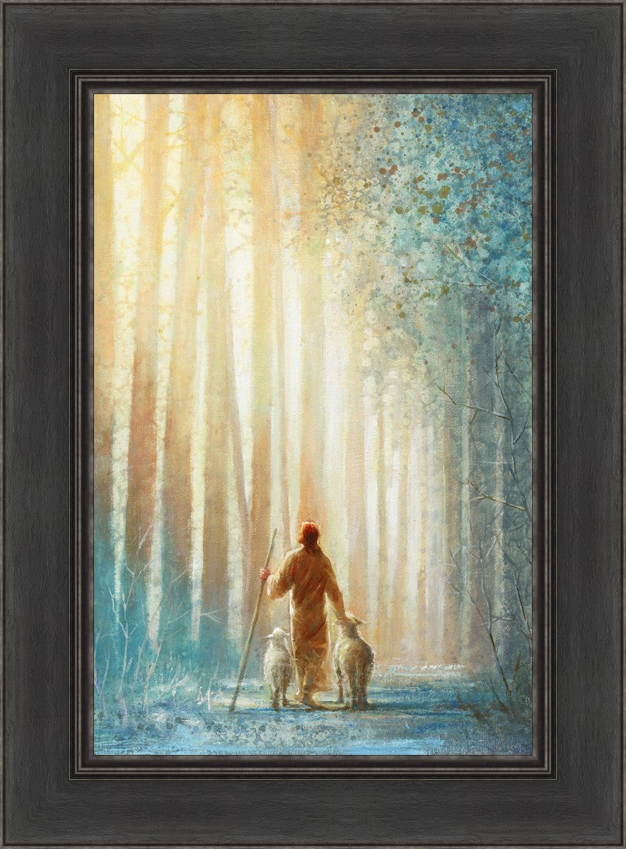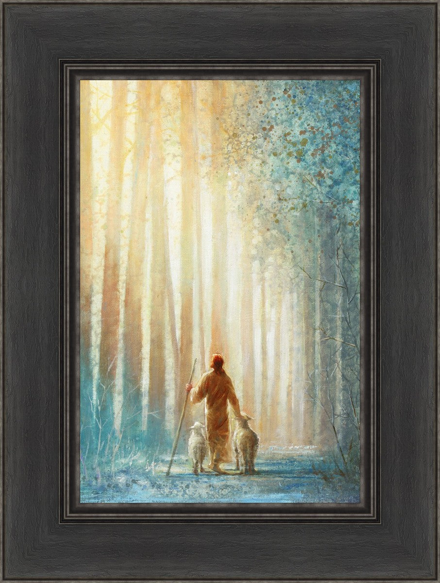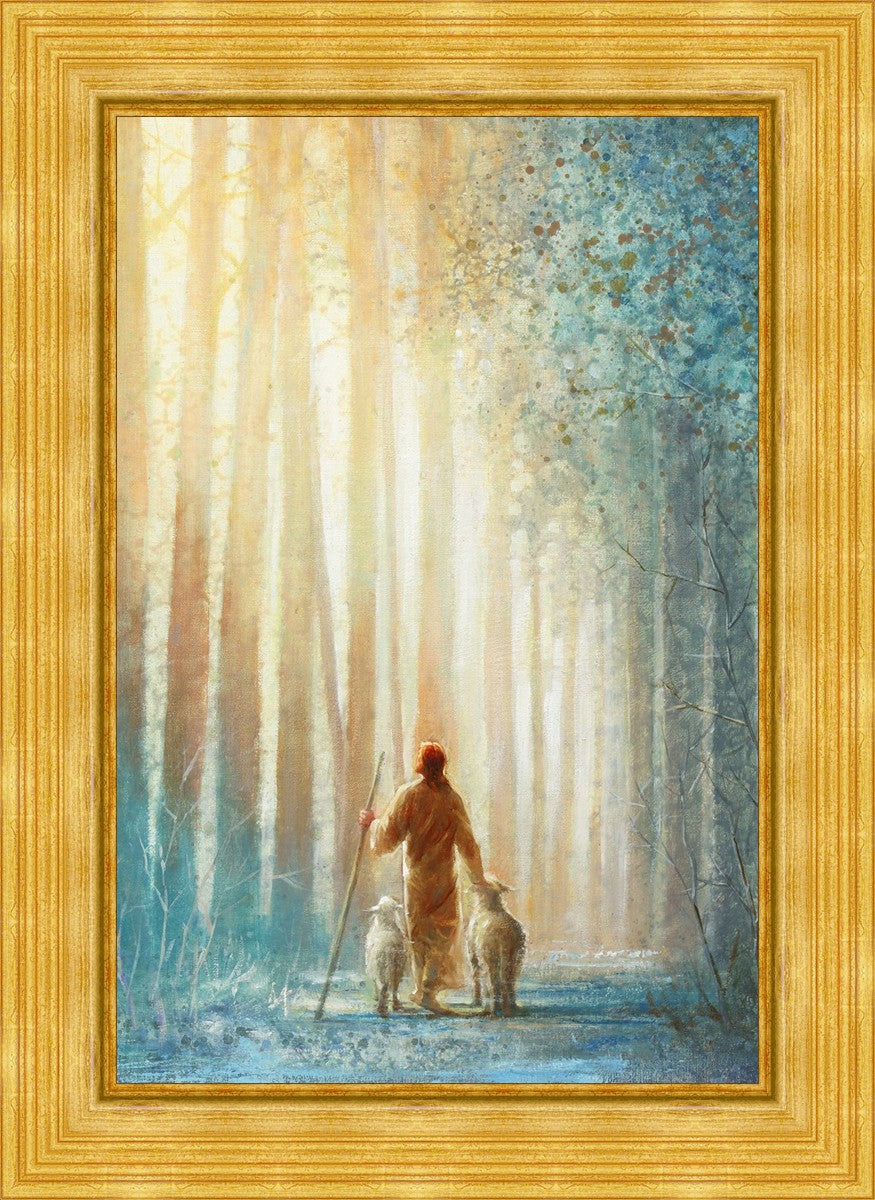 He Leadeth Me is a painting by Yongsung Kim. This painting depicts Jesus walking down a trail with one of His sheep.