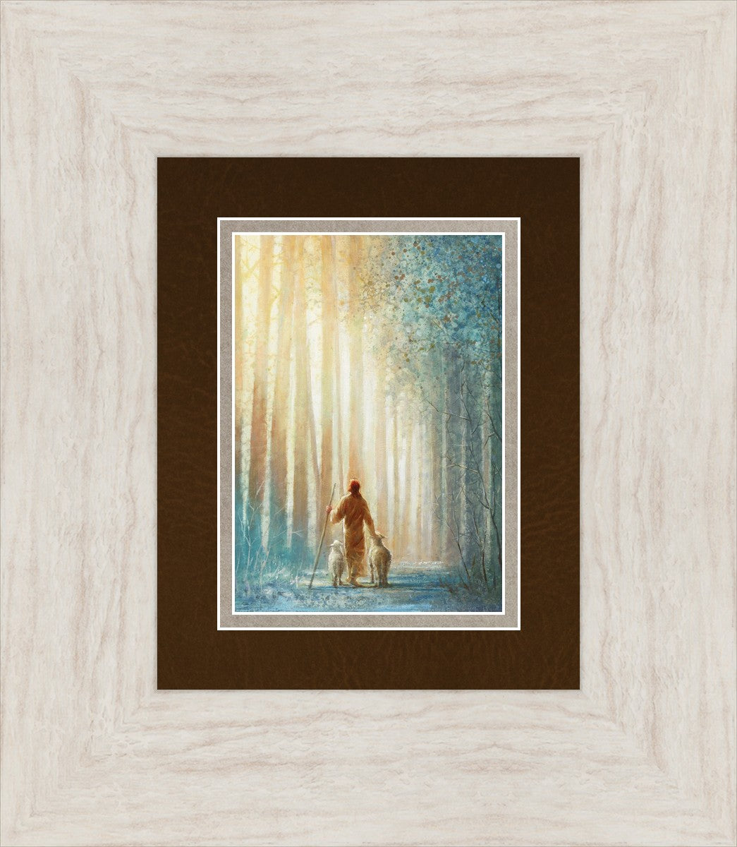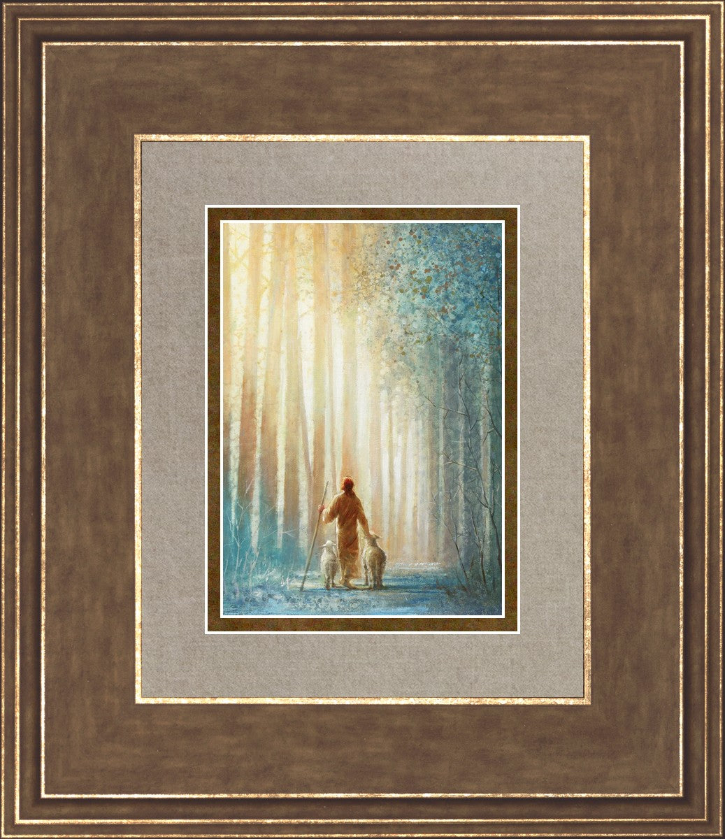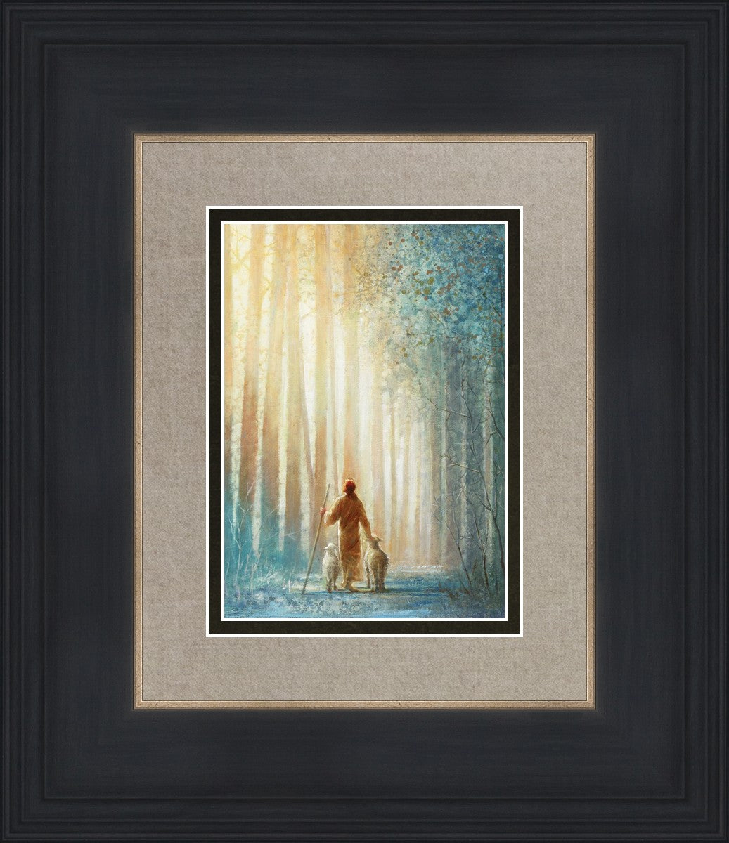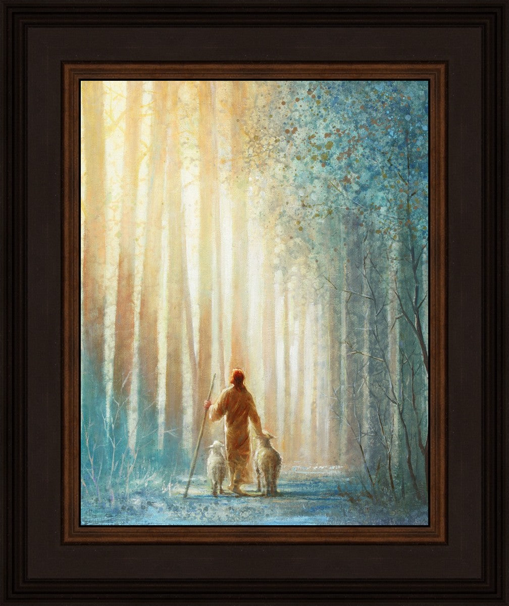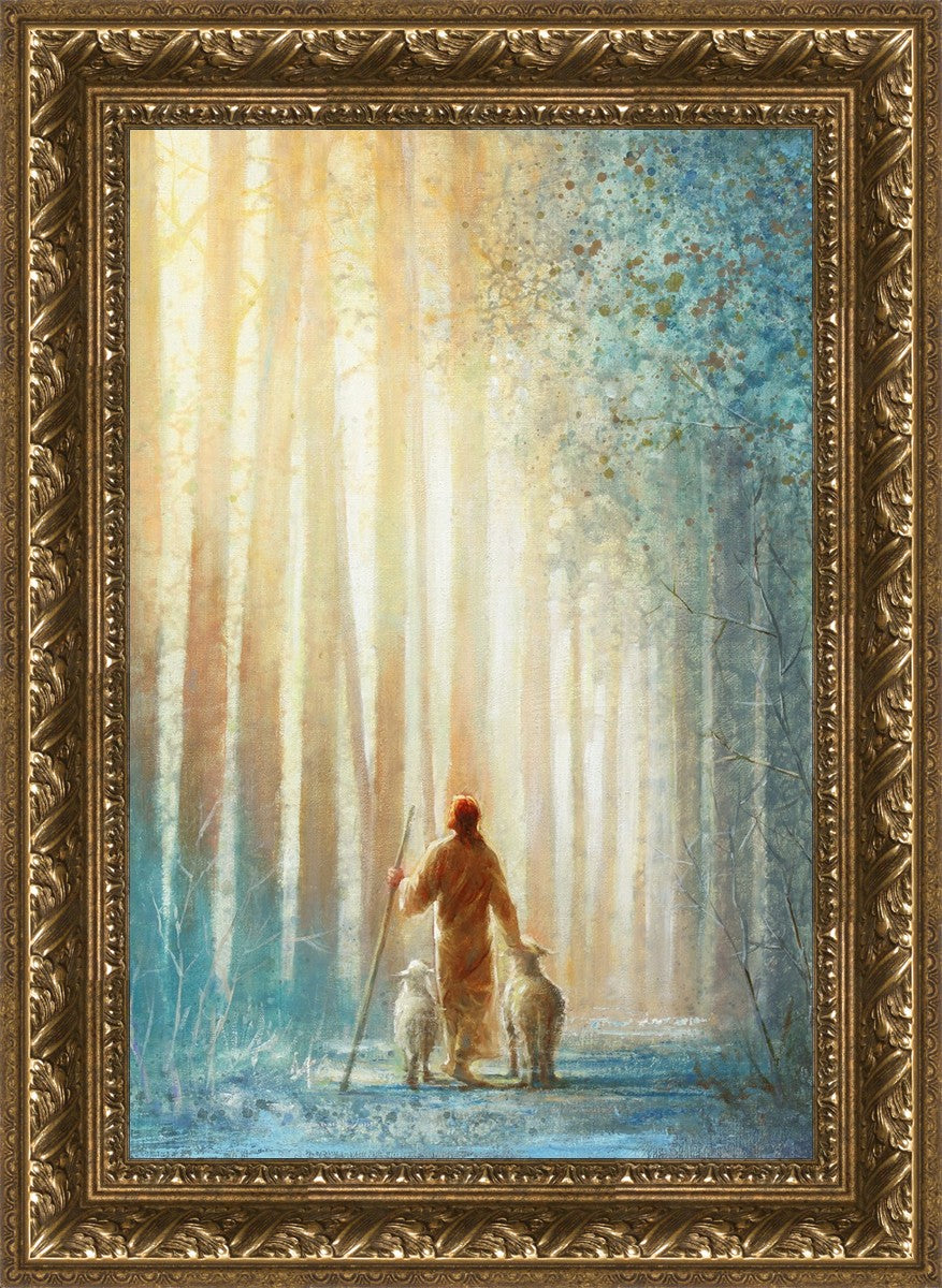 He Leadeth Me is a painting by Yongsung Kim. This painting depicts Jesus walking down a trail with one of His sheep.
