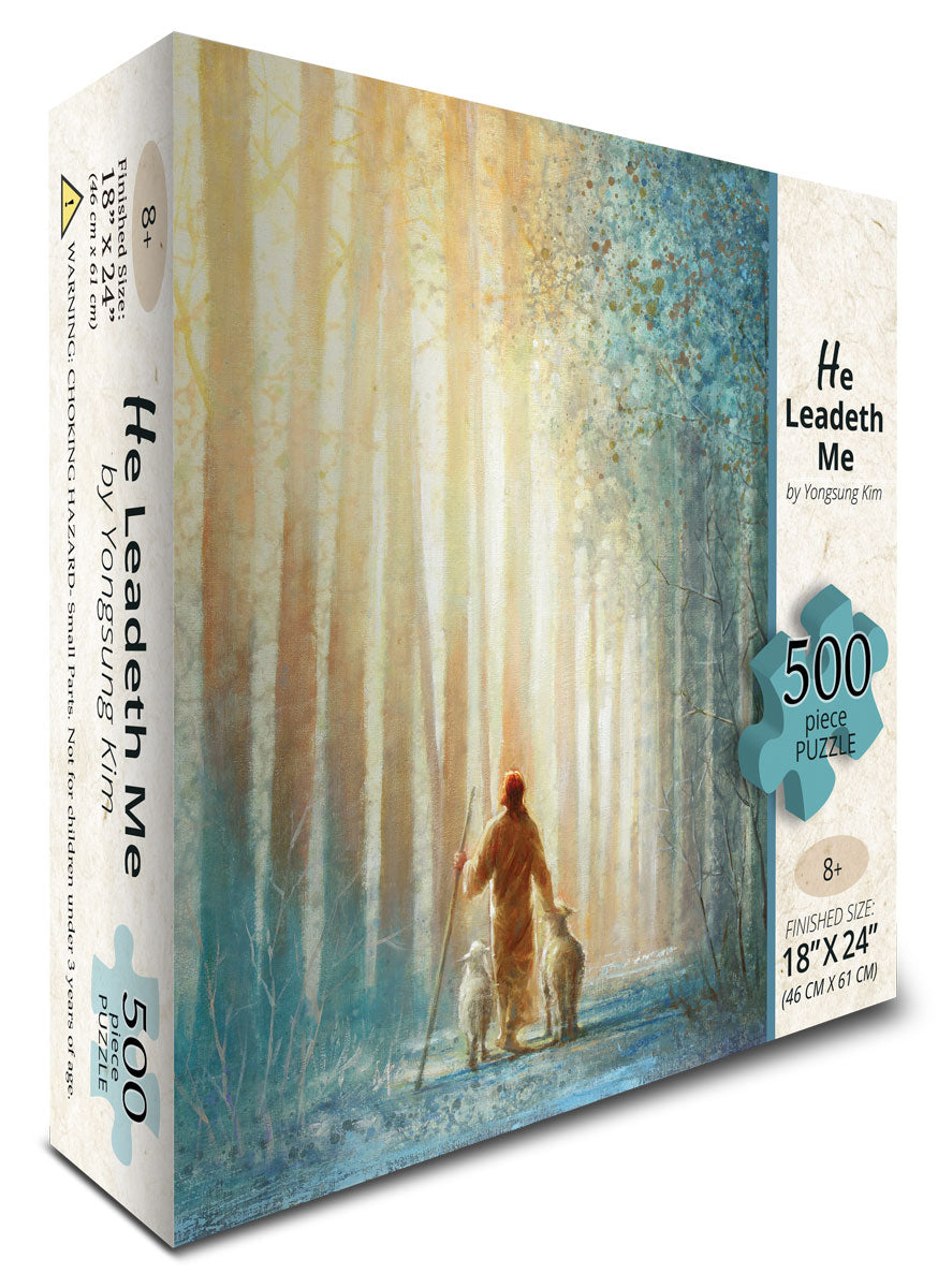 Experience the serene beauty of 'He Leadeth Me' by Yongsung Kim, a captivating puzzle featuring Christ guiding sheep through a forest pathway. This 500-piece puzzle measures 18"x24" and offers a fun, engaging activity for all ages.