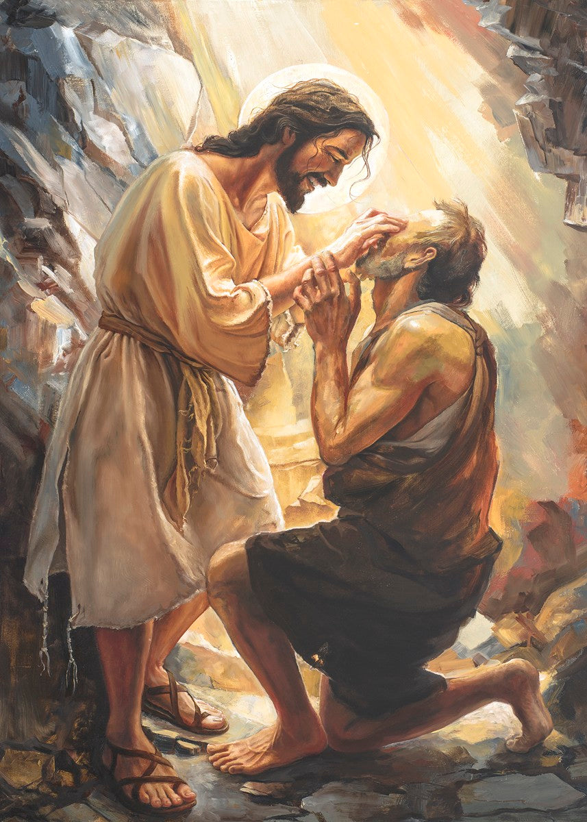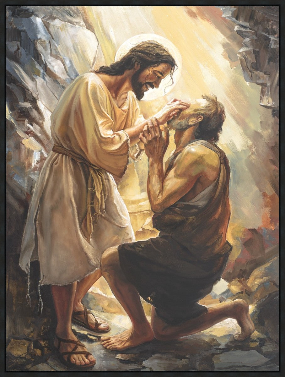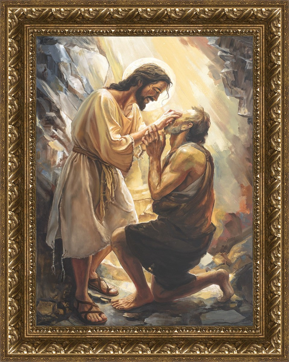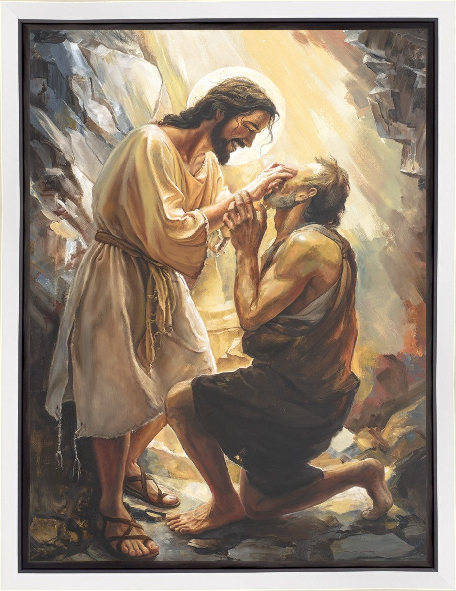 HEALED captures the profound moment when Christ restores sight to a blind man, symbolizing His unparalleled ability to bring clarity and redemption. This painting is not only a portrayal of physical healing but also a deeply personal reflection of my own journey. Before finding faith, I grappled with addiction for over a decade, experiencing a spiritual blindness that kept me distant from truth and honesty. Through my conversion to Christianity, I discovered the love and healing power of Christ, who, in His mercy, lifted the burdens that had weighed on me. This artwork stands as a testament to the transformation that is possible when we surrender our struggles to Him, acknowledging that true freedom can only be found in His embrace.
