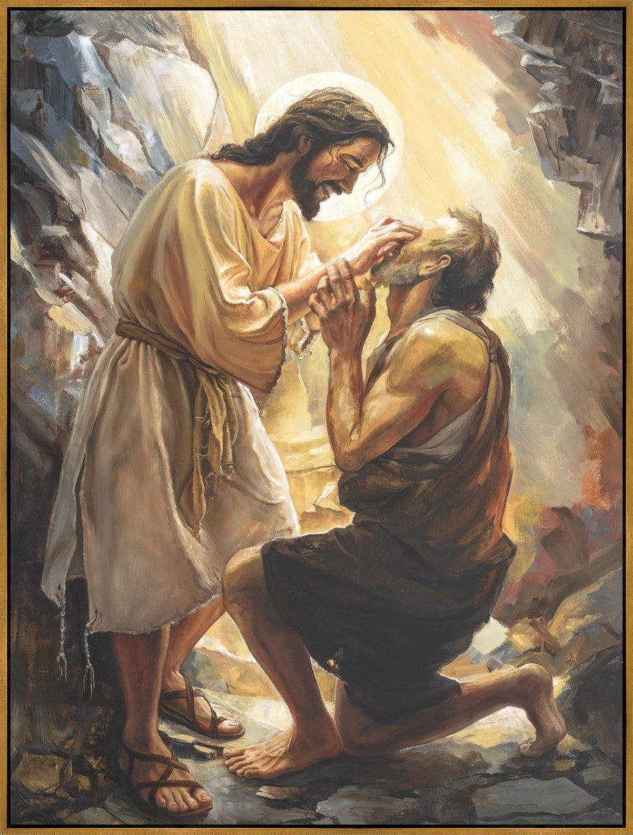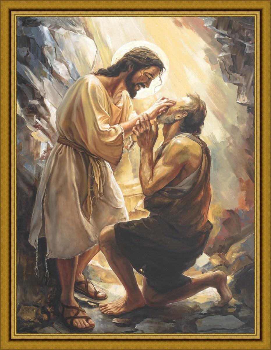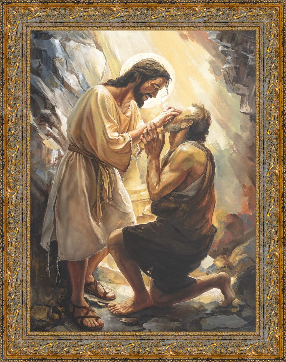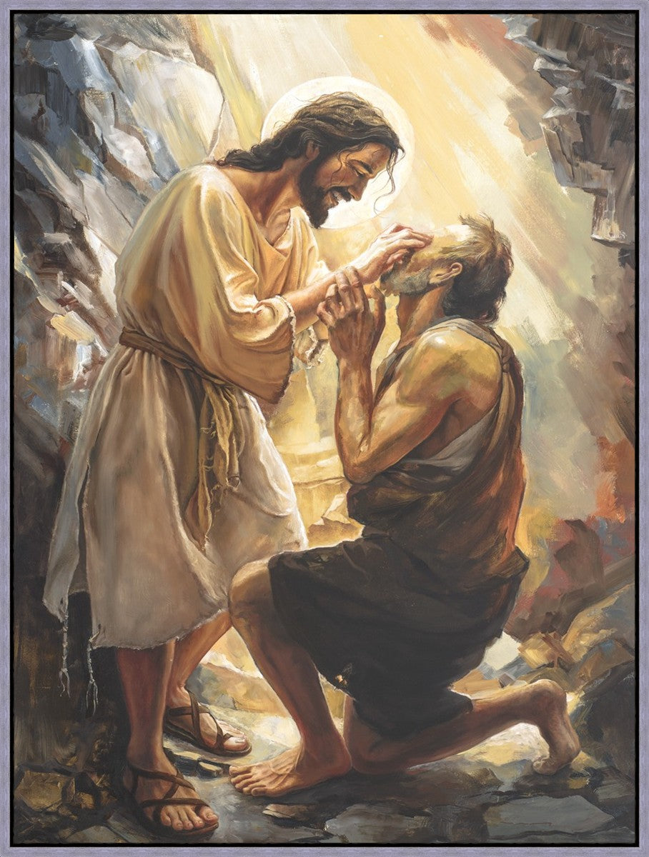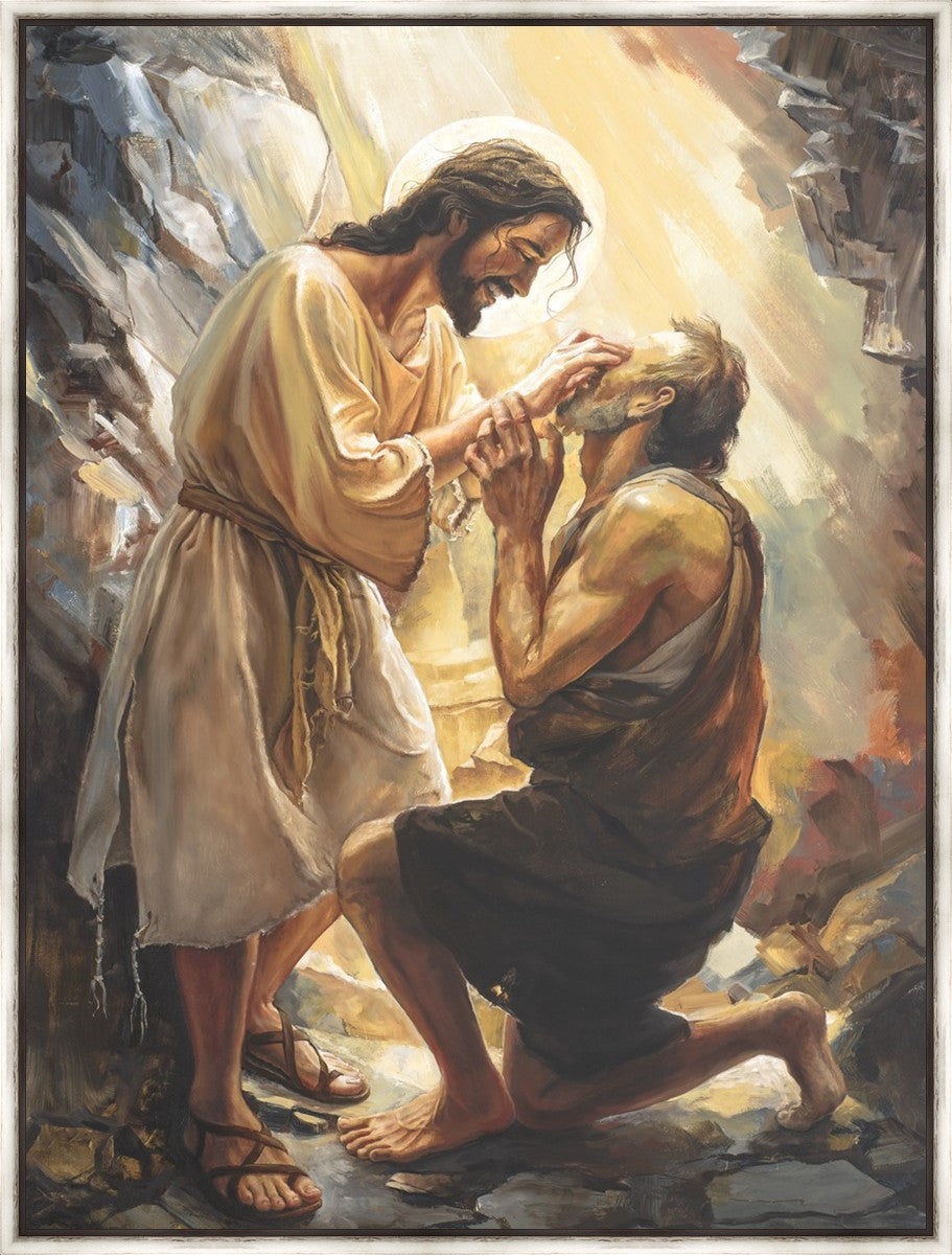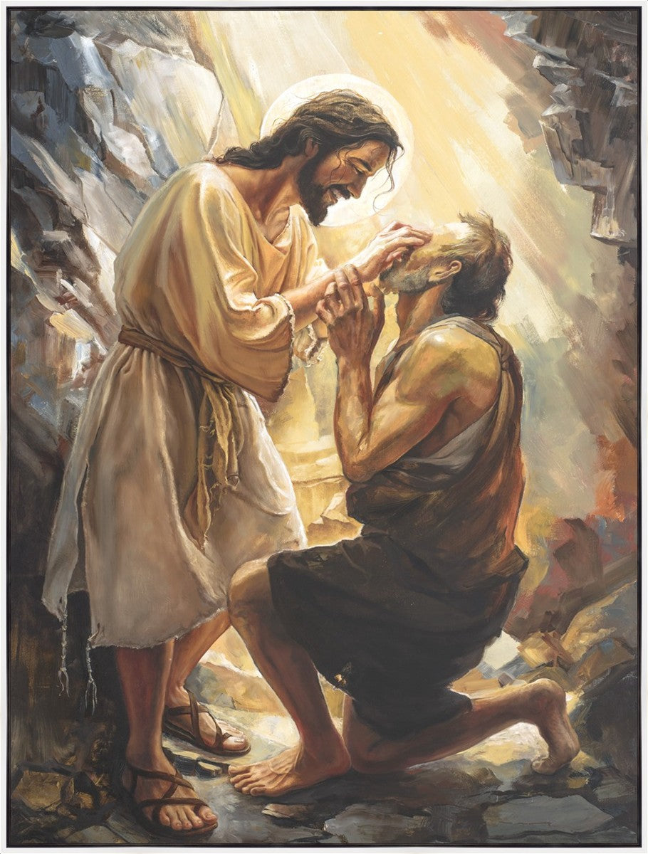 This piece employs high contrast to emphasize Christ's act of healing, drawing the viewer’s attention to the transformative moment. The warm color palette, reminiscent of the Blood of Christ, symbolizes the life and healing He brings to those who bow before Him in faith, petitioning for His blessing. Set deep within a cavernous hole, the scene conveys the experience of being trapped in addiction, sin, and self-deception. The background, painted with bold brushstrokes and rich impasto texture, reflects the chaos and darkness of this entrapment, while the hands and faces are rendered with a gentler, more detailed touch. Christ’s presence illuminates the scene, symbolizing that He alone can descend into our darkness, light the way, and show us the path to freedom.