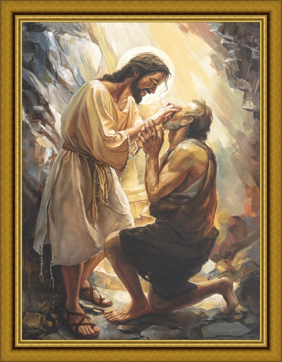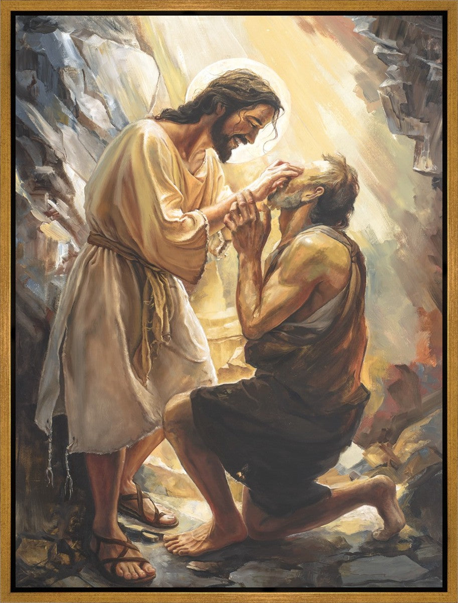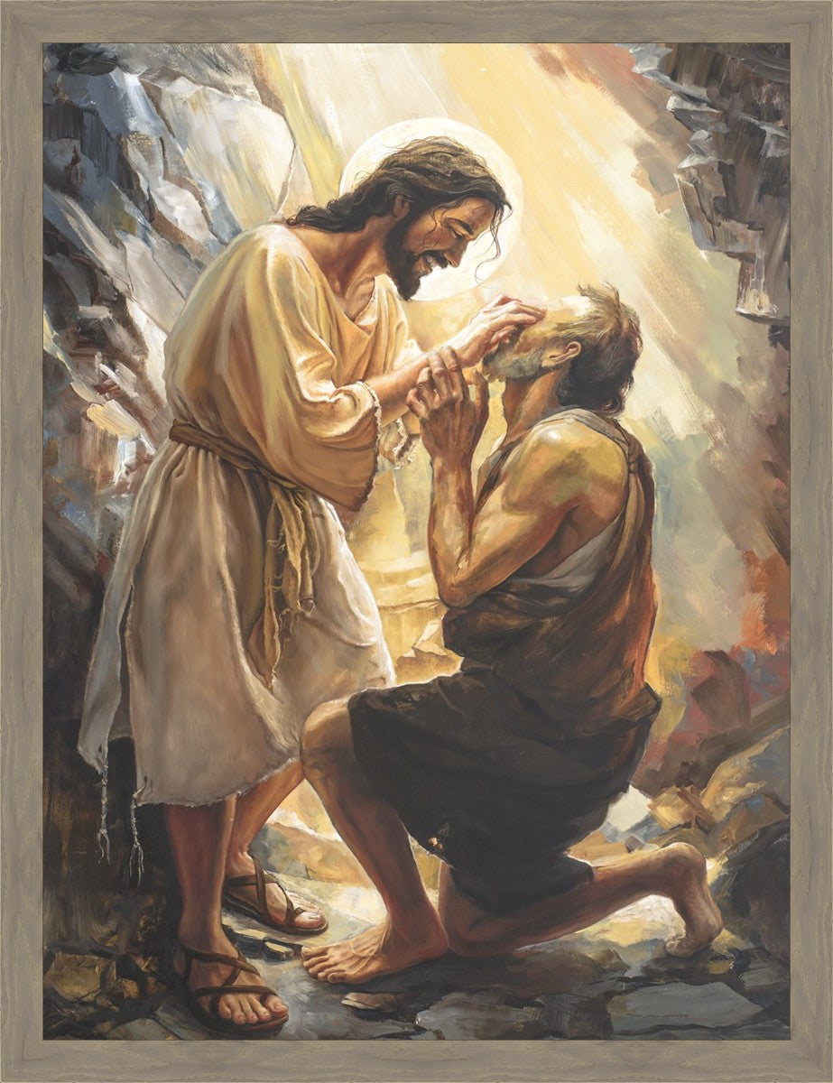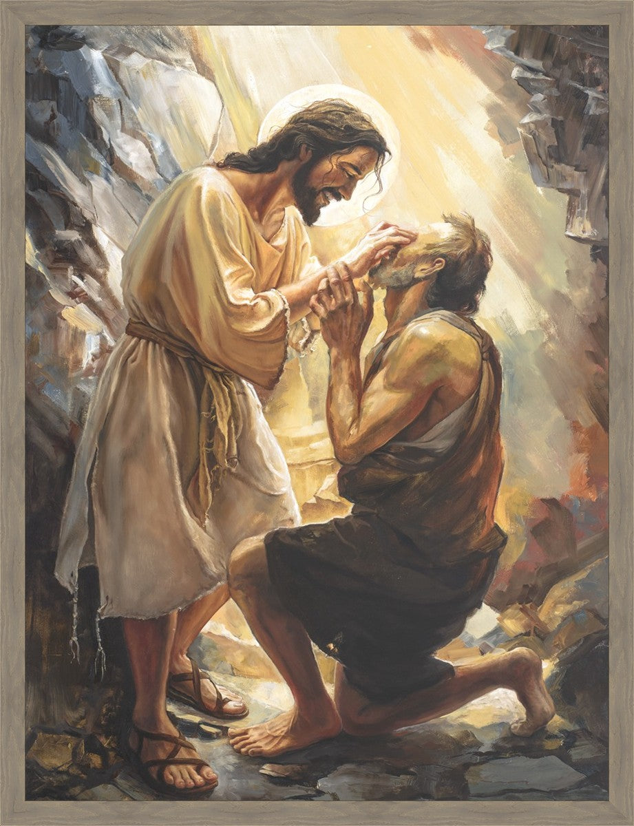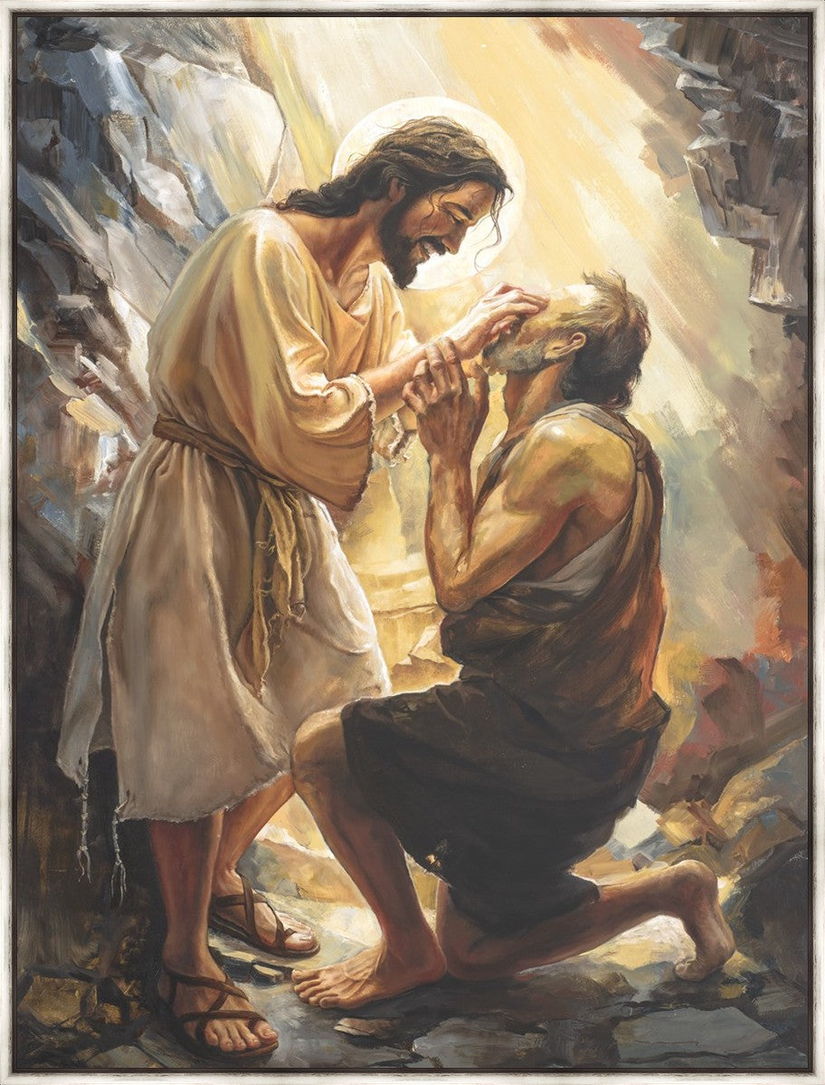 This piece employs high contrast to emphasize Christ's act of healing, drawing the viewer’s attention to the transformative moment. The warm color palette, reminiscent of the Blood of Christ, symbolizes the life and healing He brings to those who bow before Him in faith, petitioning for His blessing. Set deep within a cavernous hole, the scene conveys the experience of being trapped in addiction, sin, and self-deception. The background, painted with bold brushstrokes and rich impasto texture, reflects the chaos and darkness of this entrapment, while the hands and faces are rendered with a gentler, more detailed touch. Christ’s presence illuminates the scene, symbolizing that He alone can descend into our darkness, light the way, and show us the path to freedom.