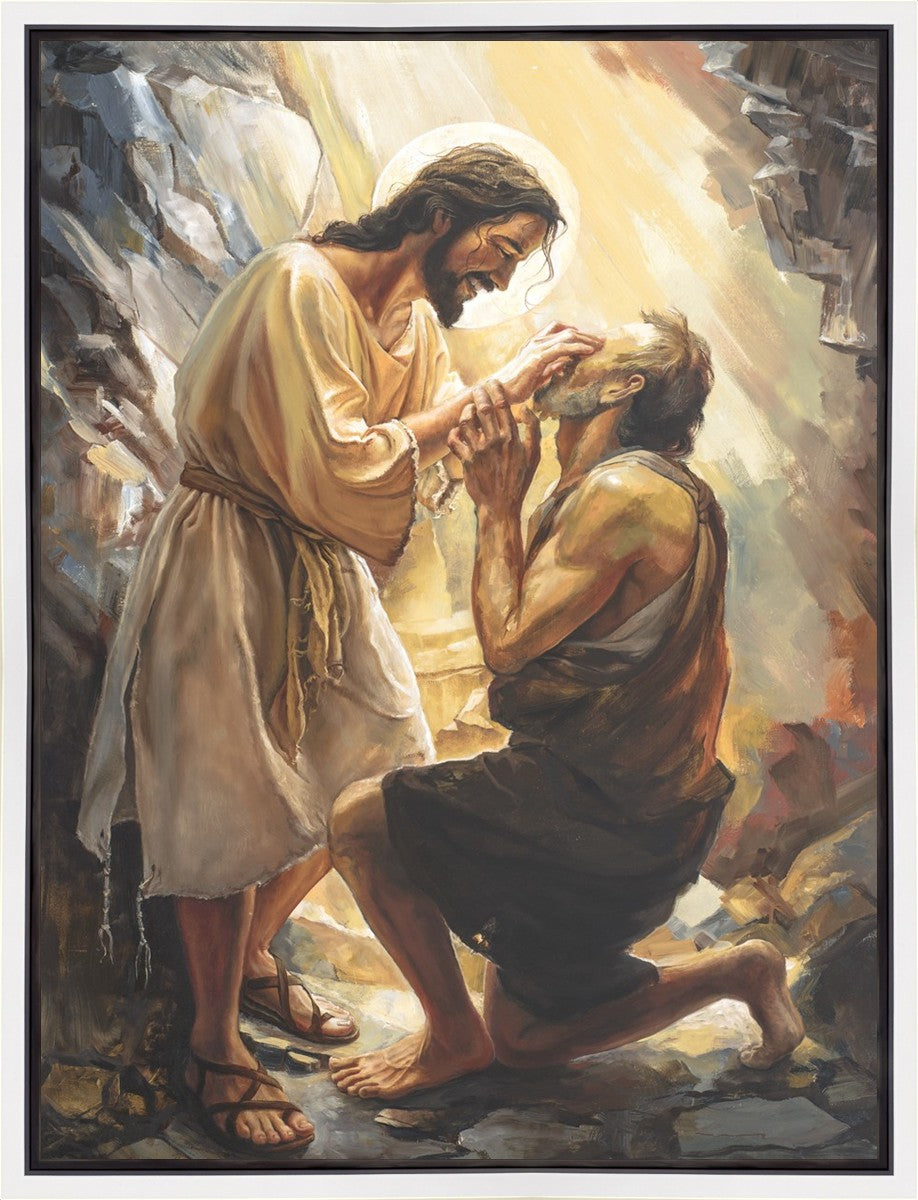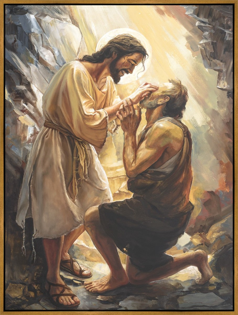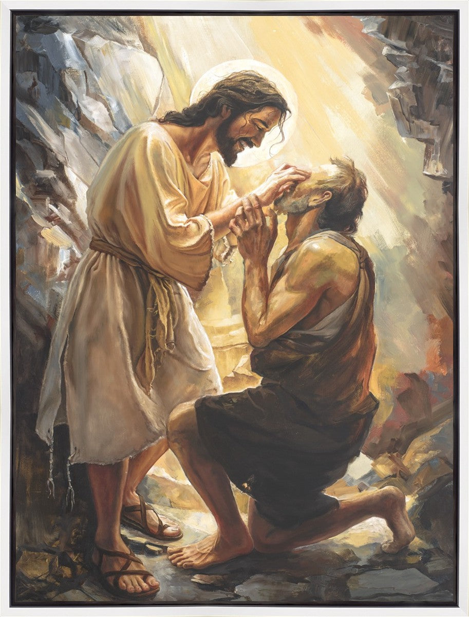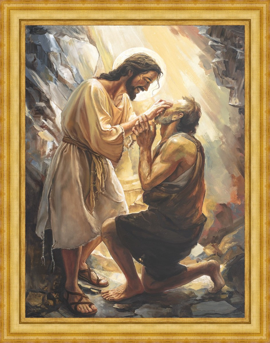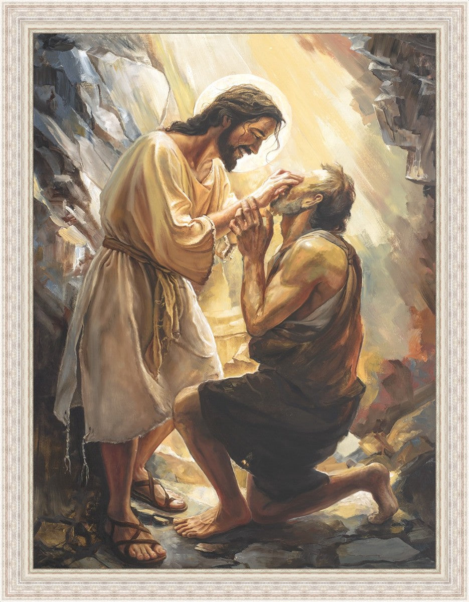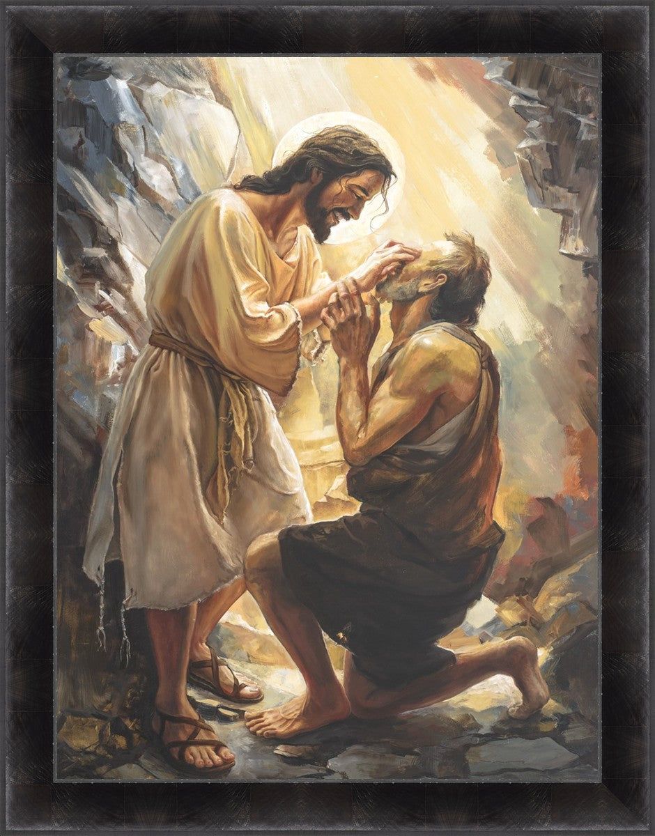 This piece employs high contrast to emphasize Christ's act of healing, drawing the viewer’s attention to the transformative moment. The warm color palette, reminiscent of the Blood of Christ, symbolizes the life and healing He brings to those who bow before Him in faith, petitioning for His blessing. Set deep within a cavernous hole, the scene conveys the experience of being trapped in addiction, sin, and self-deception. The background, painted with bold brushstrokes and rich impasto texture, reflects the chaos and darkness of this entrapment, while the hands and faces are rendered with a gentler, more detailed touch. Christ’s presence illuminates the scene, symbolizing that He alone can descend into our darkness, light the way, and show us the path to freedom.