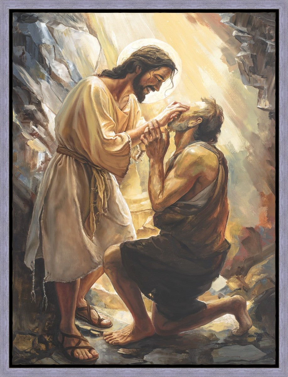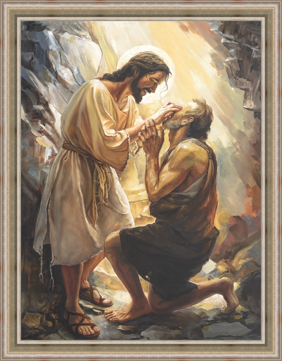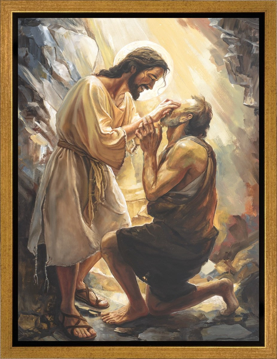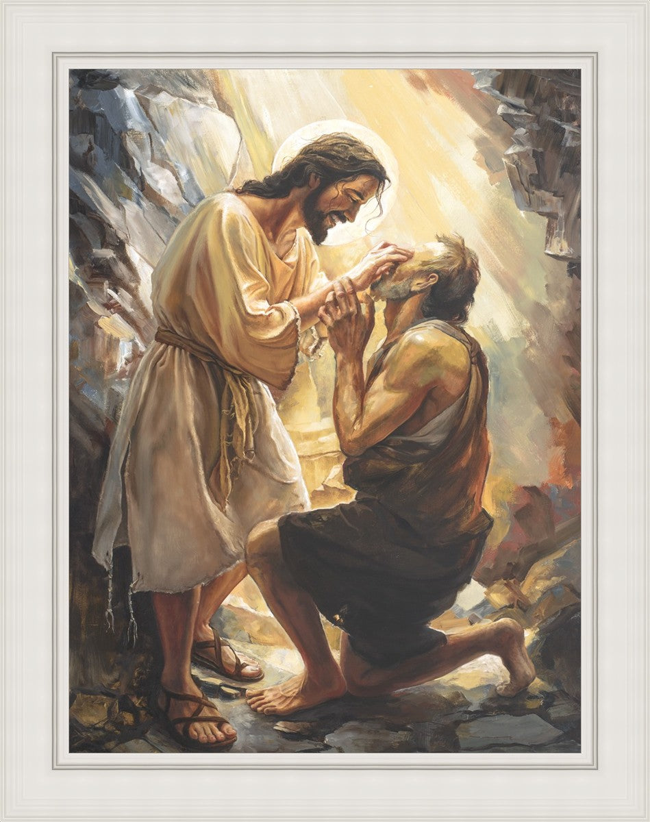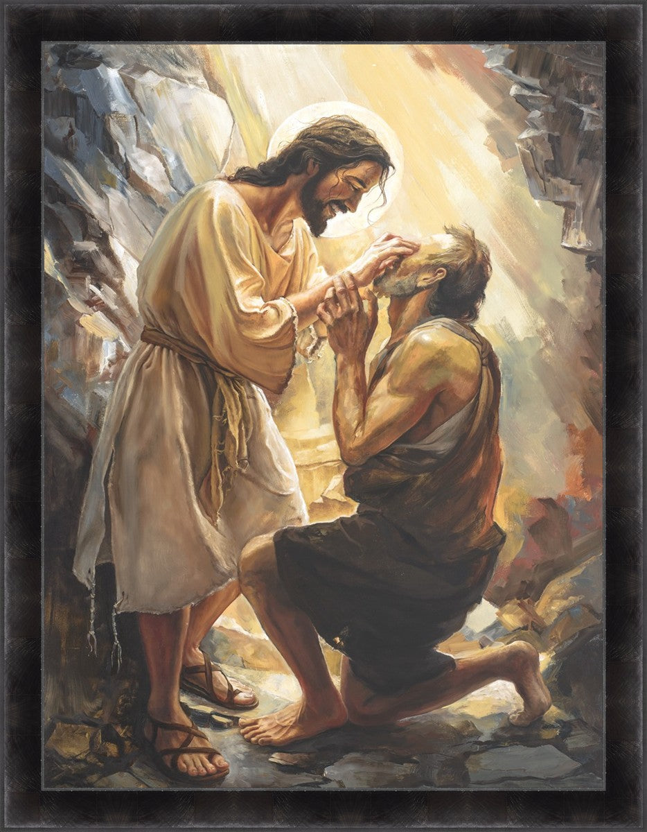 This piece employs high contrast to emphasize Christ's act of healing, drawing the viewer’s attention to the transformative moment. The warm color palette, reminiscent of the Blood of Christ, symbolizes the life and healing He brings to those who bow before Him in faith, petitioning for His blessing. Set deep within a cavernous hole, the scene conveys the experience of being trapped in addiction, sin, and self-deception. The background, painted with bold brushstrokes and rich impasto texture, reflects the chaos and darkness of this entrapment, while the hands and faces are rendered with a gentler, more detailed touch. Christ’s presence illuminates the scene, symbolizing that He alone can descend into our darkness, light the way, and show us the path to freedom.