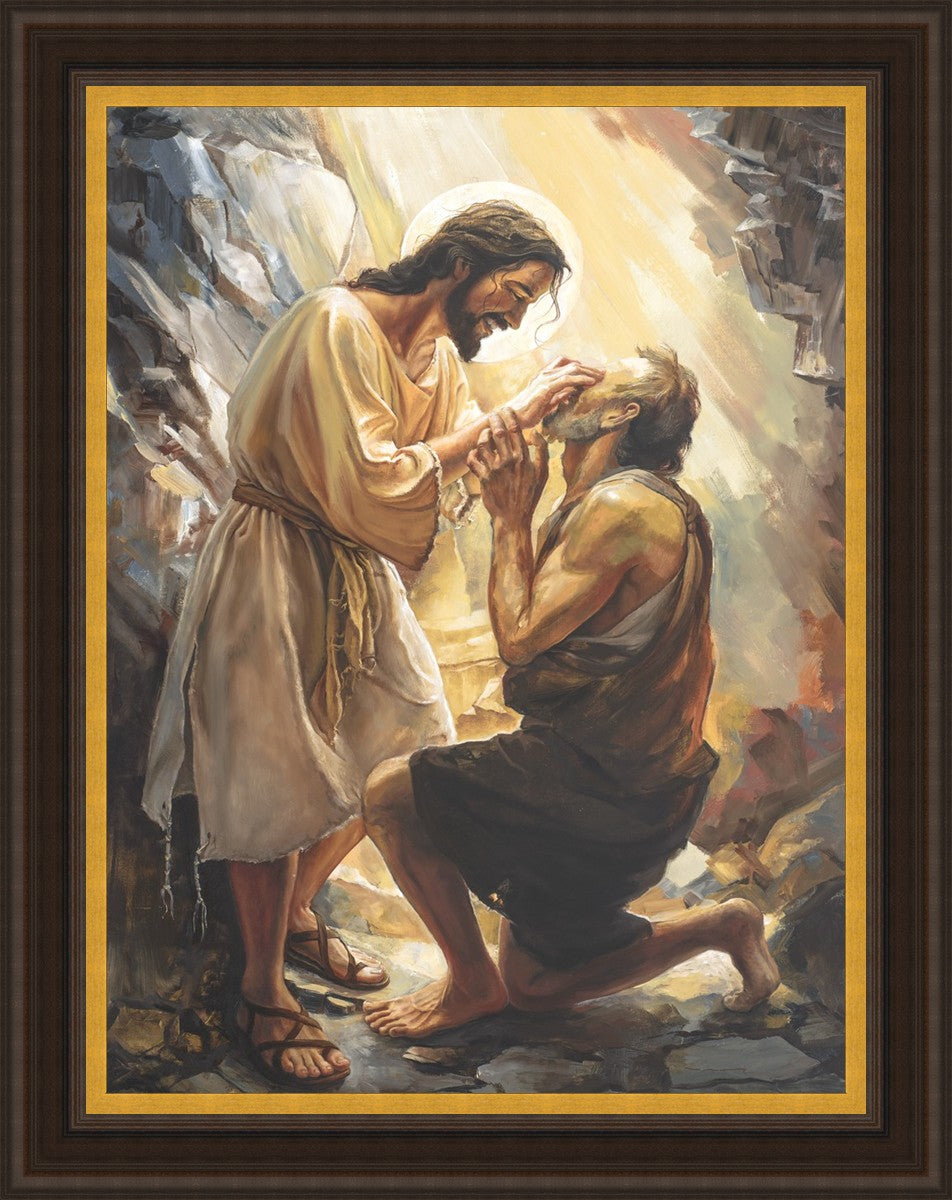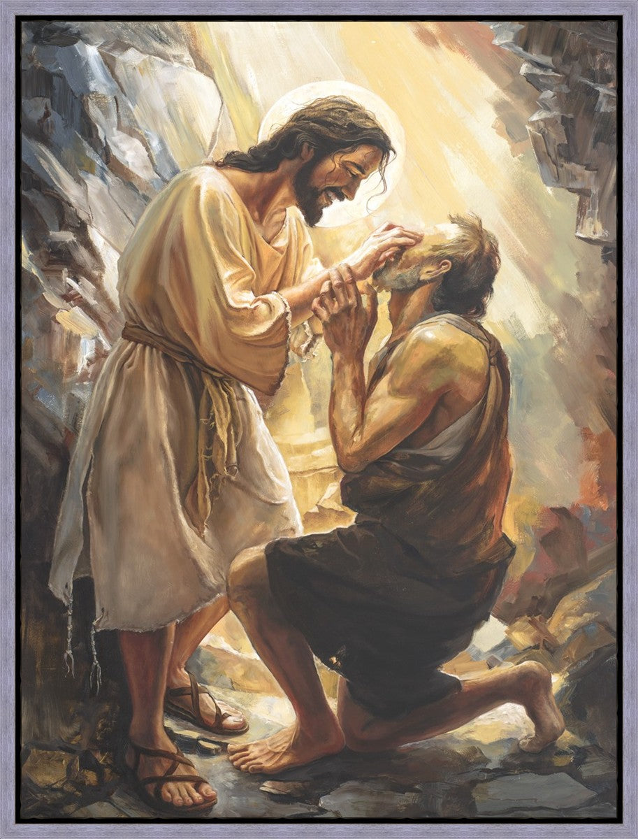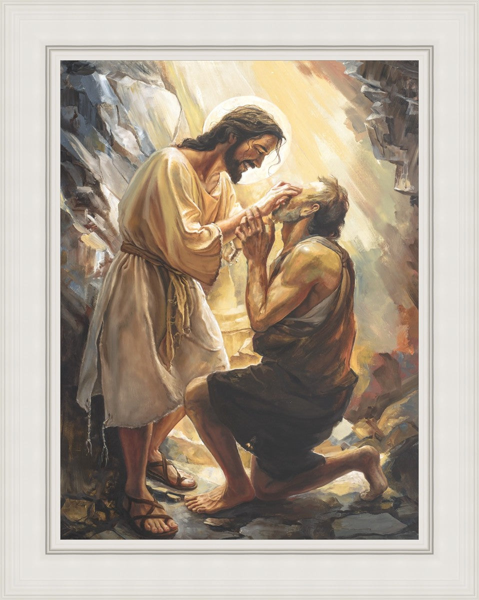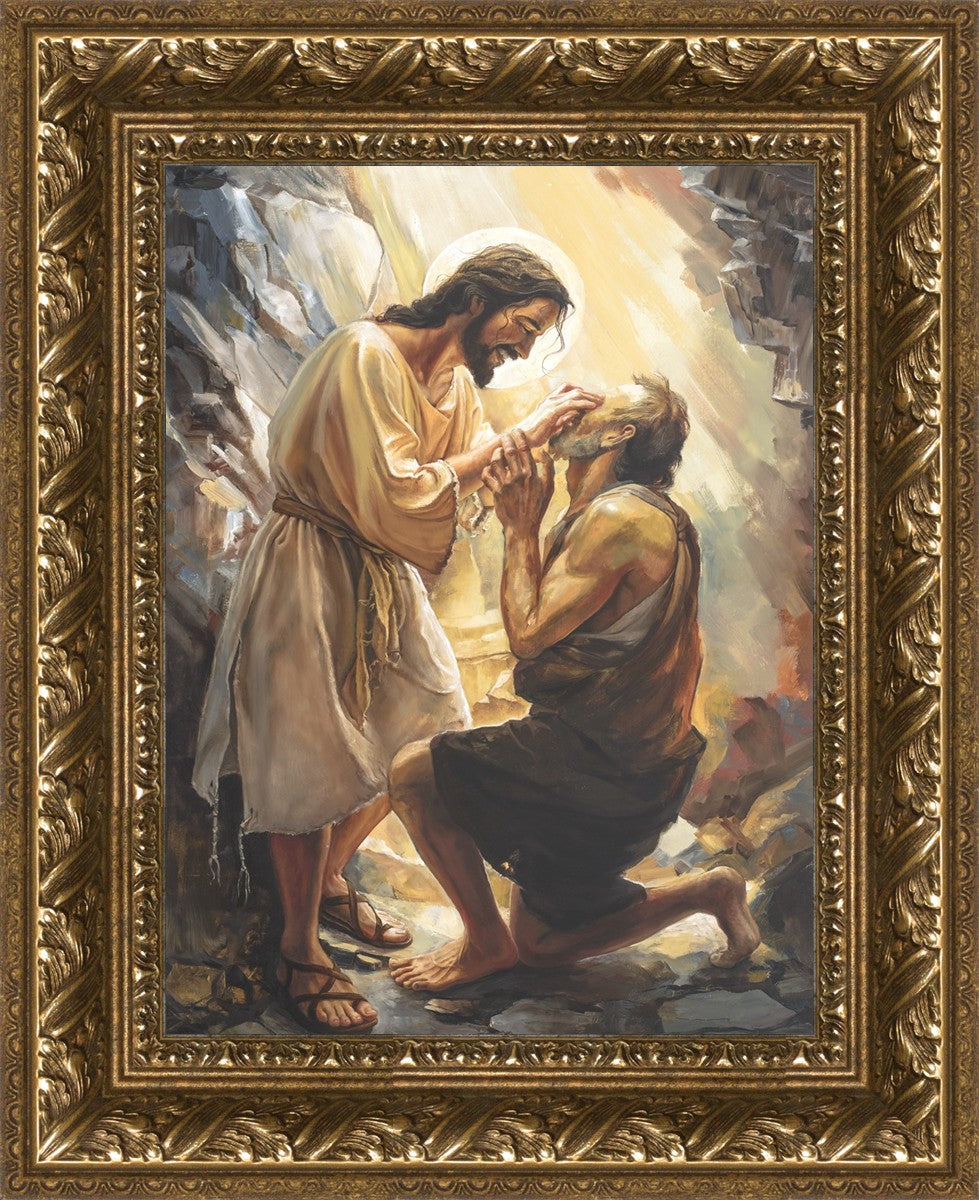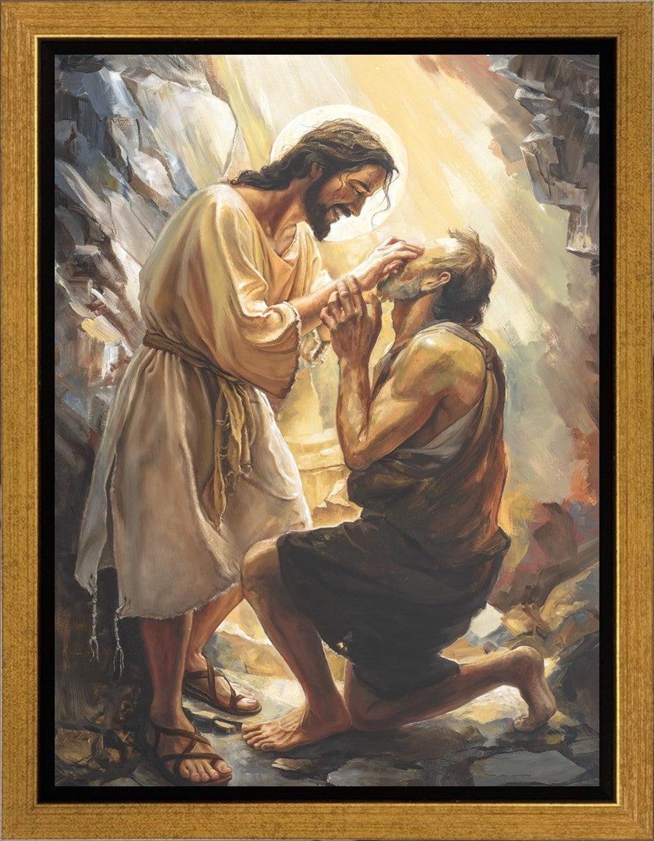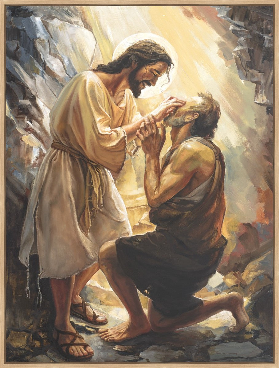 This piece employs high contrast to emphasize Christ's act of healing, drawing the viewer’s attention to the transformative moment. The warm color palette, reminiscent of the Blood of Christ, symbolizes the life and healing He brings to those who bow before Him in faith, petitioning for His blessing. Set deep within a cavernous hole, the scene conveys the experience of being trapped in addiction, sin, and self-deception. The background, painted with bold brushstrokes and rich impasto texture, reflects the chaos and darkness of this entrapment, while the hands and faces are rendered with a gentler, more detailed touch. Christ’s presence illuminates the scene, symbolizing that He alone can descend into our darkness, light the way, and show us the path to freedom.