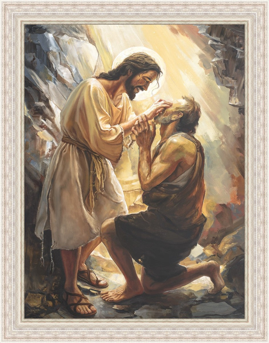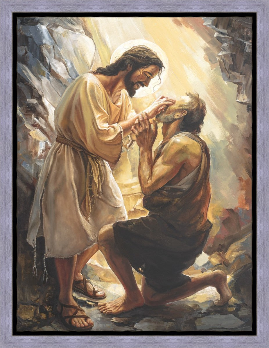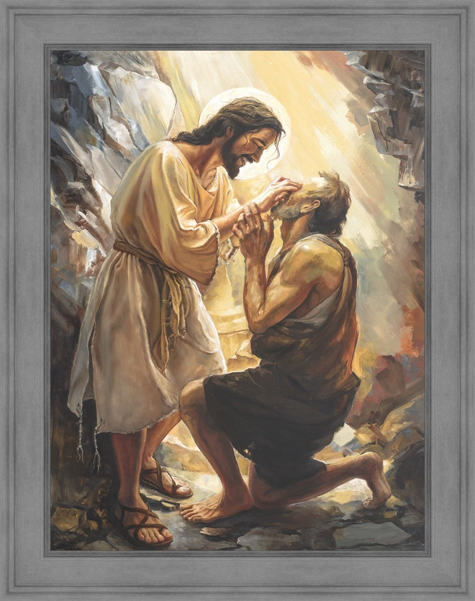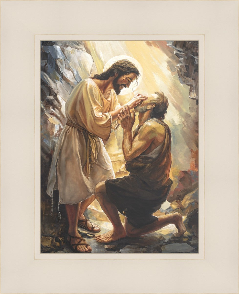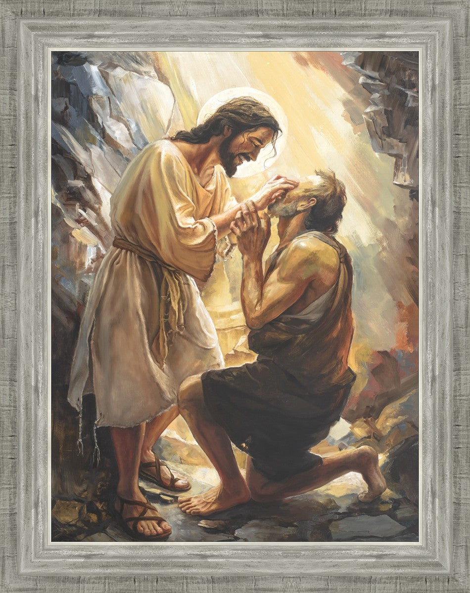 This piece employs high contrast to emphasize Christ's act of healing, drawing the viewer’s attention to the transformative moment. The warm color palette, reminiscent of the Blood of Christ, symbolizes the life and healing He brings to those who bow before Him in faith, petitioning for His blessing. Set deep within a cavernous hole, the scene conveys the experience of being trapped in addiction, sin, and self-deception. The background, painted with bold brushstrokes and rich impasto texture, reflects the chaos and darkness of this entrapment, while the hands and faces are rendered with a gentler, more detailed touch. Christ’s presence illuminates the scene, symbolizing that He alone can descend into our darkness, light the way, and show us the path to freedom.