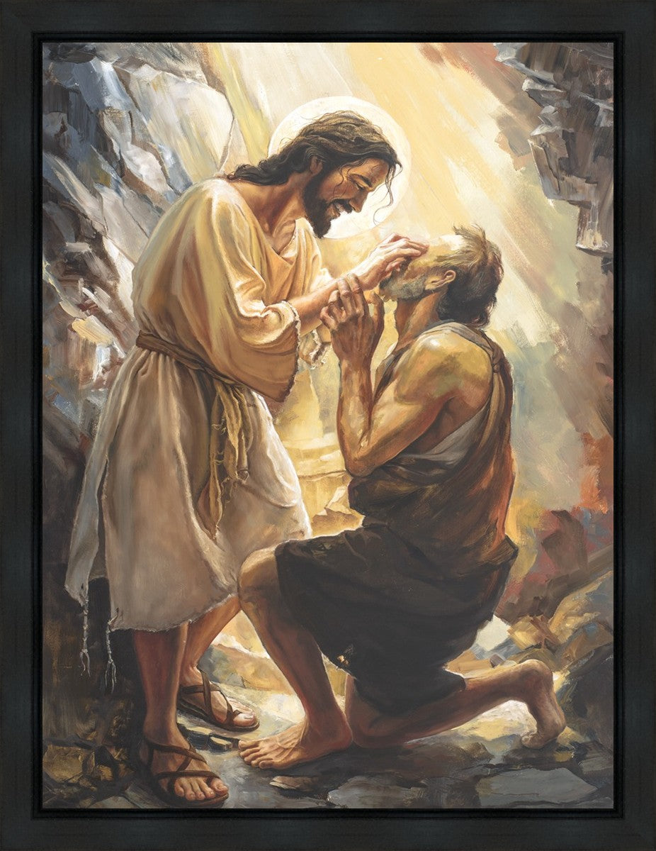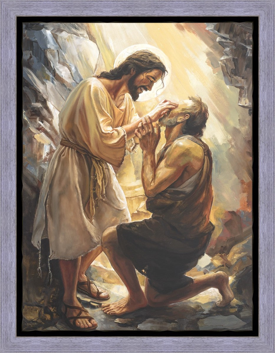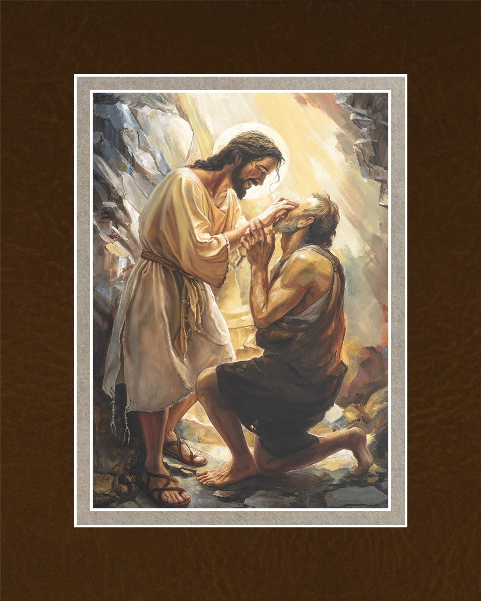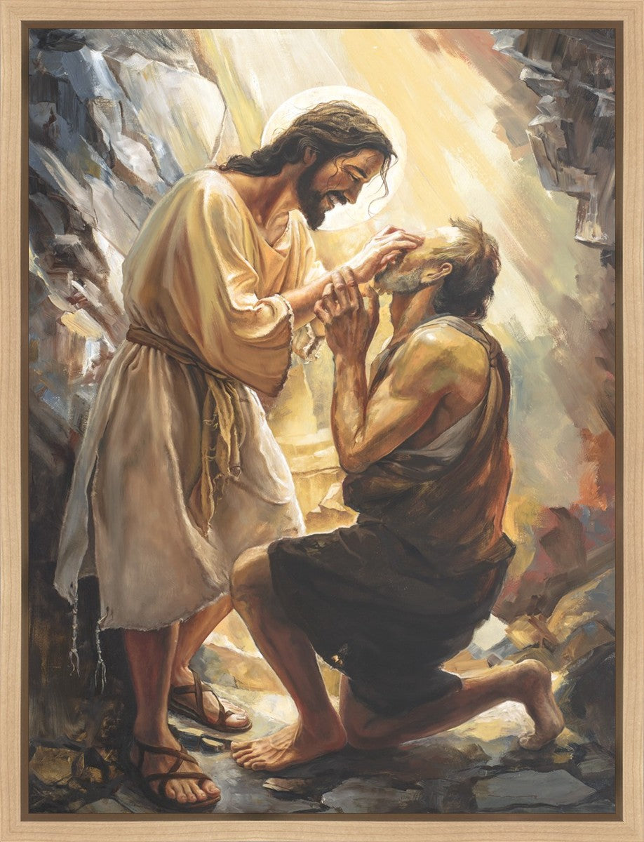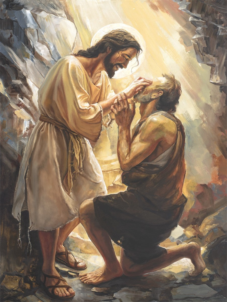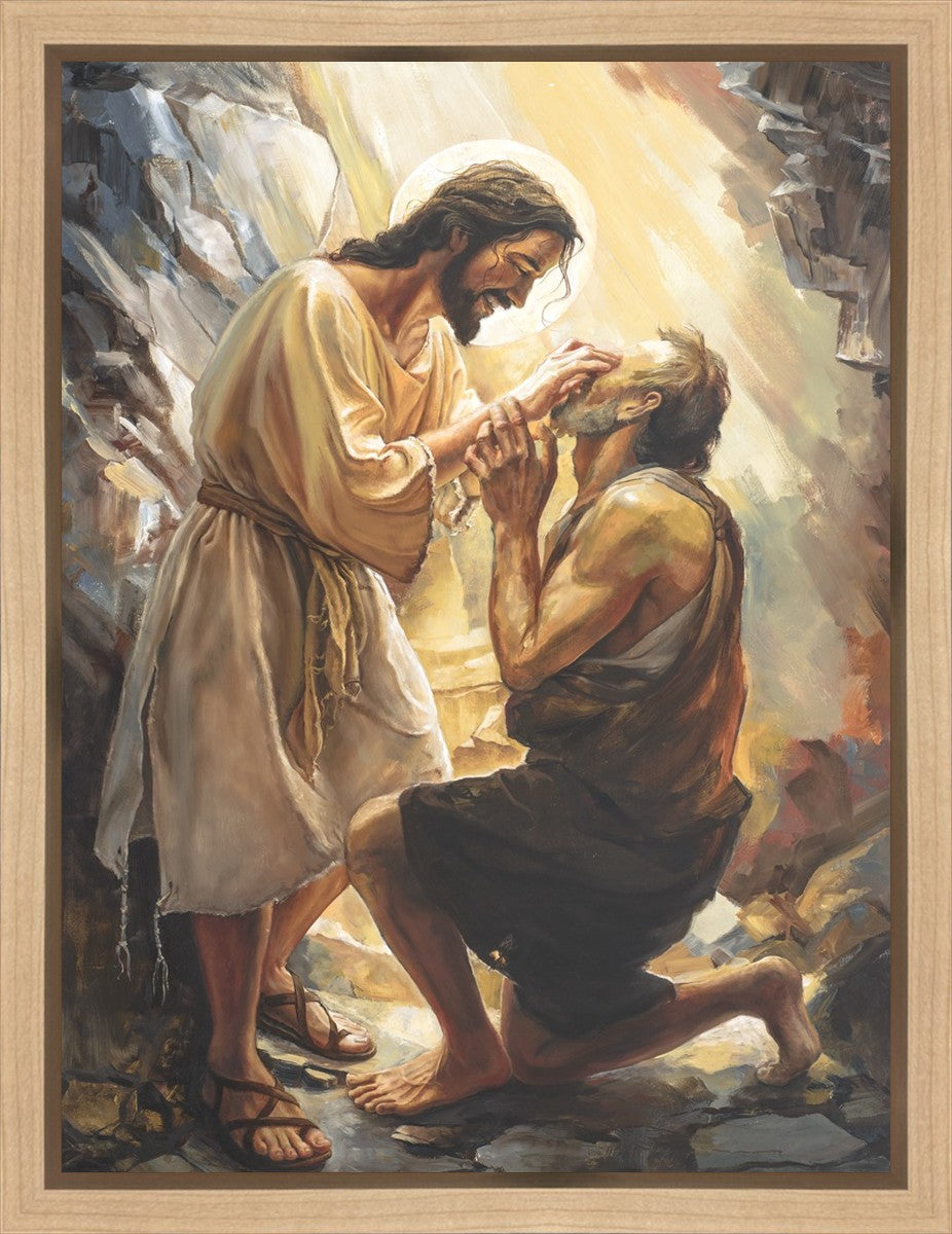 This piece employs high contrast to emphasize Christ's act of healing, drawing the viewer’s attention to the transformative moment. The warm color palette, reminiscent of the Blood of Christ, symbolizes the life and healing He brings to those who bow before Him in faith, petitioning for His blessing. Set deep within a cavernous hole, the scene conveys the experience of being trapped in addiction, sin, and self-deception. The background, painted with bold brushstrokes and rich impasto texture, reflects the chaos and darkness of this entrapment, while the hands and faces are rendered with a gentler, more detailed touch. Christ’s presence illuminates the scene, symbolizing that He alone can descend into our darkness, light the way, and show us the path to freedom.