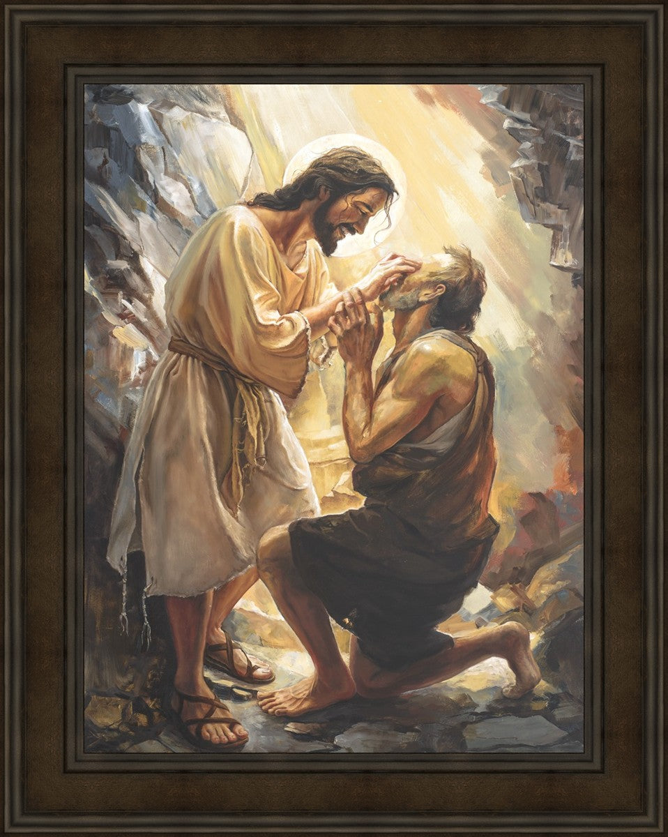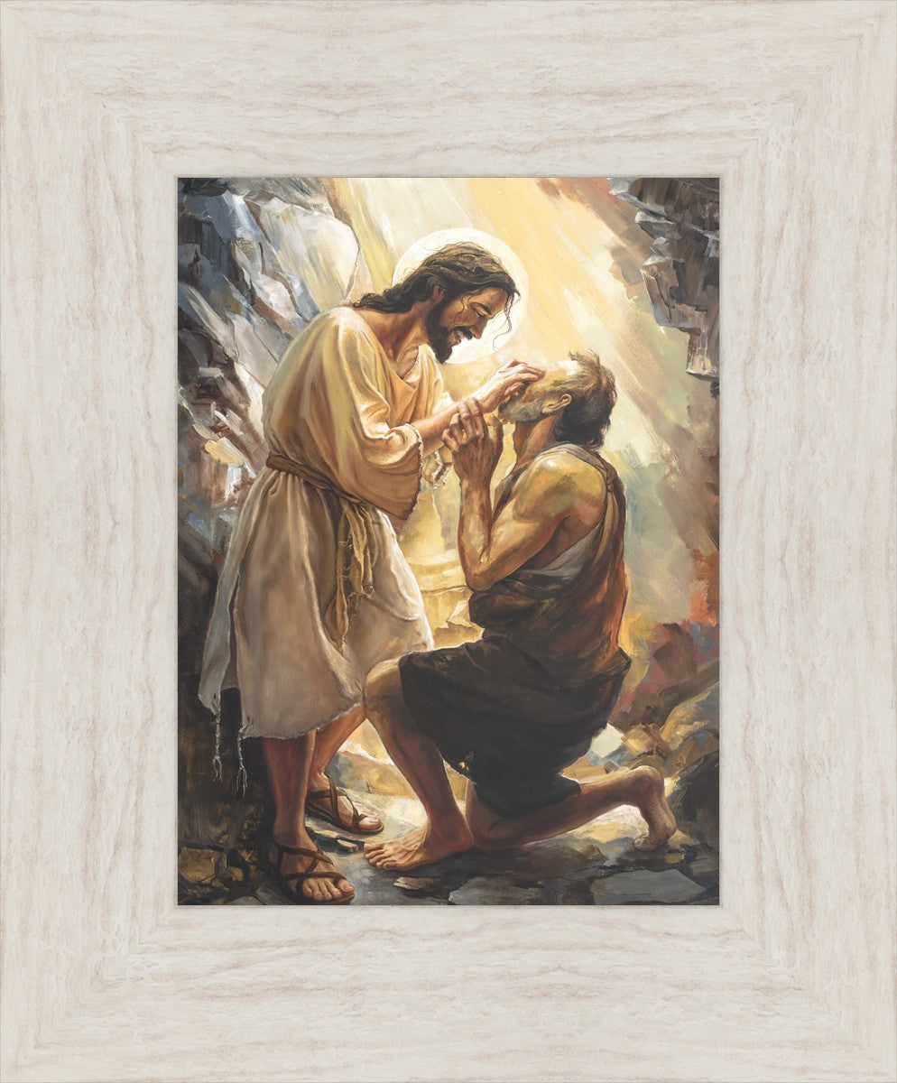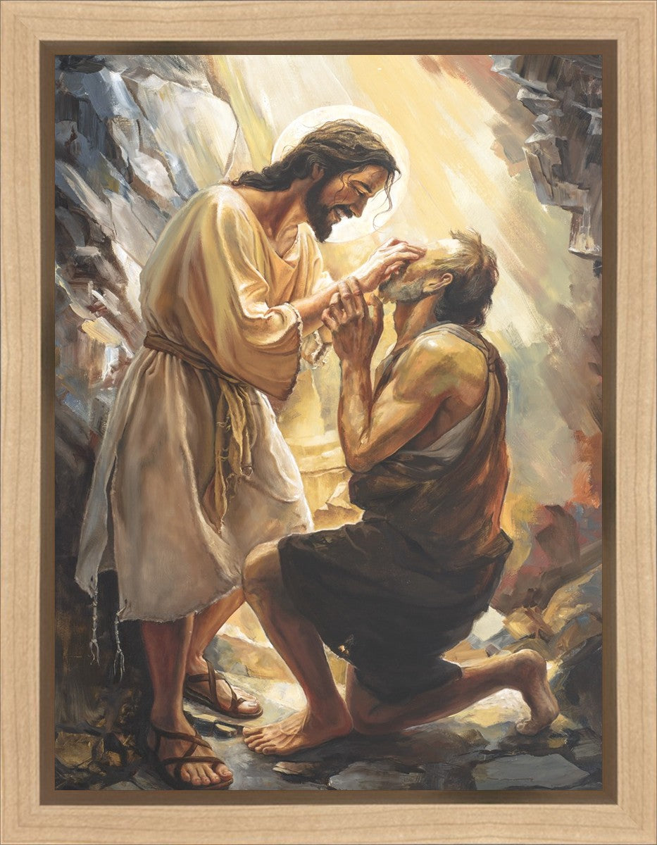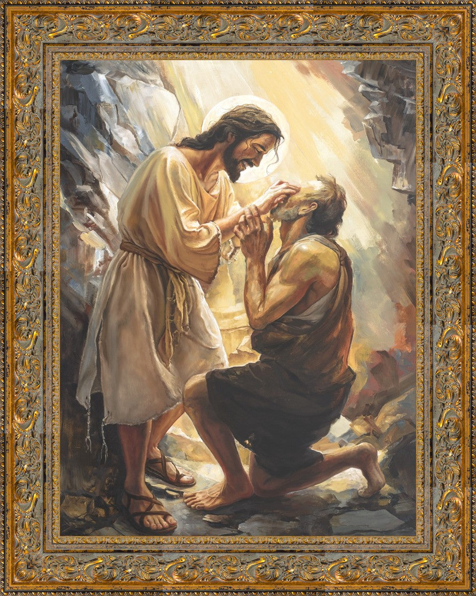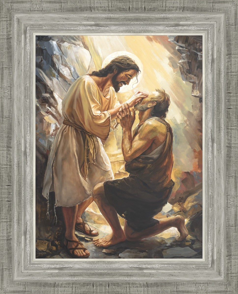 This piece employs high contrast to emphasize Christ's act of healing, drawing the viewer’s attention to the transformative moment. The warm color palette, reminiscent of the Blood of Christ, symbolizes the life and healing He brings to those who bow before Him in faith, petitioning for His blessing. Set deep within a cavernous hole, the scene conveys the experience of being trapped in addiction, sin, and self-deception. The background, painted with bold brushstrokes and rich impasto texture, reflects the chaos and darkness of this entrapment, while the hands and faces are rendered with a gentler, more detailed touch. Christ’s presence illuminates the scene, symbolizing that He alone can descend into our darkness, light the way, and show us the path to freedom.