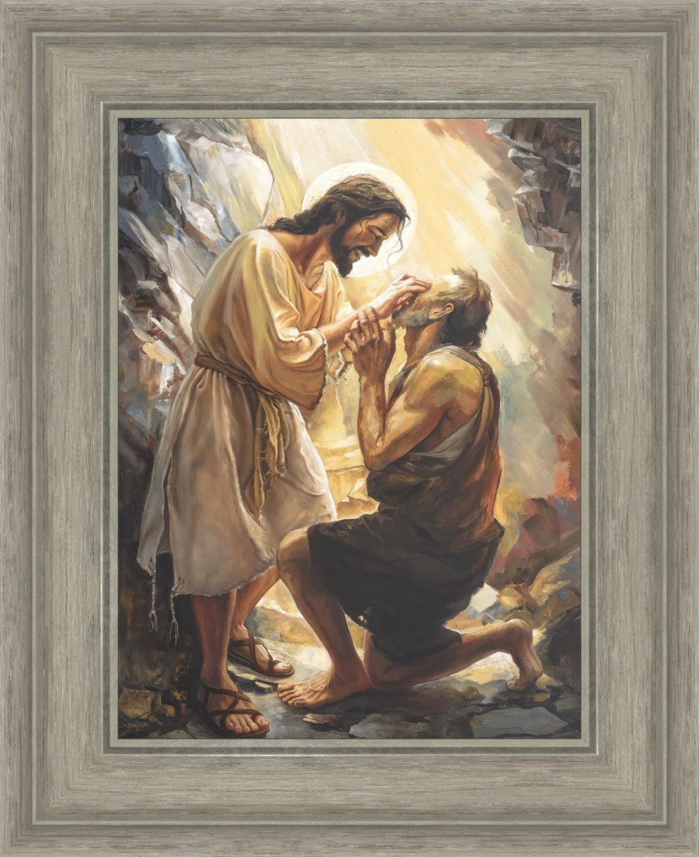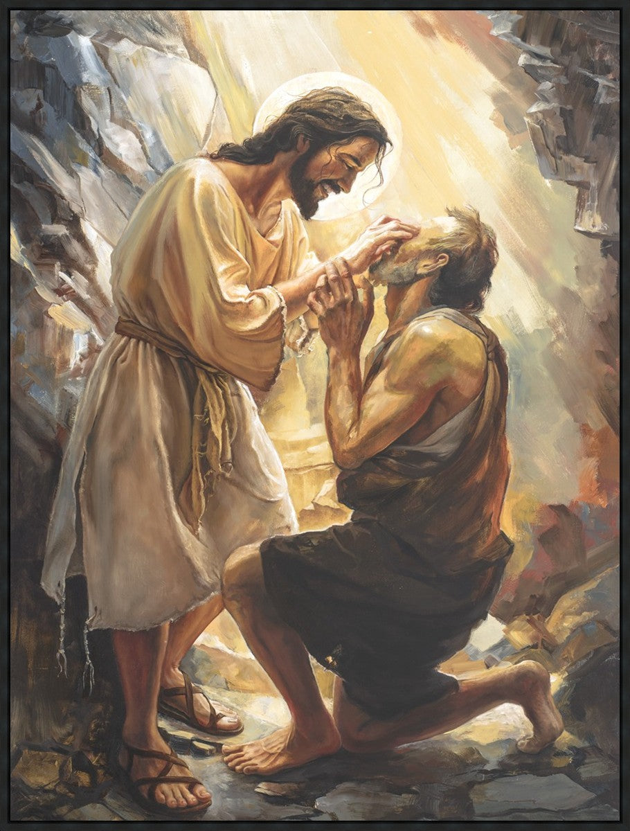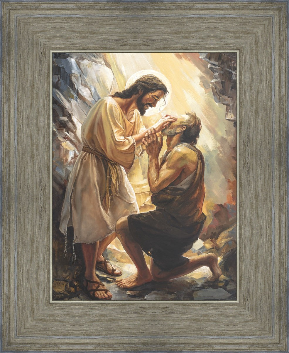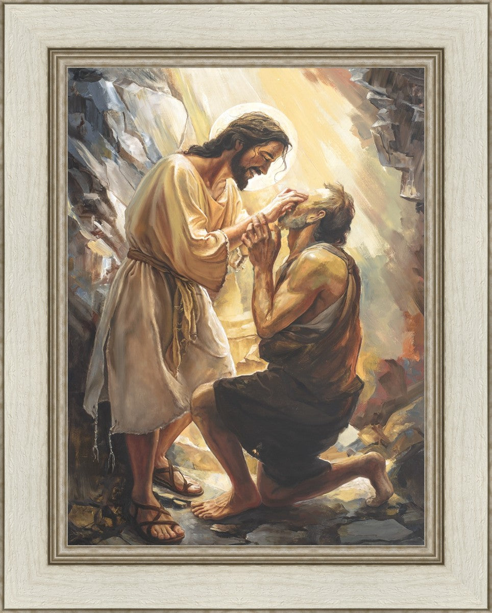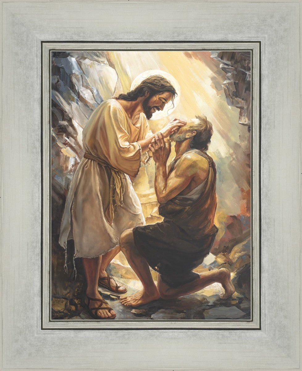 This piece employs high contrast to emphasize Christ's act of healing, drawing the viewer’s attention to the transformative moment. The warm color palette, reminiscent of the Blood of Christ, symbolizes the life and healing He brings to those who bow before Him in faith, petitioning for His blessing. Set deep within a cavernous hole, the scene conveys the experience of being trapped in addiction, sin, and self-deception. The background, painted with bold brushstrokes and rich impasto texture, reflects the chaos and darkness of this entrapment, while the hands and faces are rendered with a gentler, more detailed touch. Christ’s presence illuminates the scene, symbolizing that He alone can descend into our darkness, light the way, and show us the path to freedom.