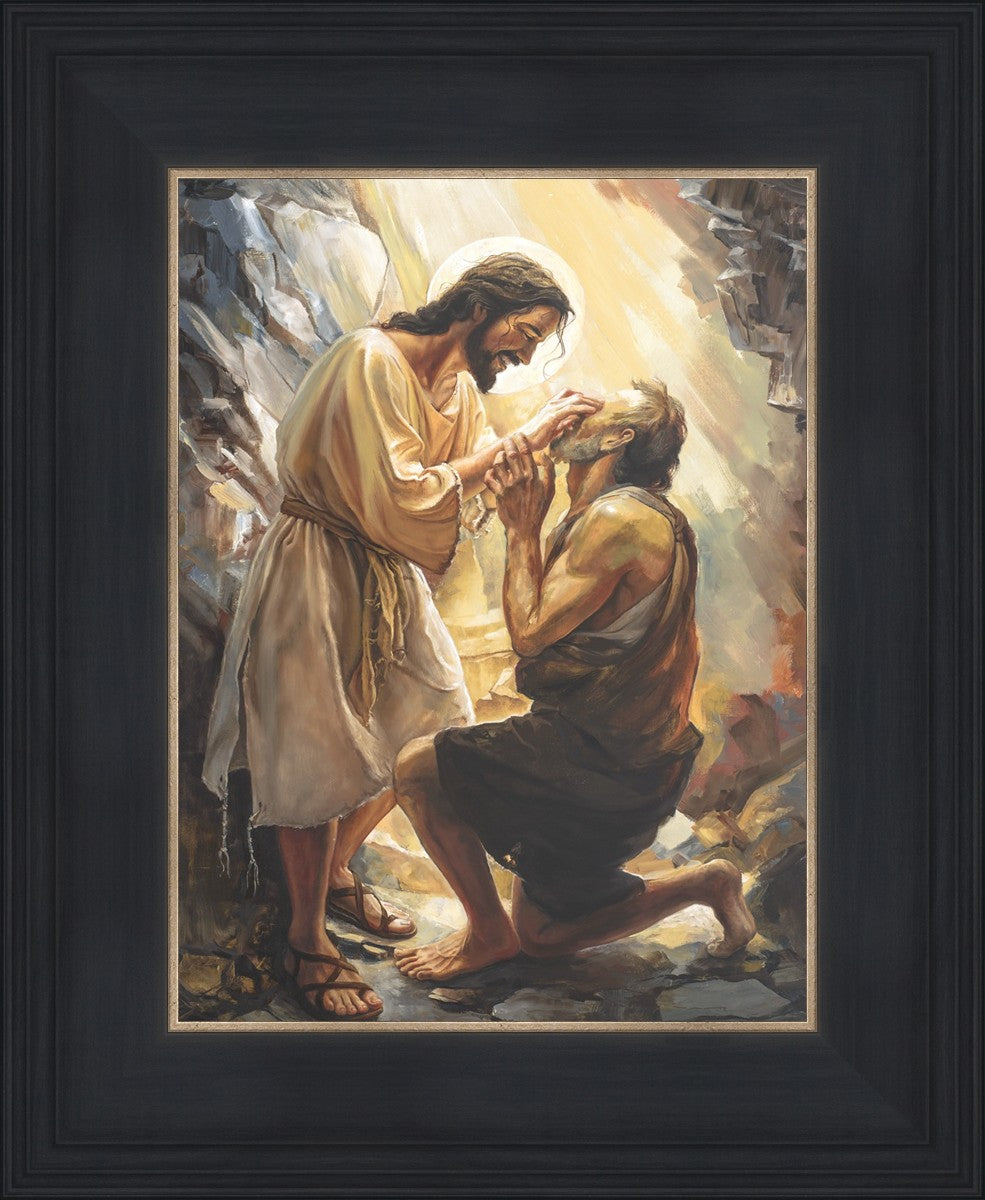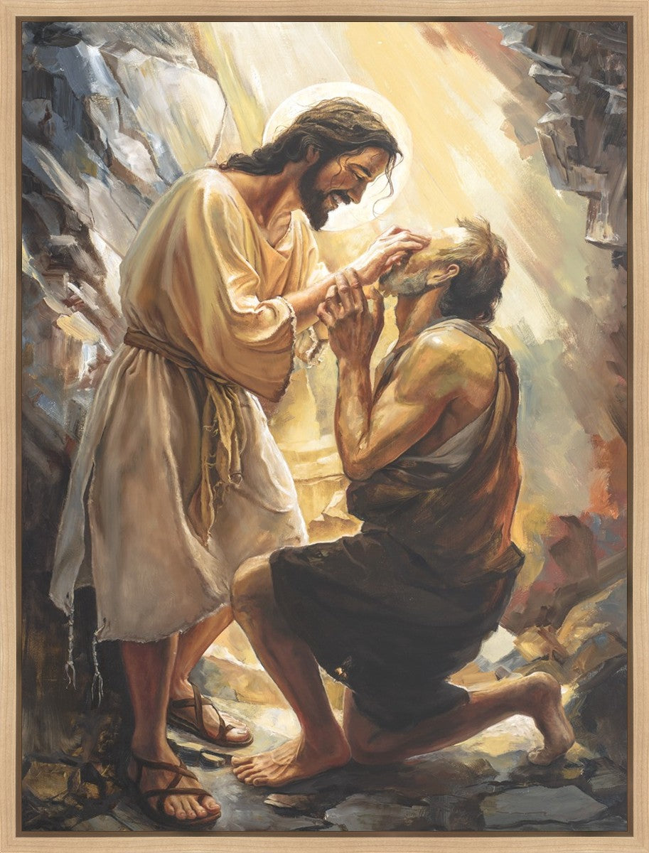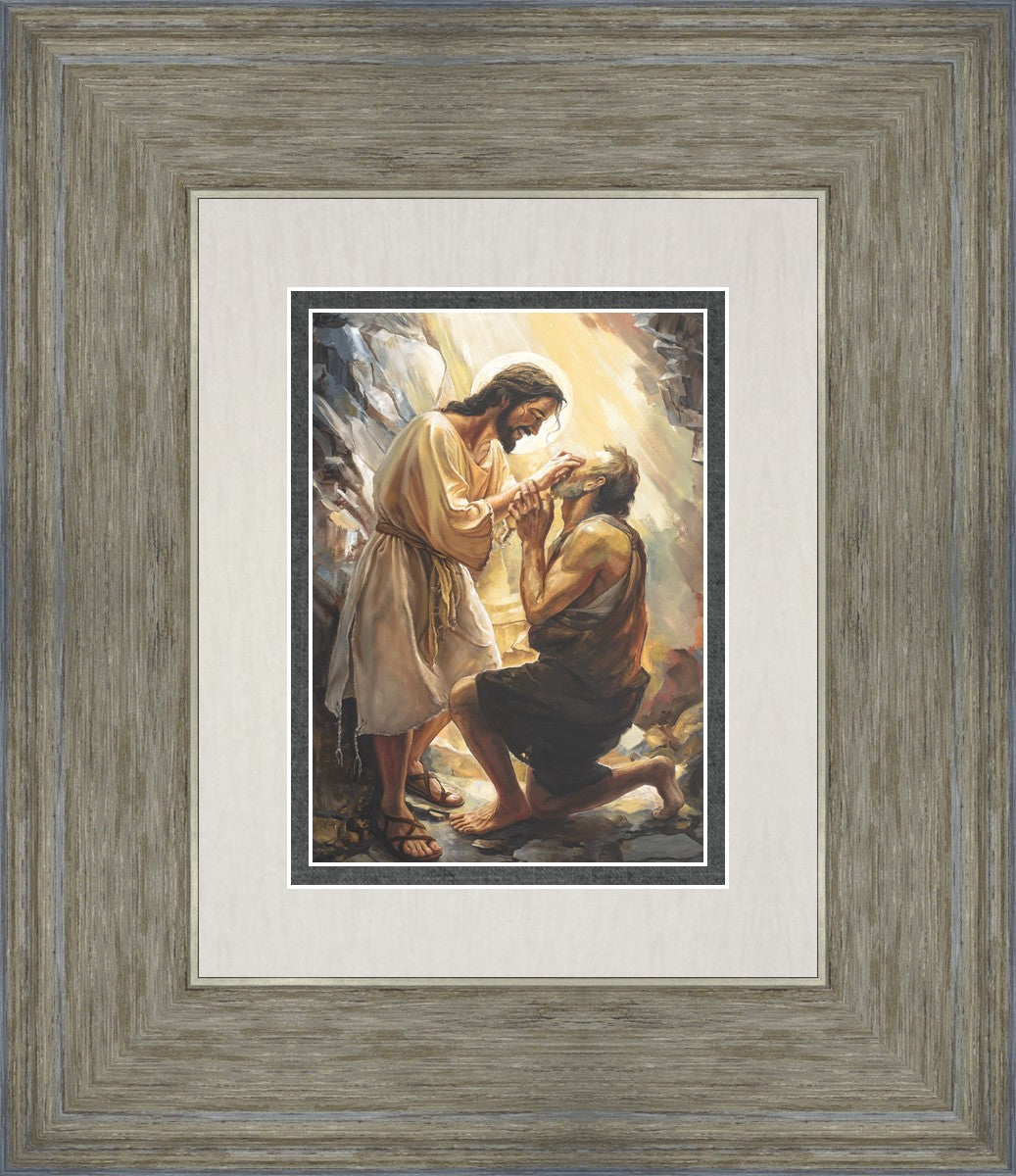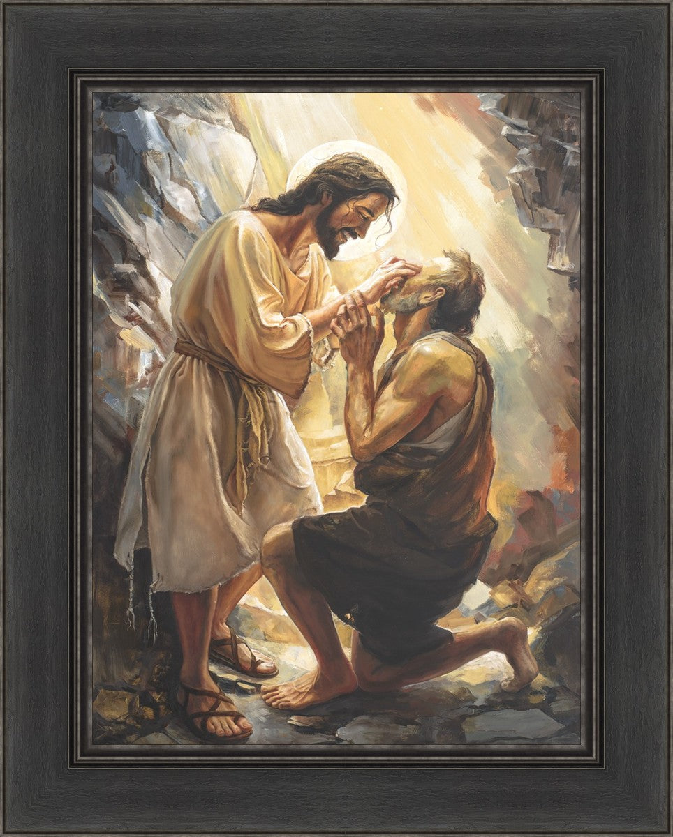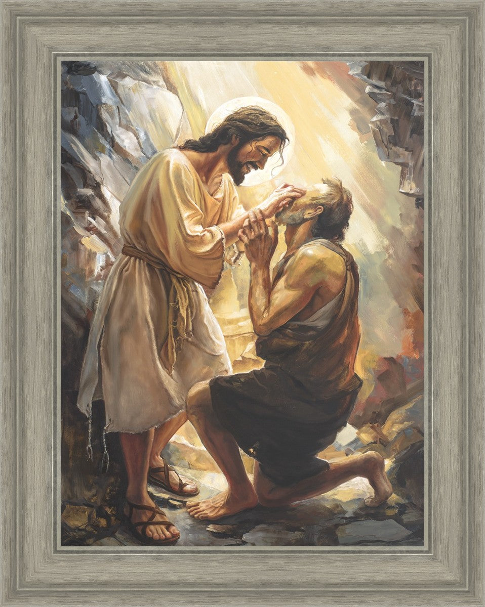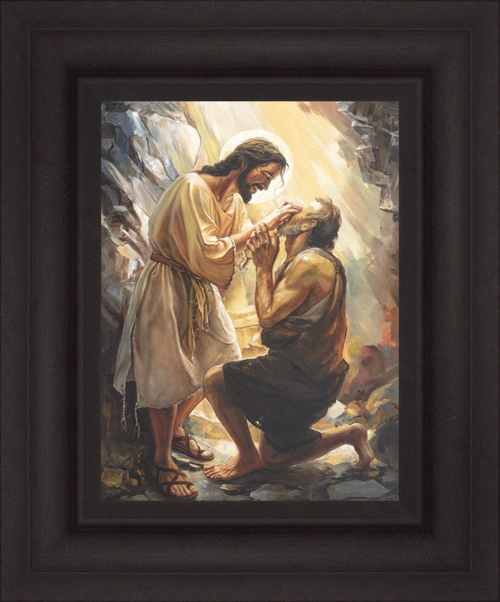 This piece employs high contrast to emphasize Christ's act of healing, drawing the viewer’s attention to the transformative moment. The warm color palette, reminiscent of the Blood of Christ, symbolizes the life and healing He brings to those who bow before Him in faith, petitioning for His blessing. Set deep within a cavernous hole, the scene conveys the experience of being trapped in addiction, sin, and self-deception. The background, painted with bold brushstrokes and rich impasto texture, reflects the chaos and darkness of this entrapment, while the hands and faces are rendered with a gentler, more detailed touch. Christ’s presence illuminates the scene, symbolizing that He alone can descend into our darkness, light the way, and show us the path to freedom.