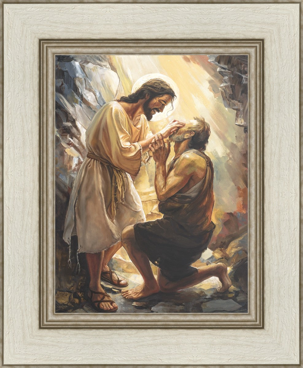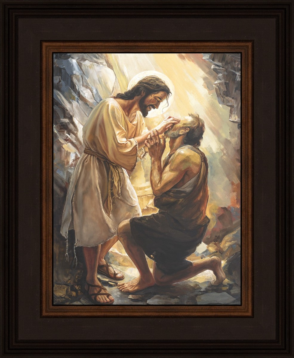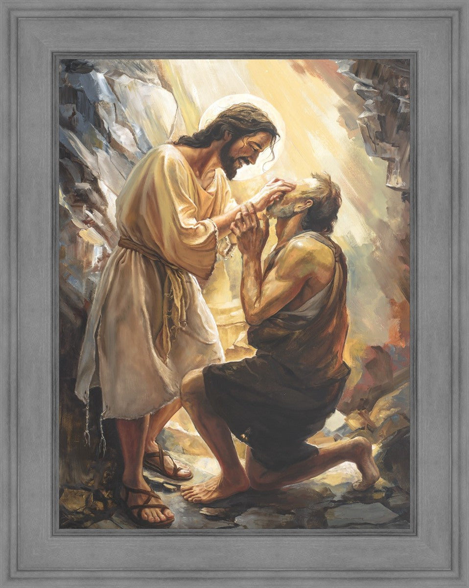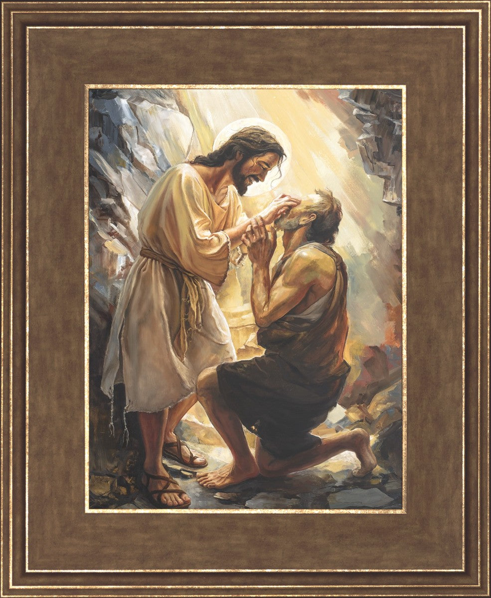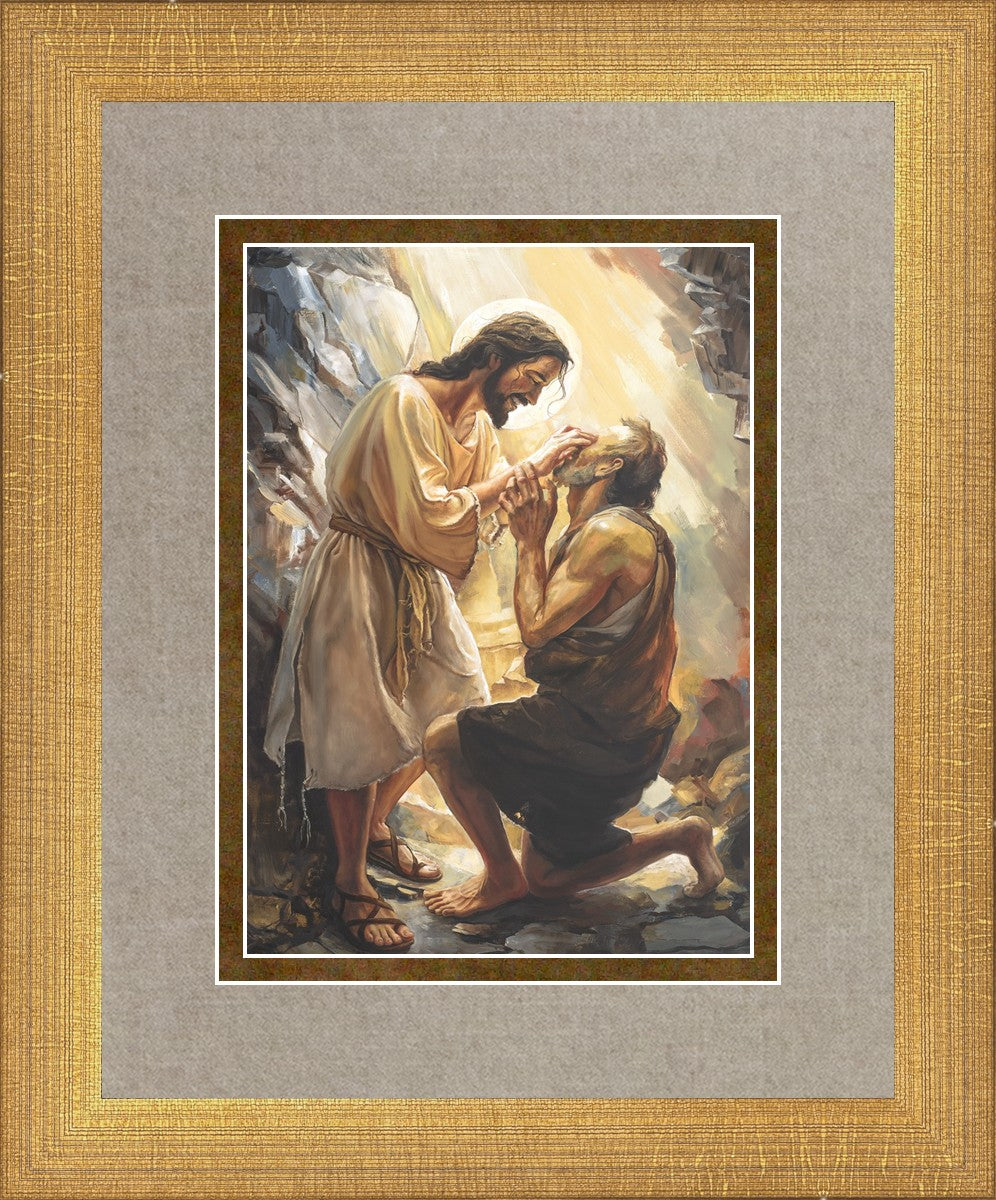 This piece employs high contrast to emphasize Christ's act of healing, drawing the viewer’s attention to the transformative moment. The warm color palette, reminiscent of the Blood of Christ, symbolizes the life and healing He brings to those who bow before Him in faith, petitioning for His blessing. Set deep within a cavernous hole, the scene conveys the experience of being trapped in addiction, sin, and self-deception. The background, painted with bold brushstrokes and rich impasto texture, reflects the chaos and darkness of this entrapment, while the hands and faces are rendered with a gentler, more detailed touch. Christ’s presence illuminates the scene, symbolizing that He alone can descend into our darkness, light the way, and show us the path to freedom.