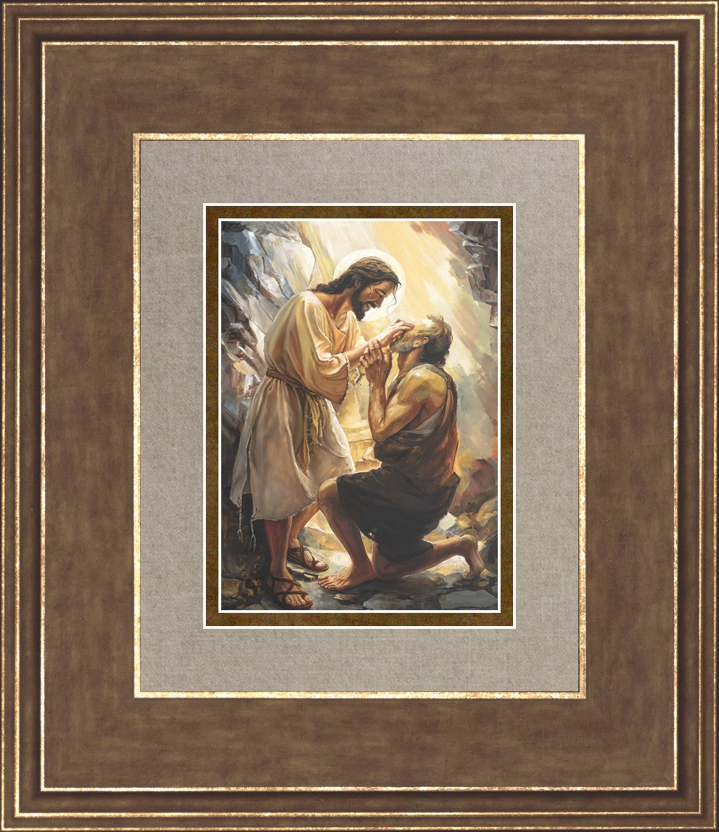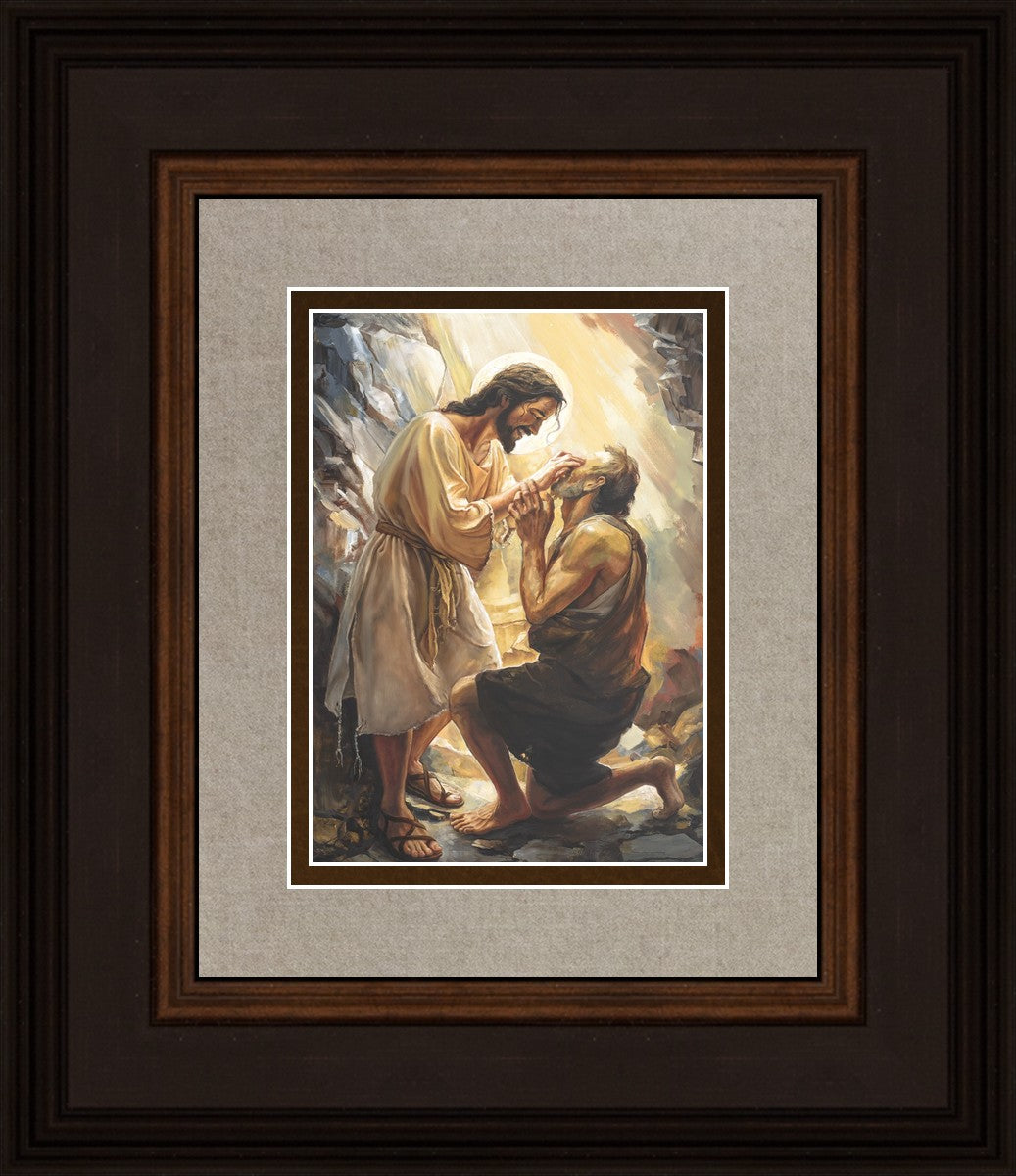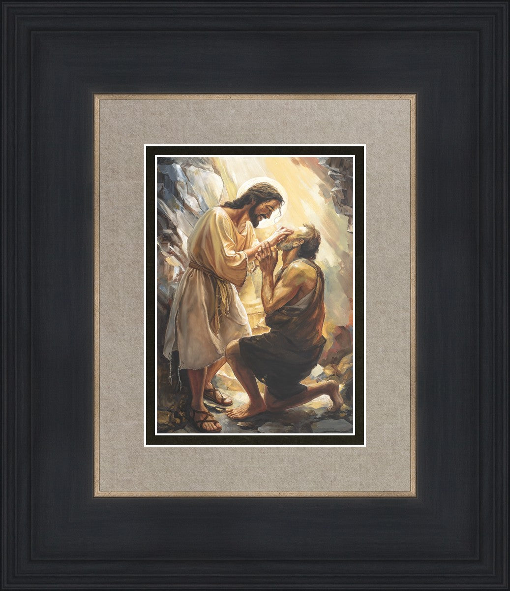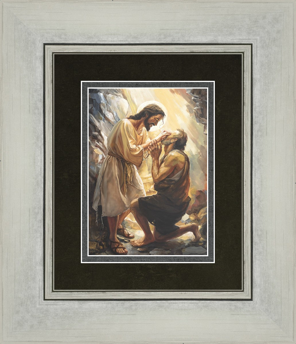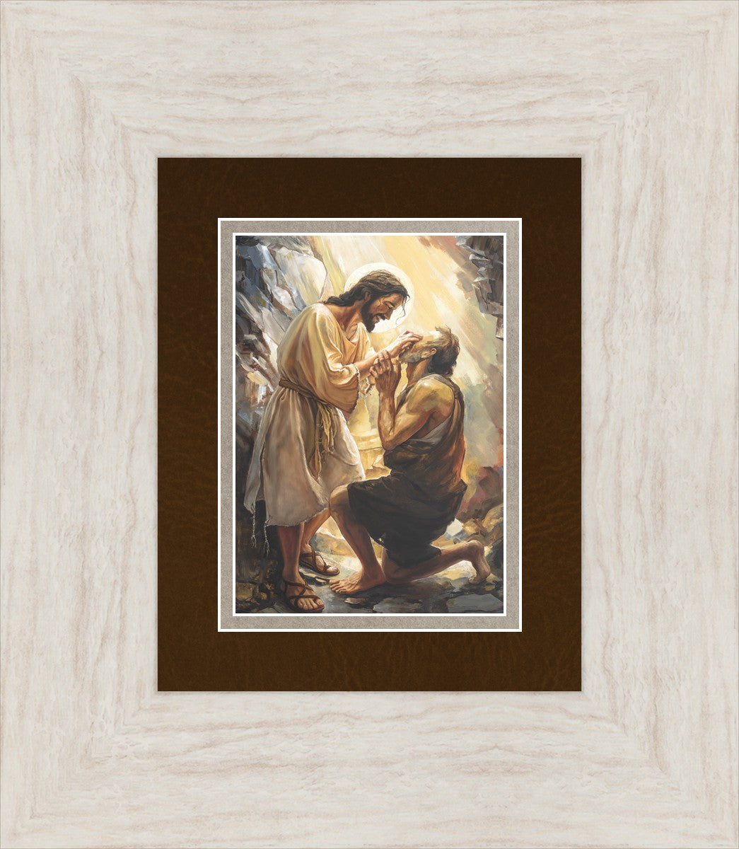 This piece employs high contrast to emphasize Christ's act of healing, drawing the viewer’s attention to the transformative moment. The warm color palette, reminiscent of the Blood of Christ, symbolizes the life and healing He brings to those who bow before Him in faith, petitioning for His blessing. Set deep within a cavernous hole, the scene conveys the experience of being trapped in addiction, sin, and self-deception. The background, painted with bold brushstrokes and rich impasto texture, reflects the chaos and darkness of this entrapment, while the hands and faces are rendered with a gentler, more detailed touch. Christ’s presence illuminates the scene, symbolizing that He alone can descend into our darkness, light the way, and show us the path to freedom.