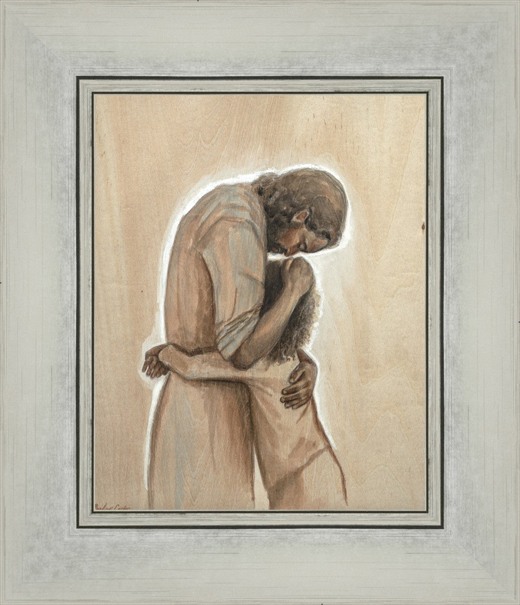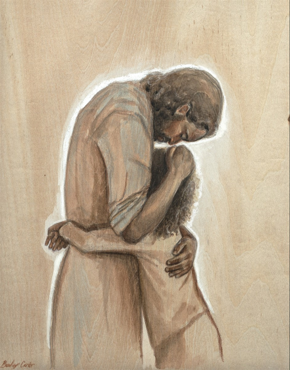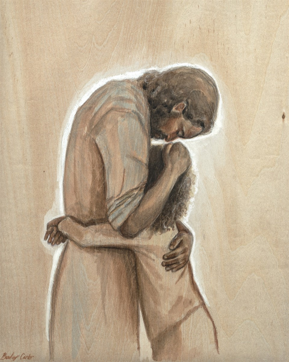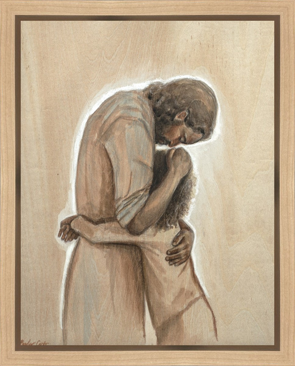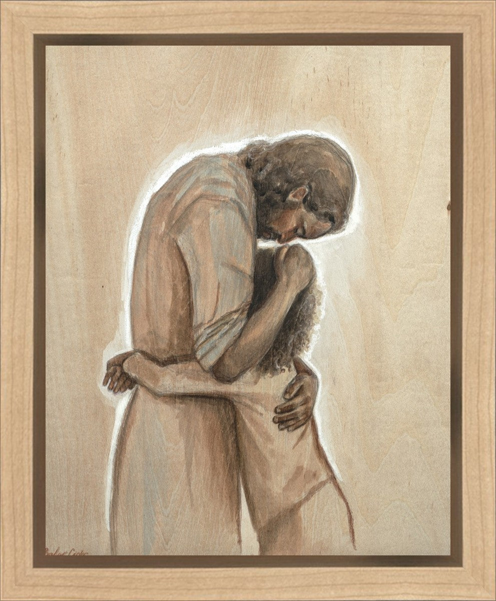 Drawn on wood, Hearts Home depicts the Savior embracing a young child.