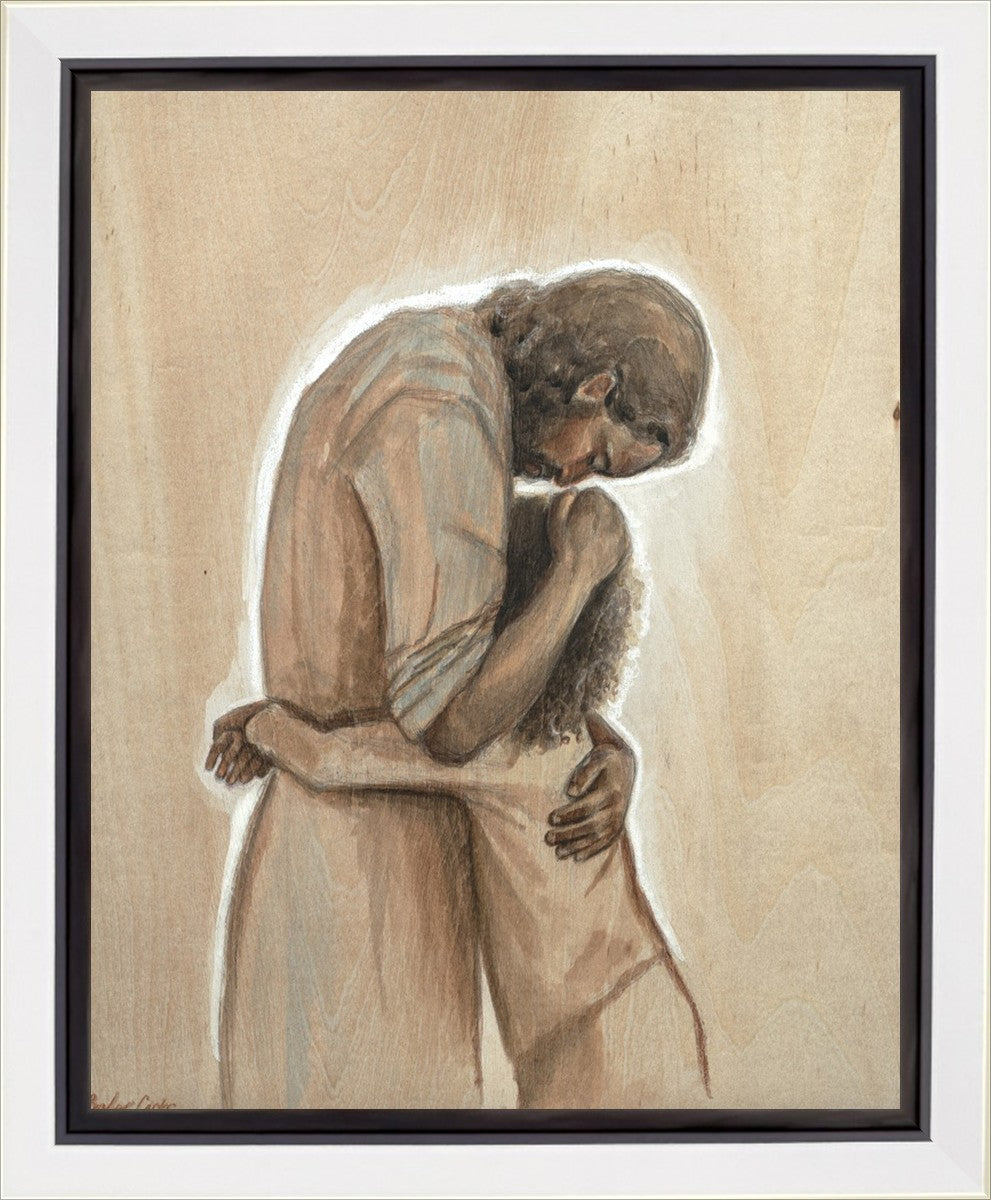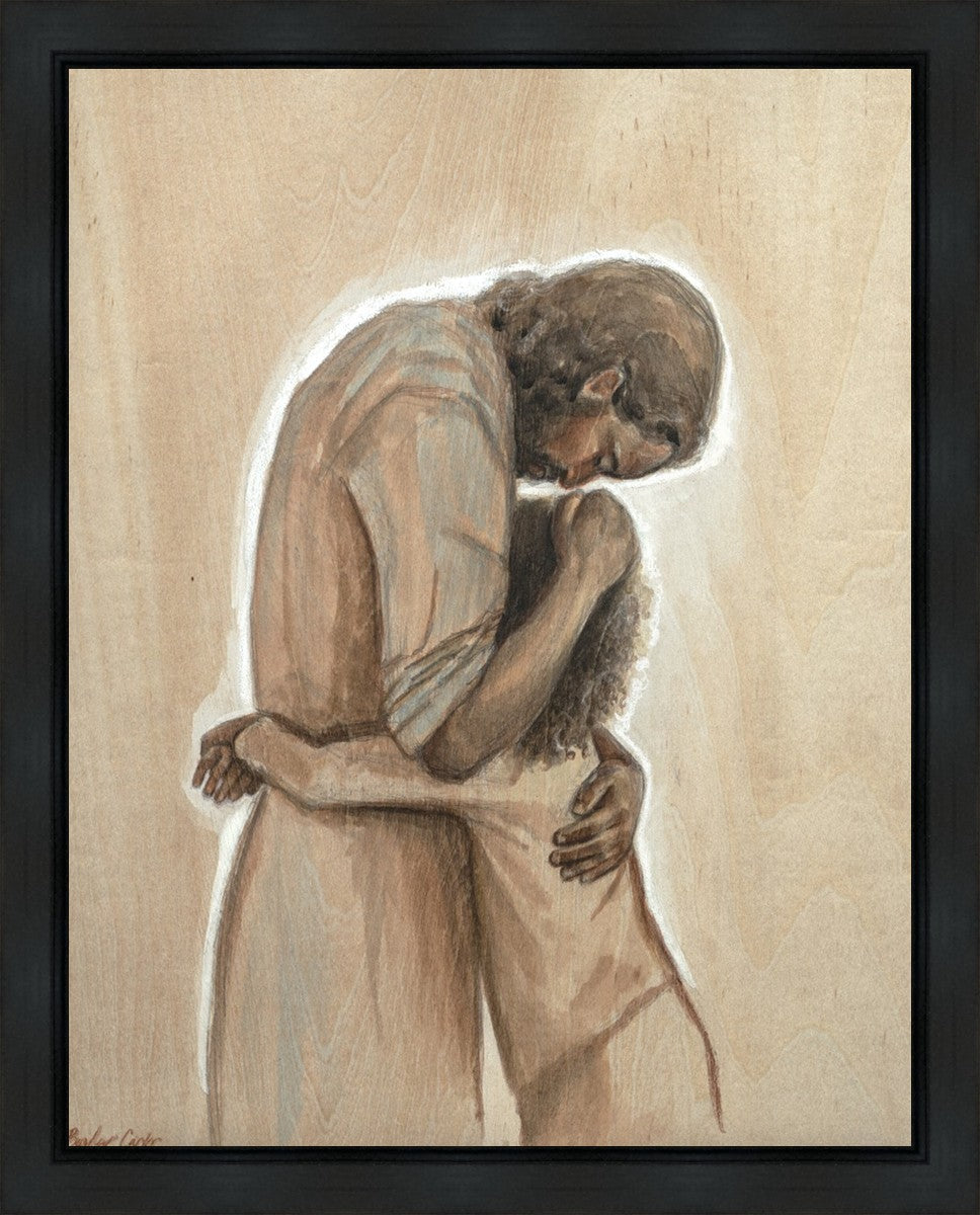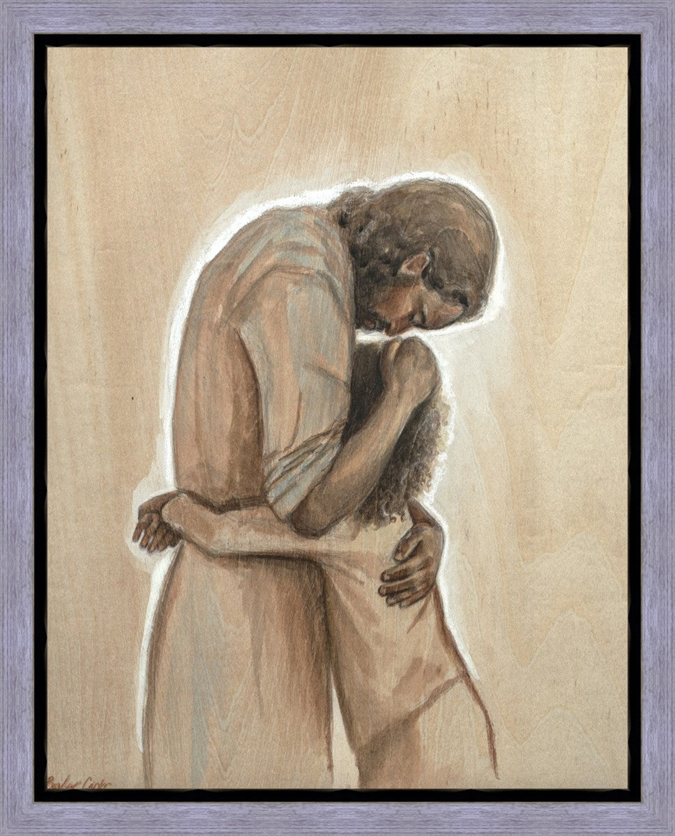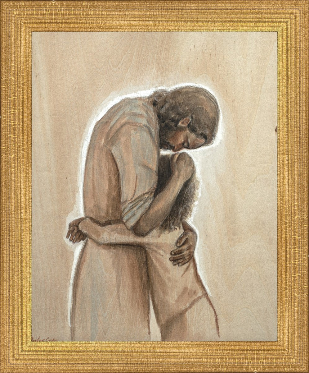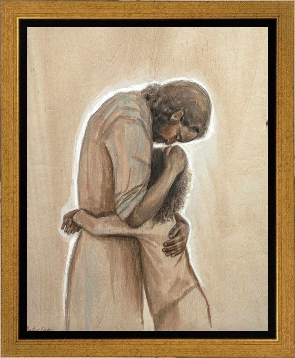 Drawn on wood, Hearts Home depicts the Savior embracing a young child.