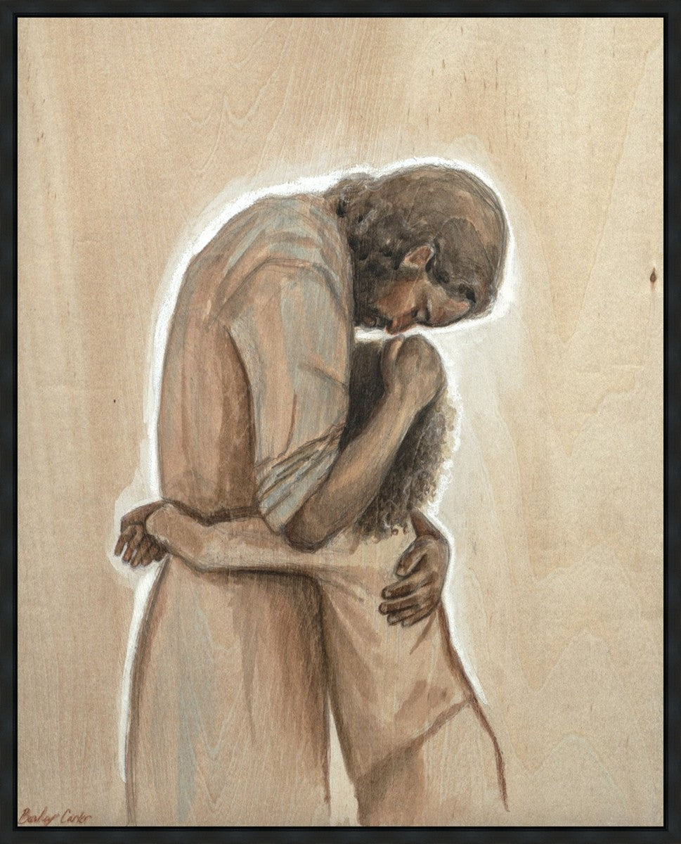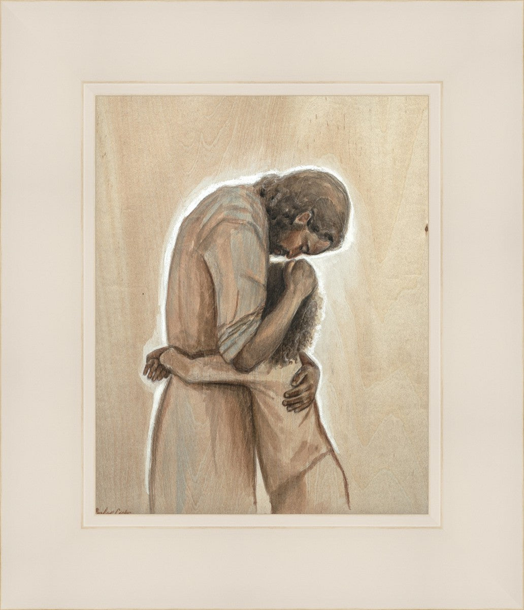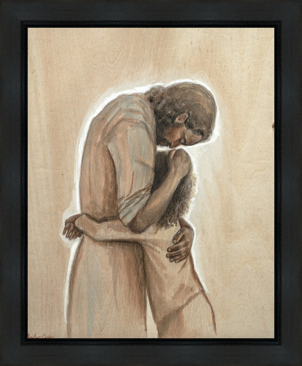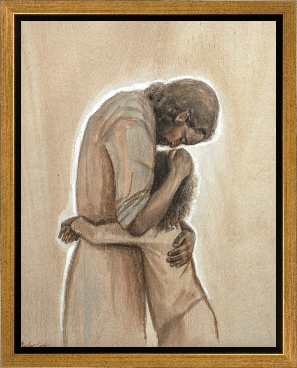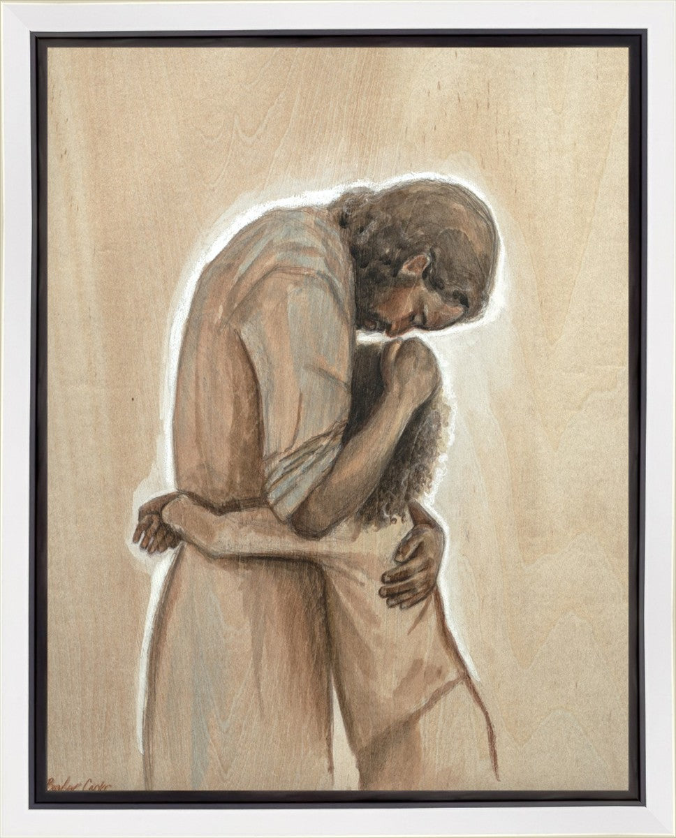 Drawn on wood, Hearts Home depicts the Savior embracing a young child.
