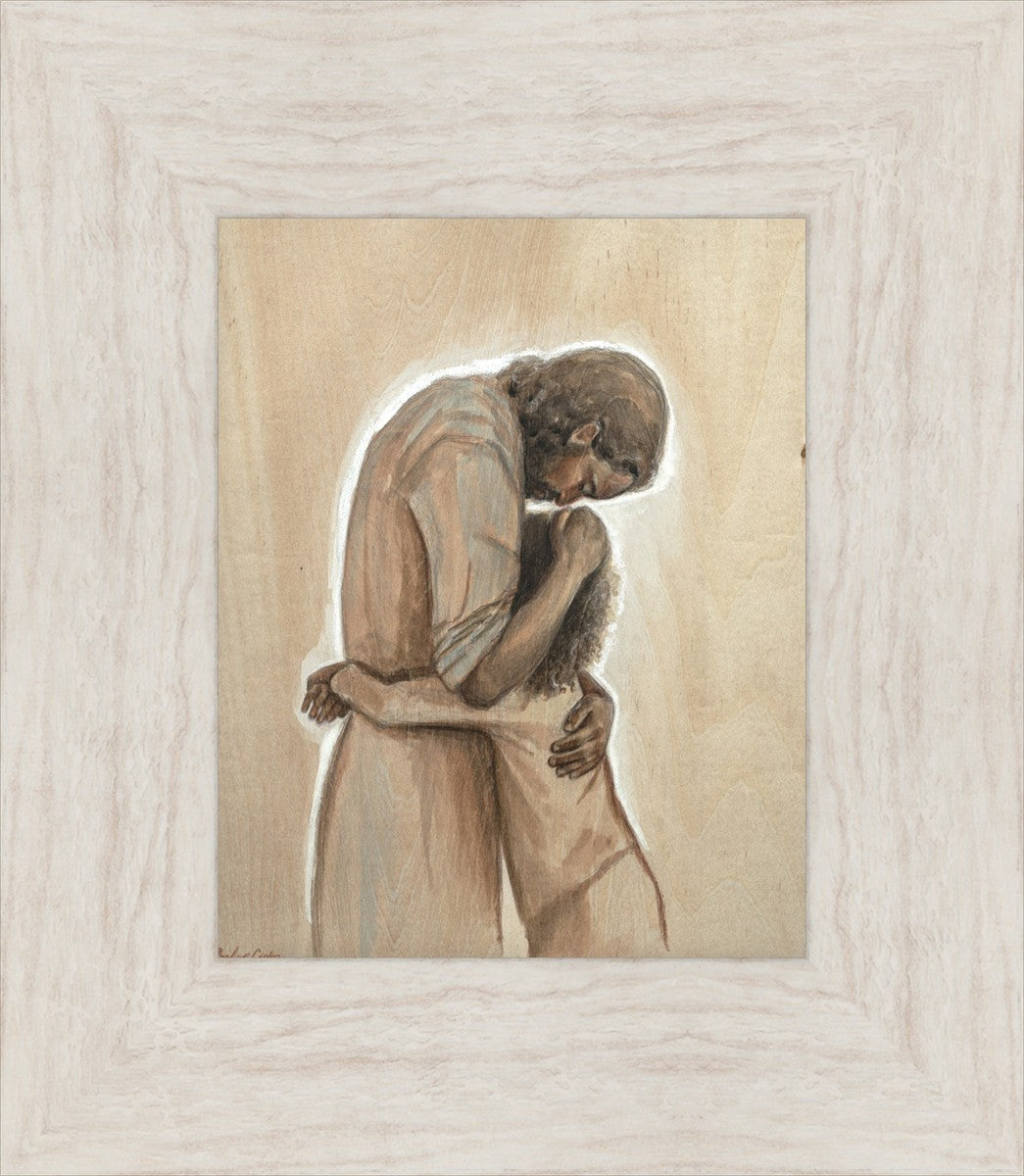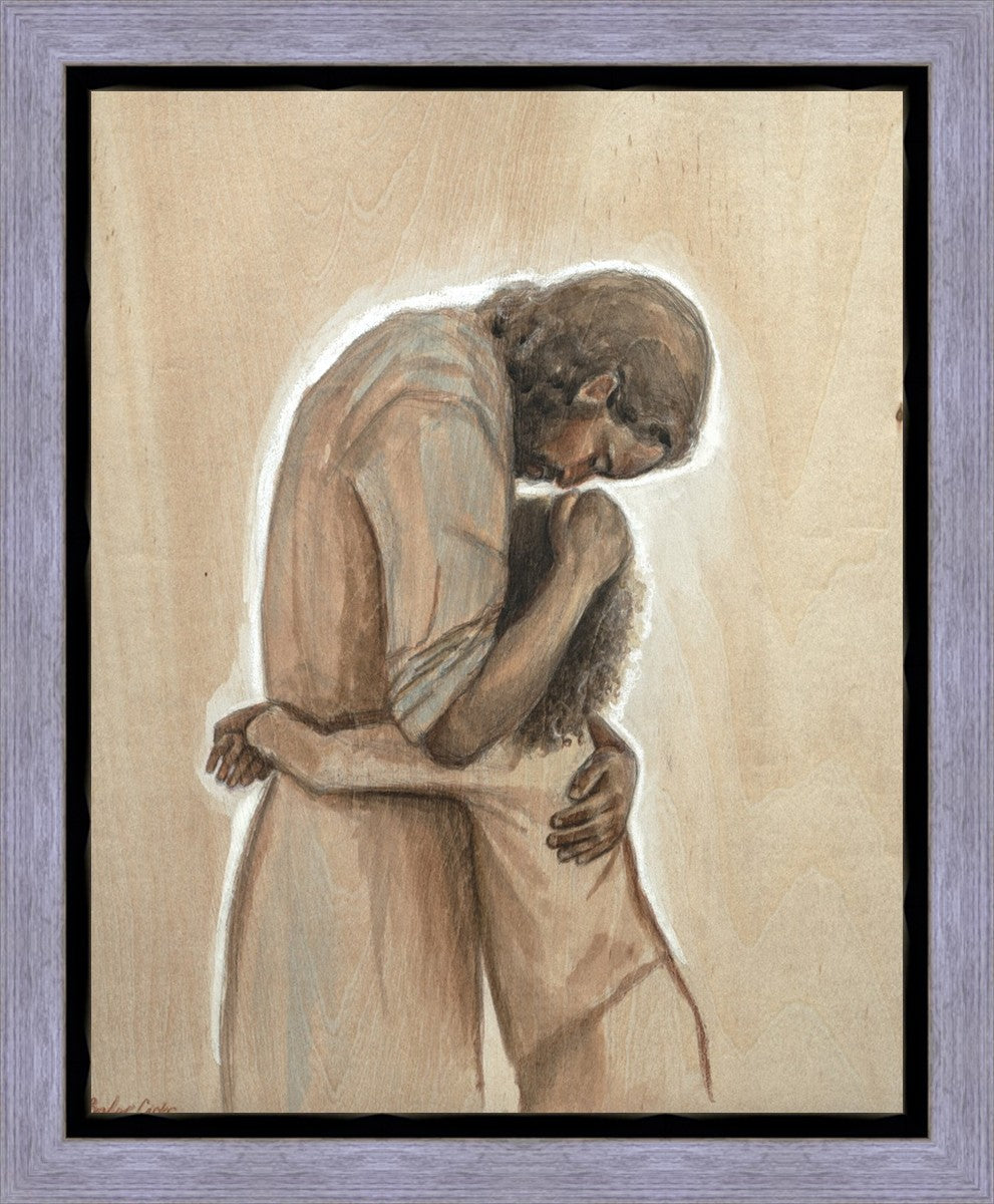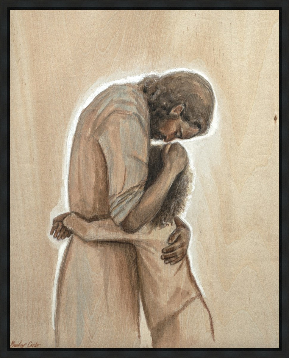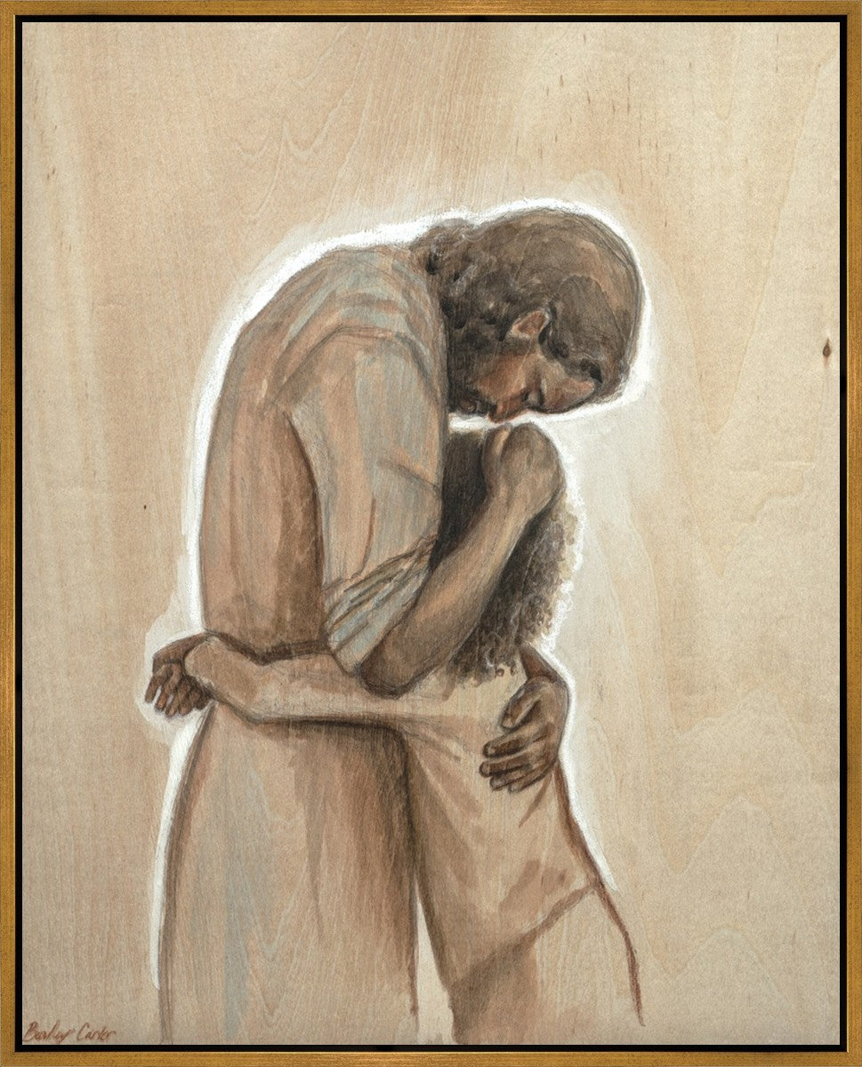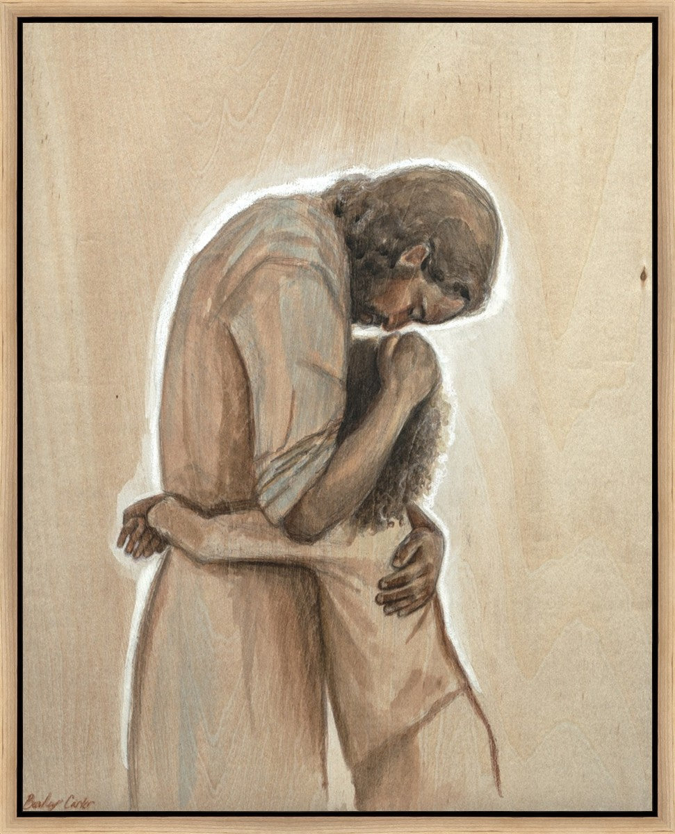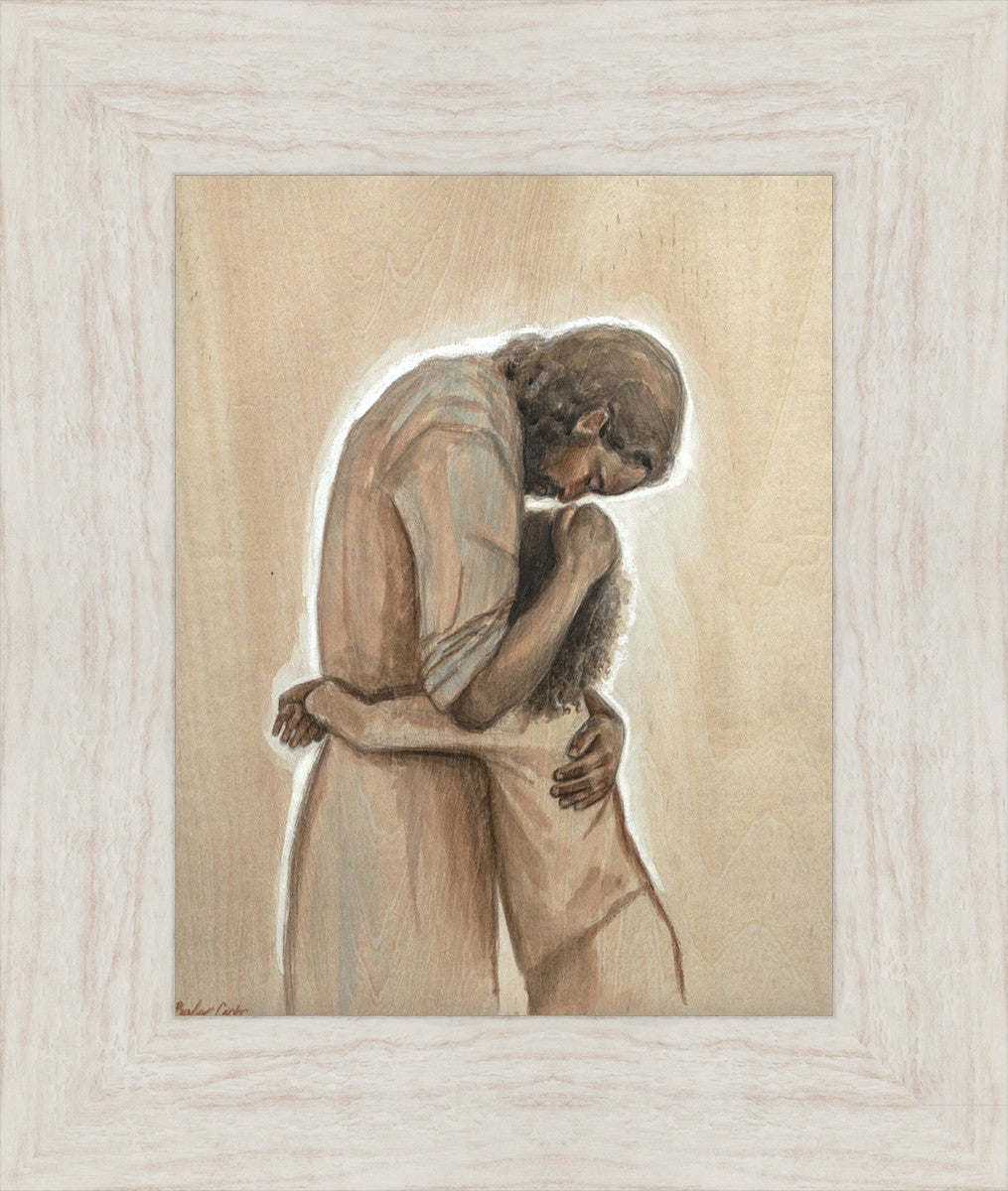 Drawn on wood, Hearts Home depicts the Savior embracing a young child.