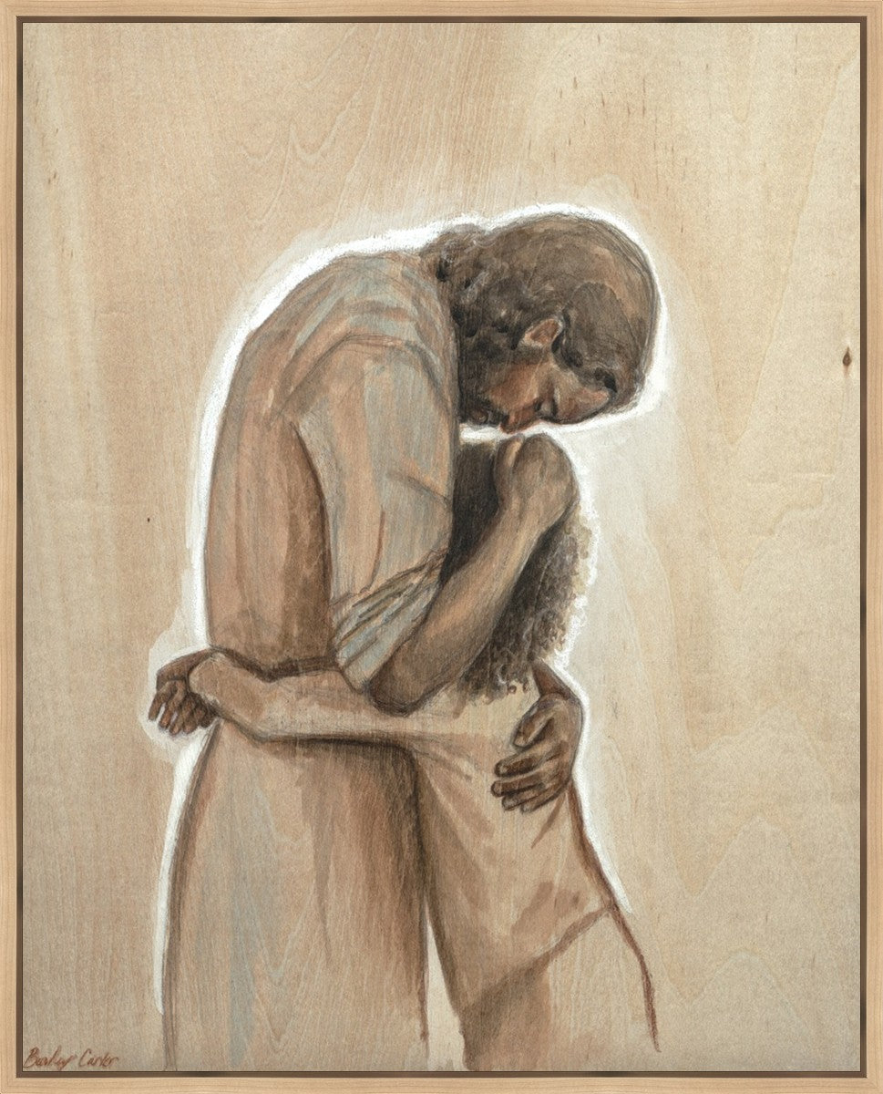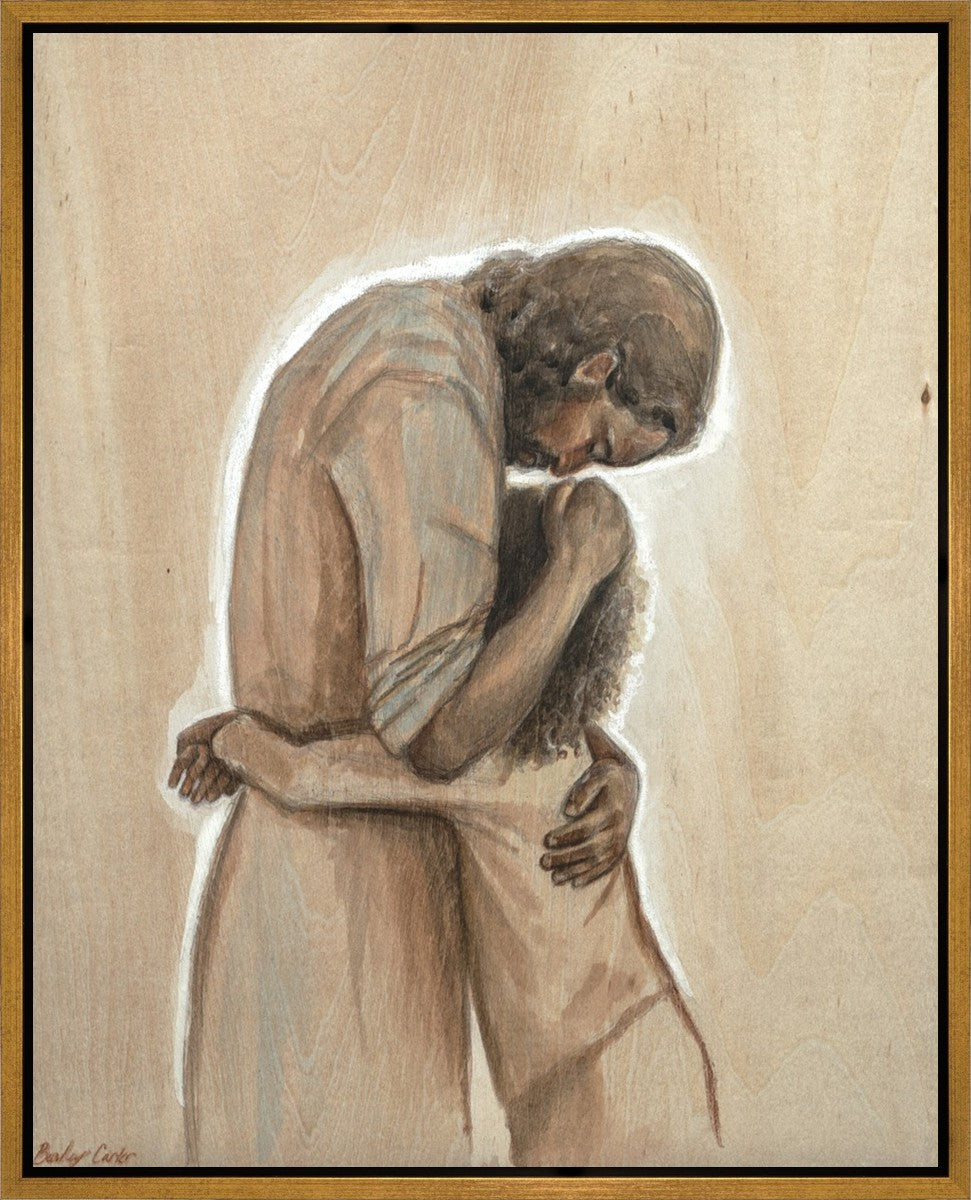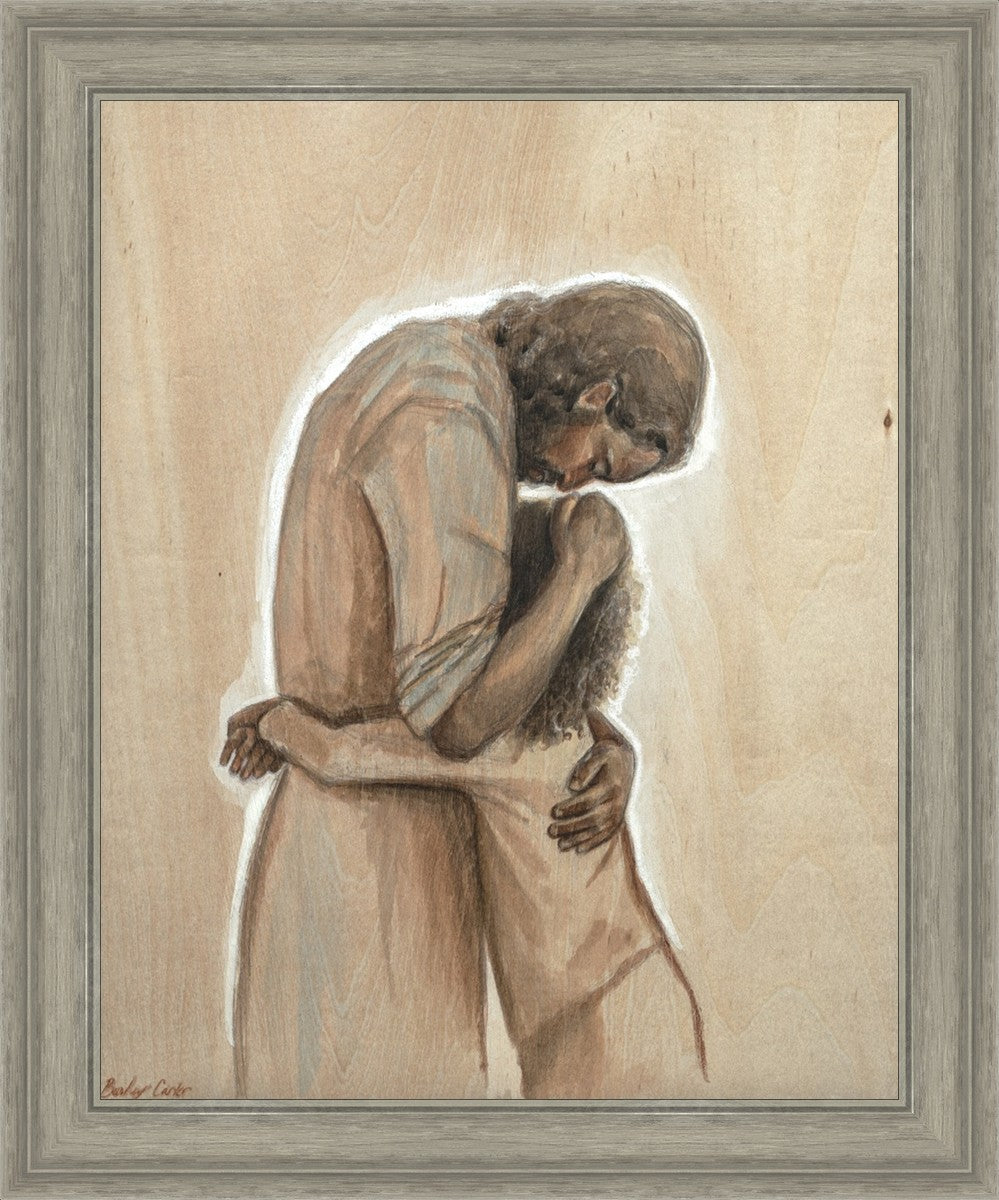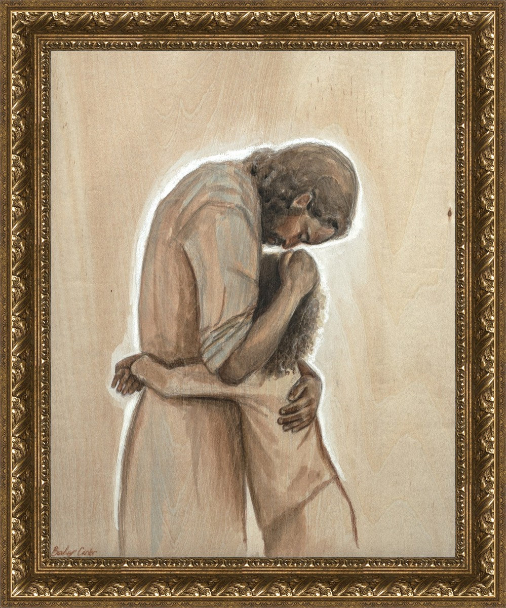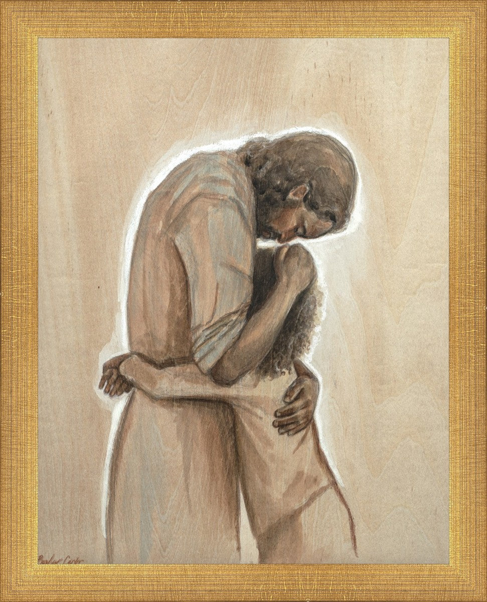 Drawn on wood, Hearts Home depicts the Savior embracing a young child.