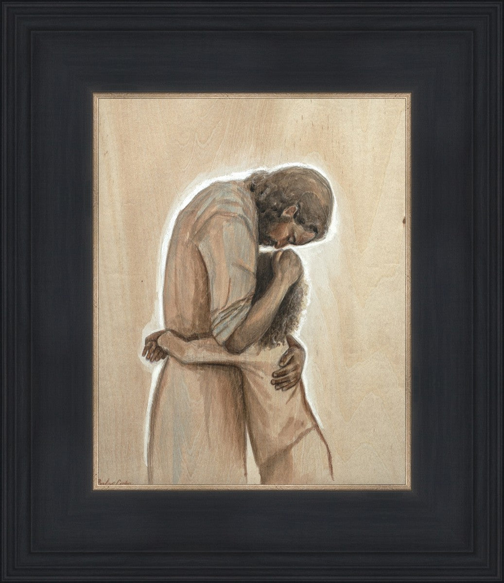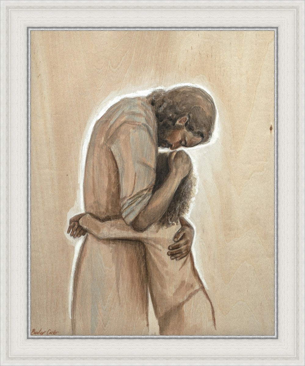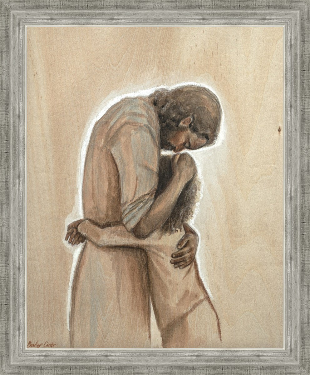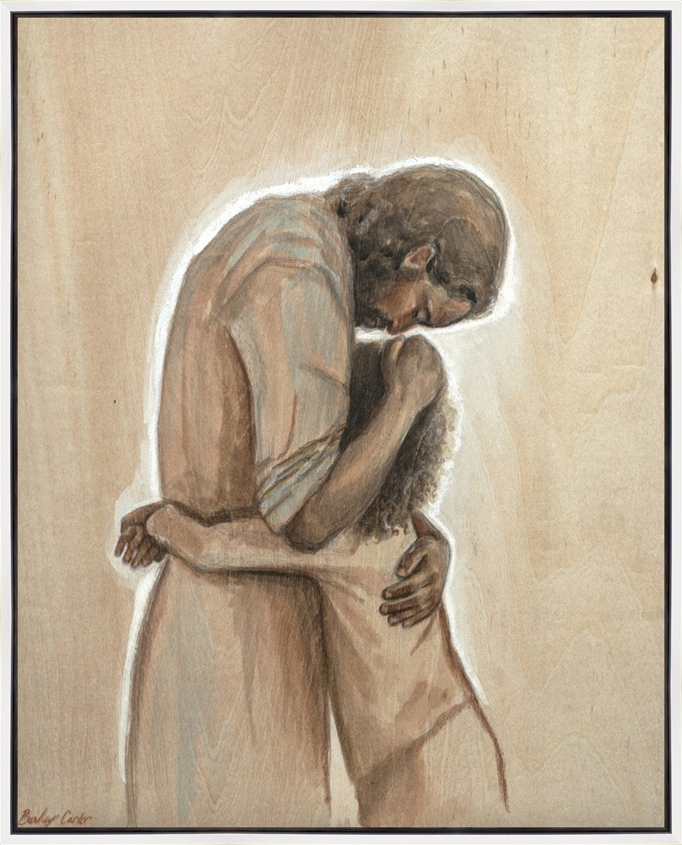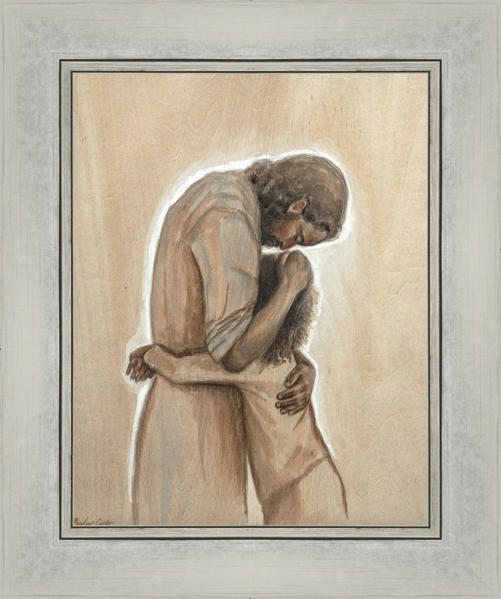 Drawn on wood, Hearts Home depicts the Savior embracing a young child.
