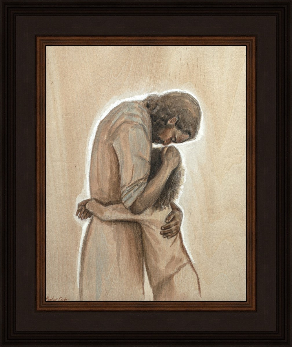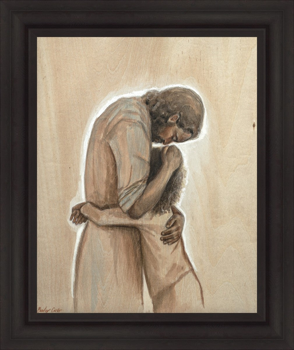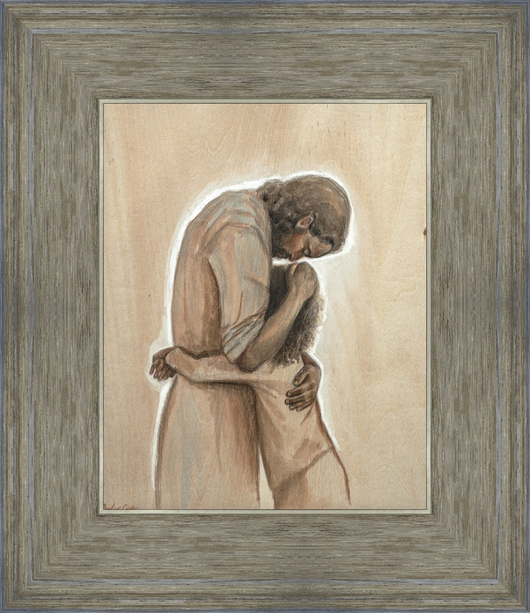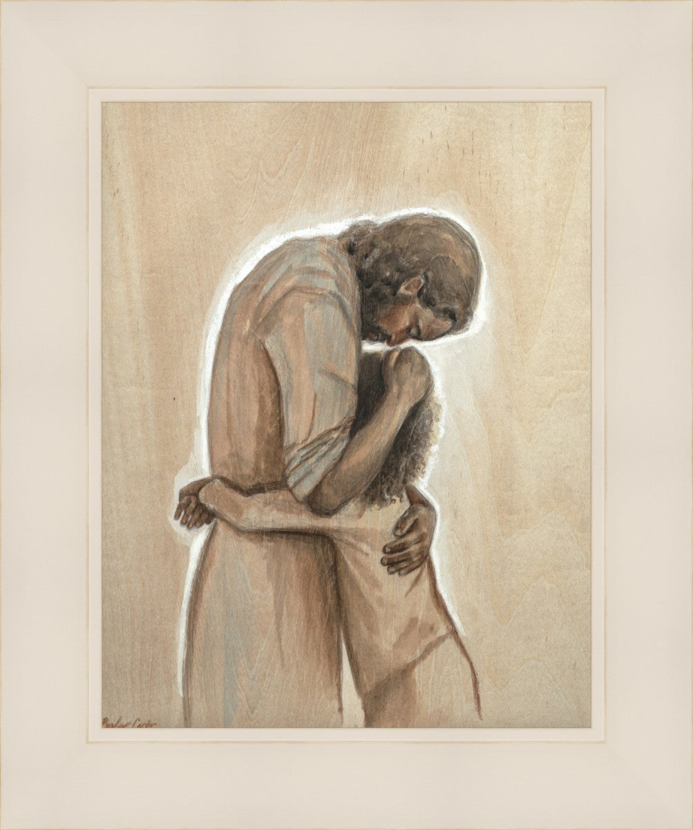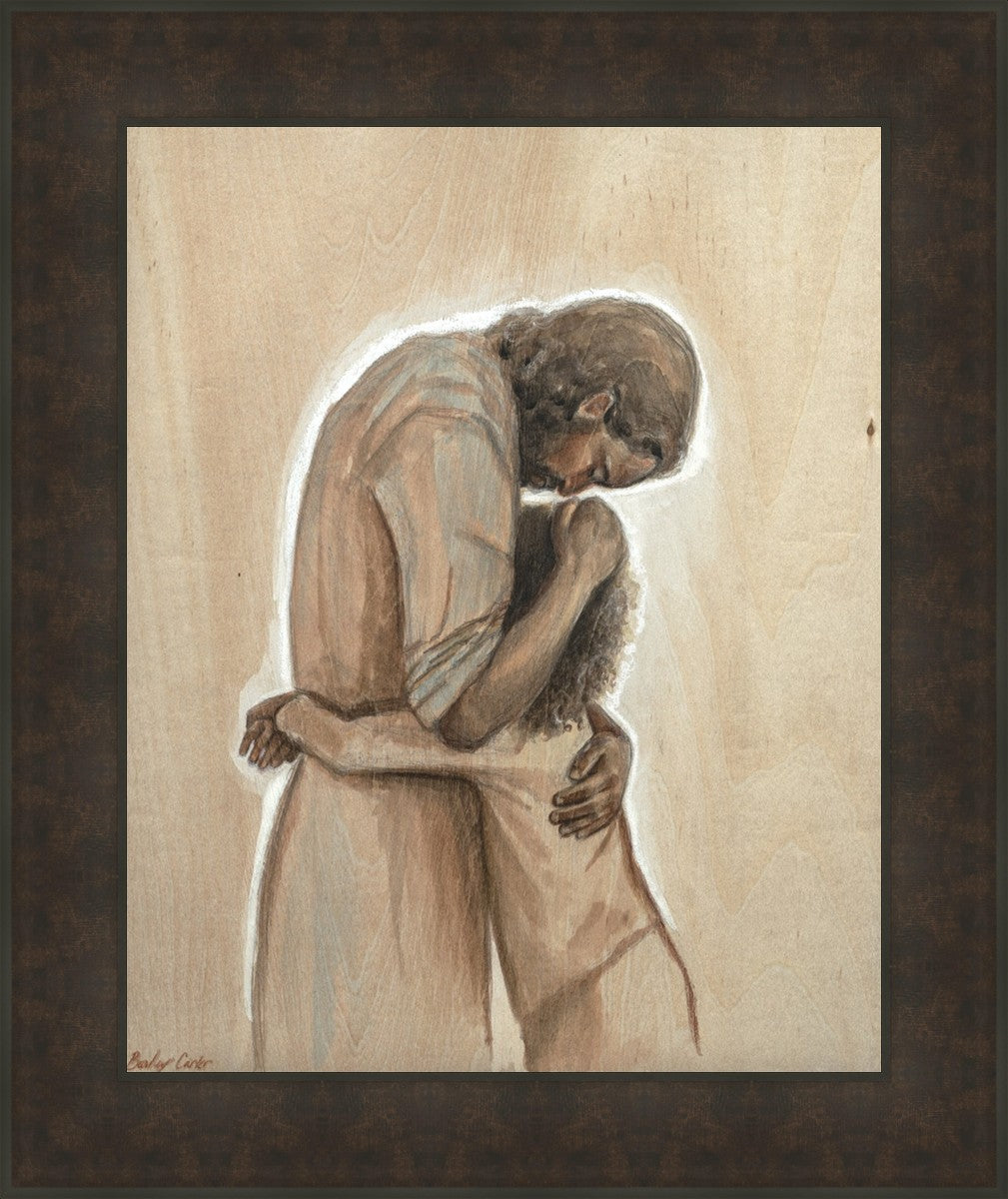 Drawn on wood, Hearts Home depicts the Savior embracing a young child.