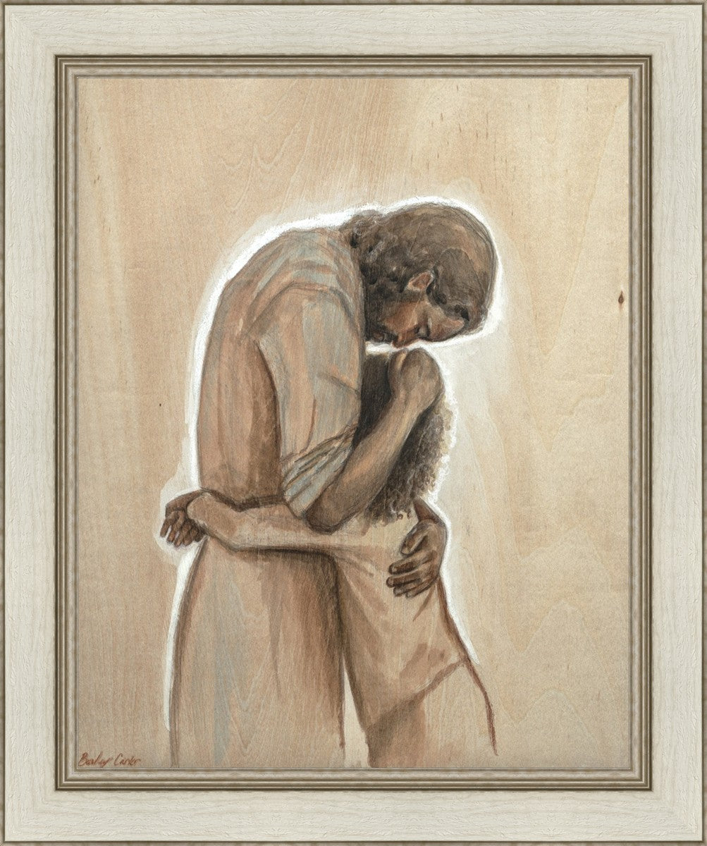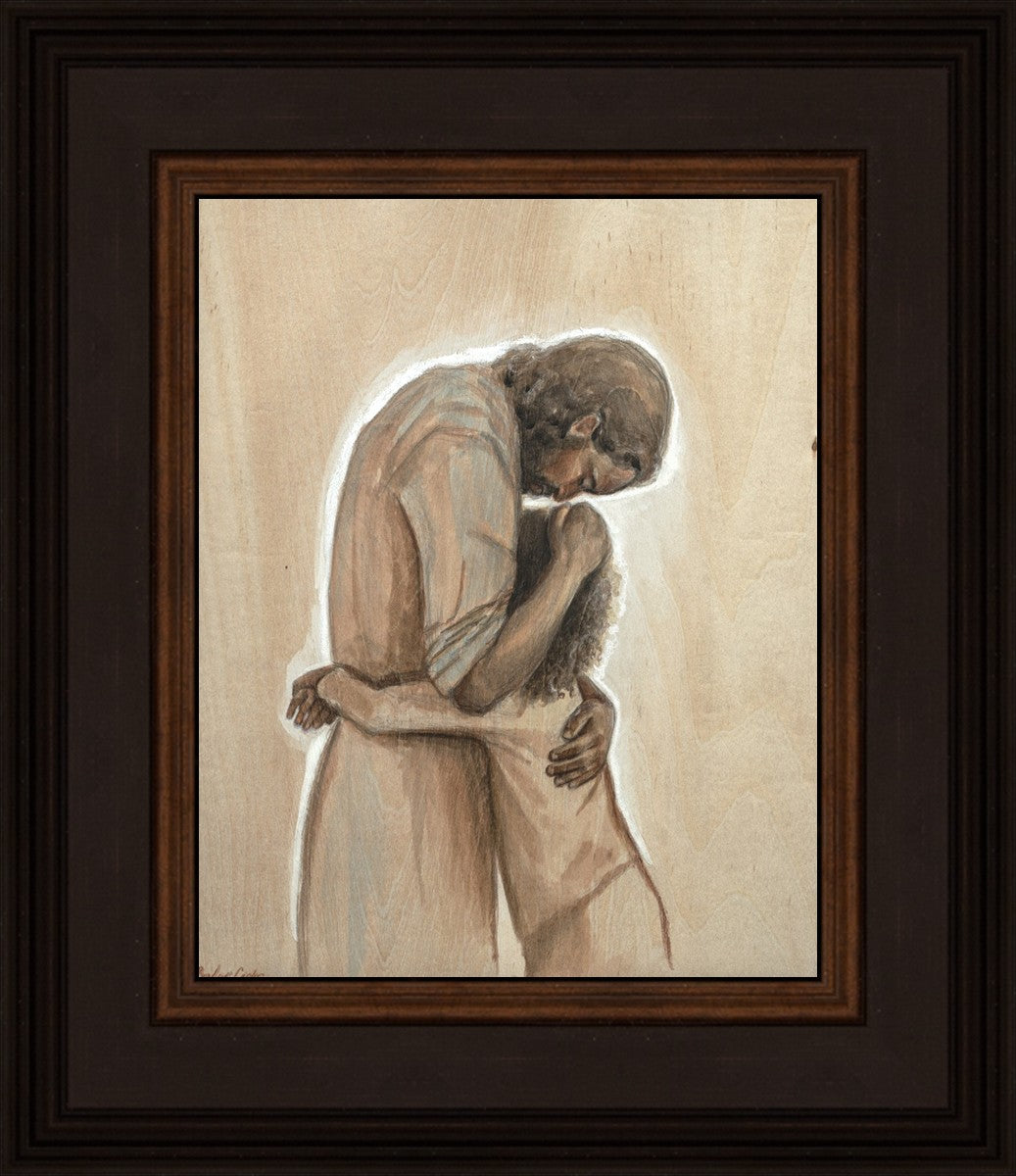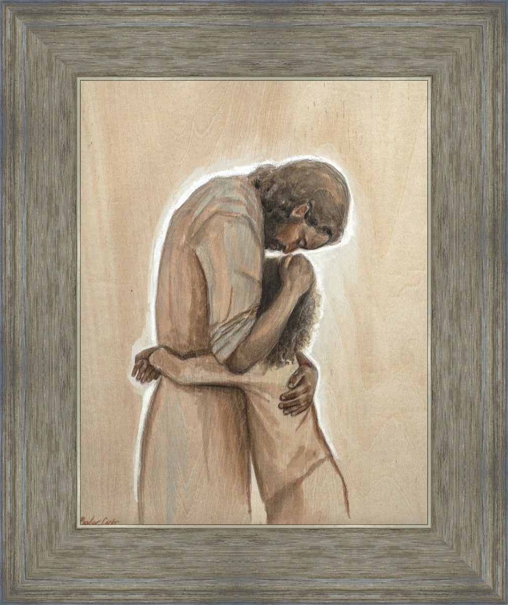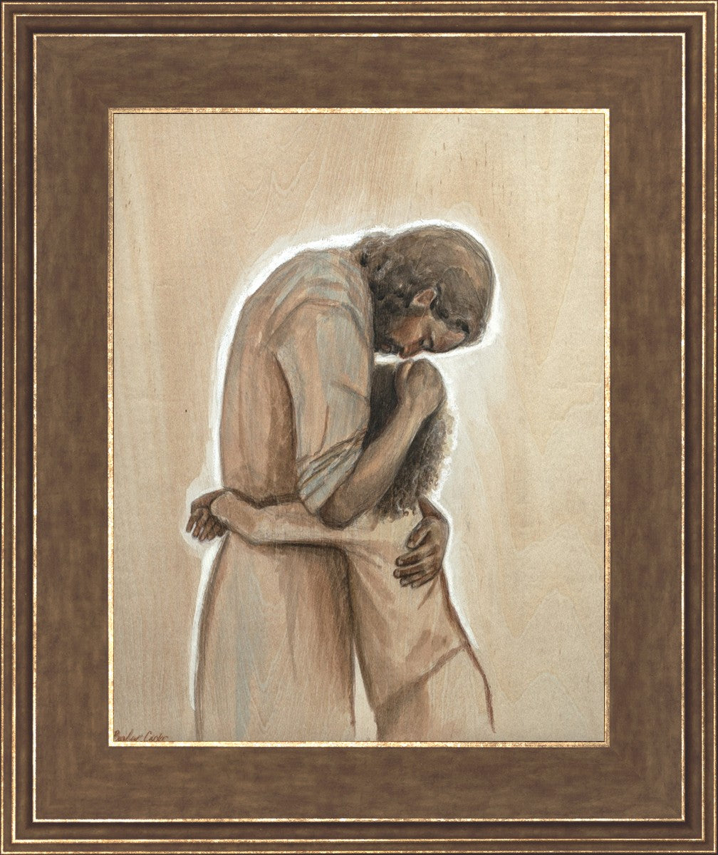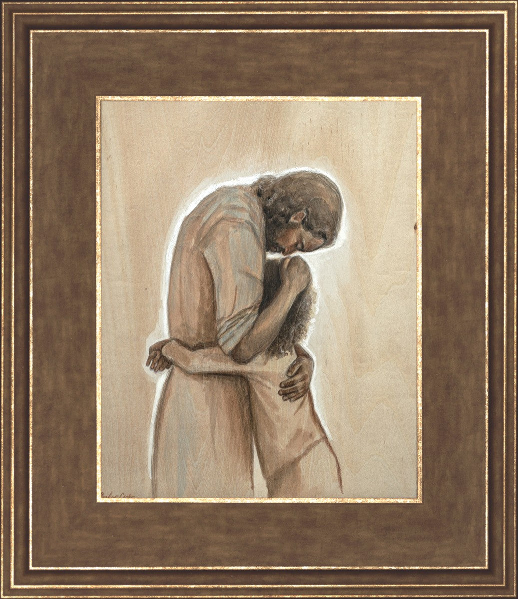 Drawn on wood, Hearts Home depicts the Savior embracing a young child.