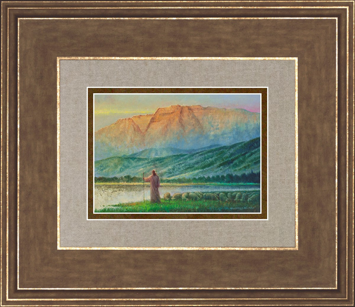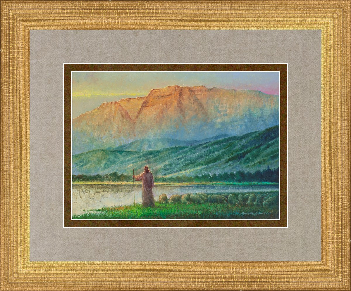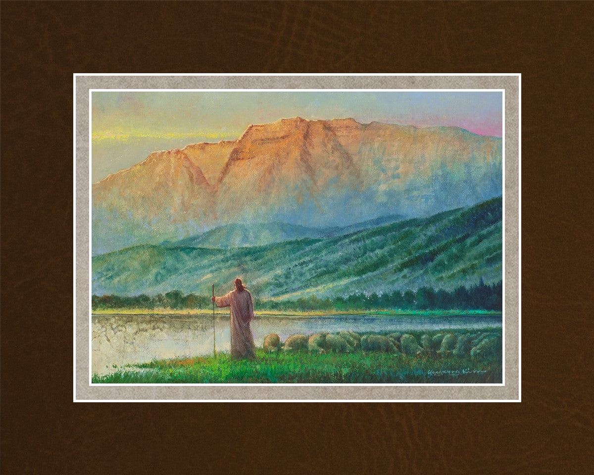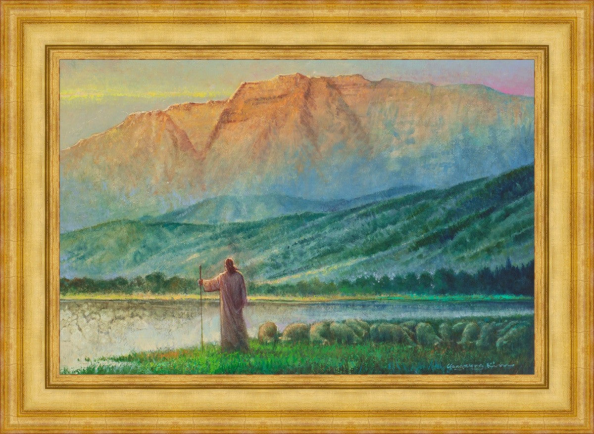 As the day fades away, Jesus stands amidst a scene of tranquility and divine harmony. A flock of sheep surrounds him, their presence symbolizing trust and reliance on his guidance. A mountain rises tall in the background, its peaks reaching towards the heavens. The serenity found in the presence of the Good Shepherd reminds us of the everlasting peace he brings amidst nature's awe-inspiring beauty.