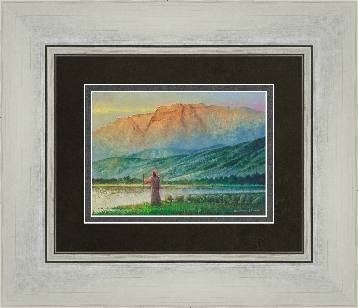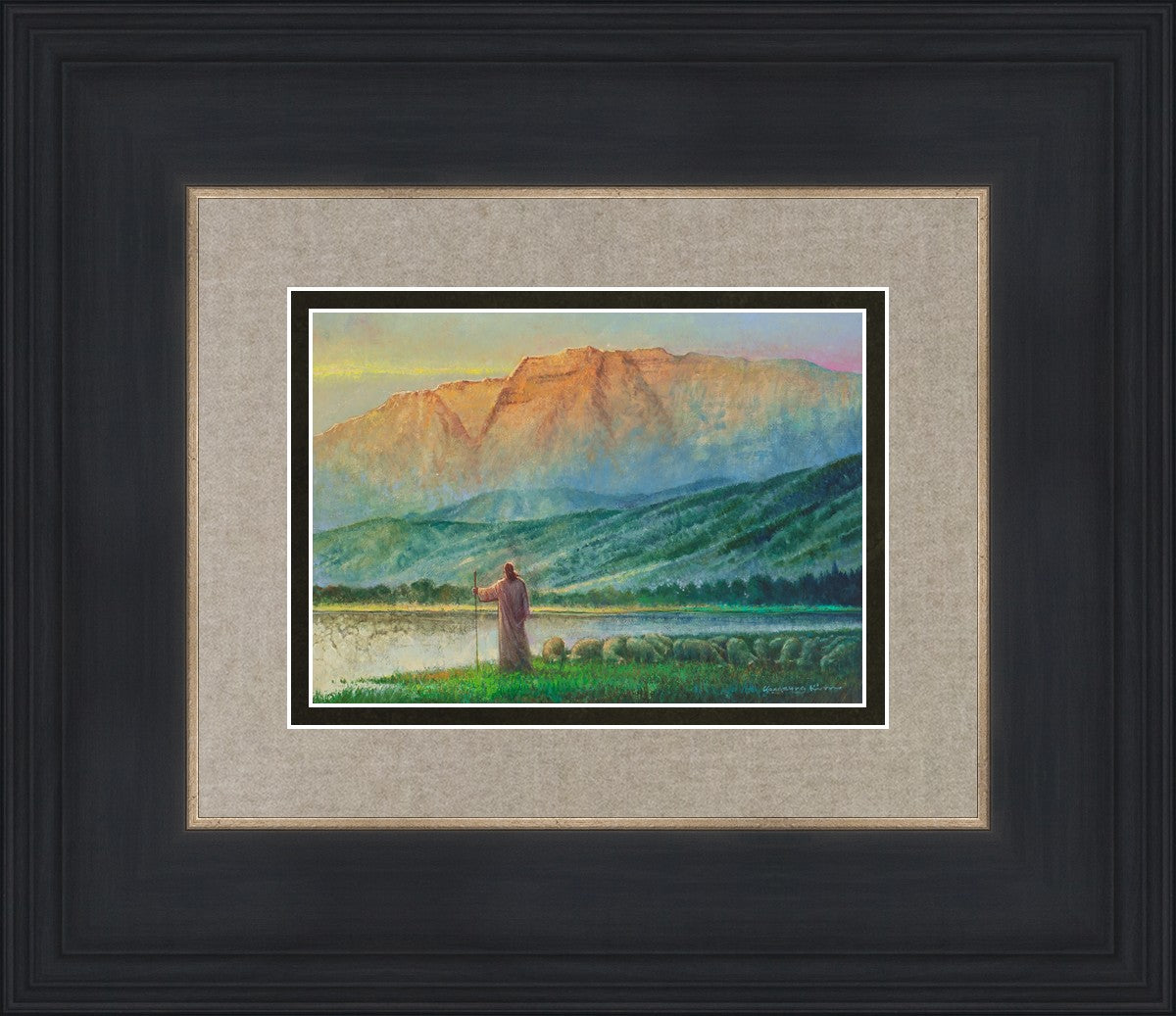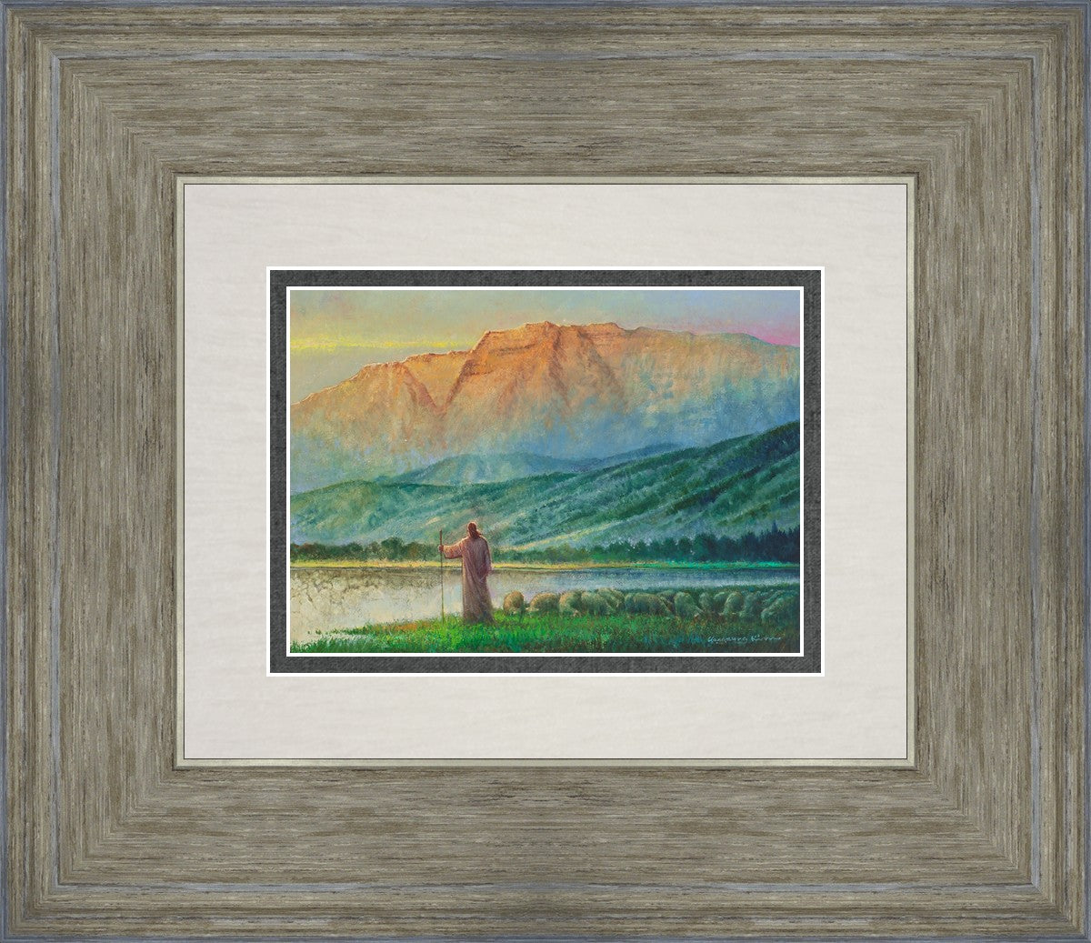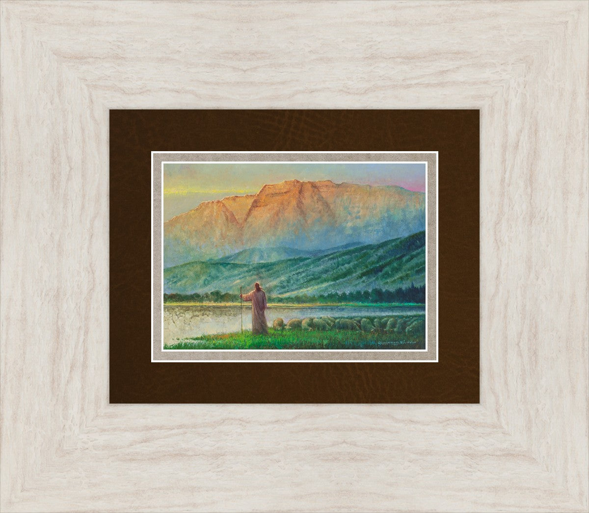 As the day fades away, Jesus stands amidst a scene of tranquility and divine harmony. A flock of sheep surrounds him, their presence symbolizing trust and reliance on his guidance. A mountain rises tall in the background, its peaks reaching towards the heavens. The serenity found in the presence of the Good Shepherd reminds us of the everlasting peace he brings amidst nature's awe-inspiring beauty.