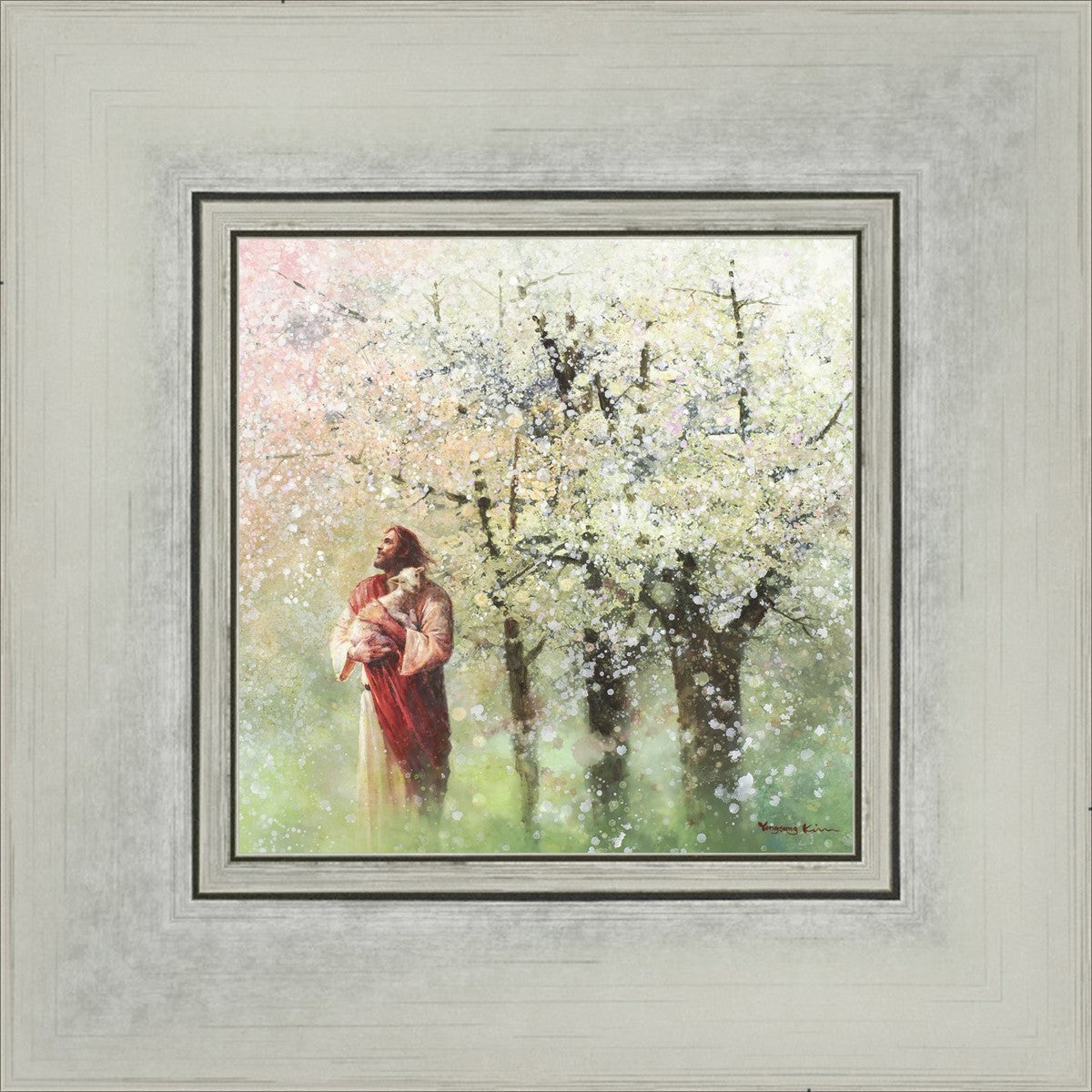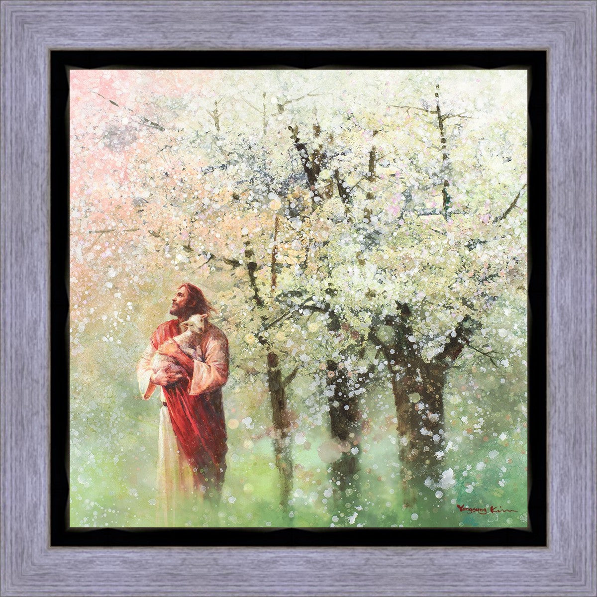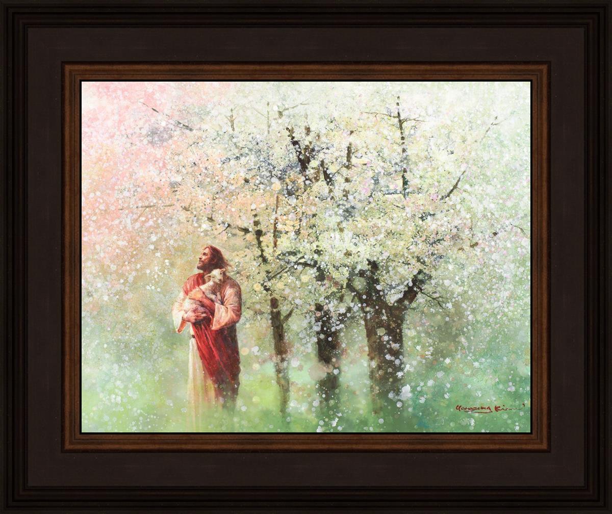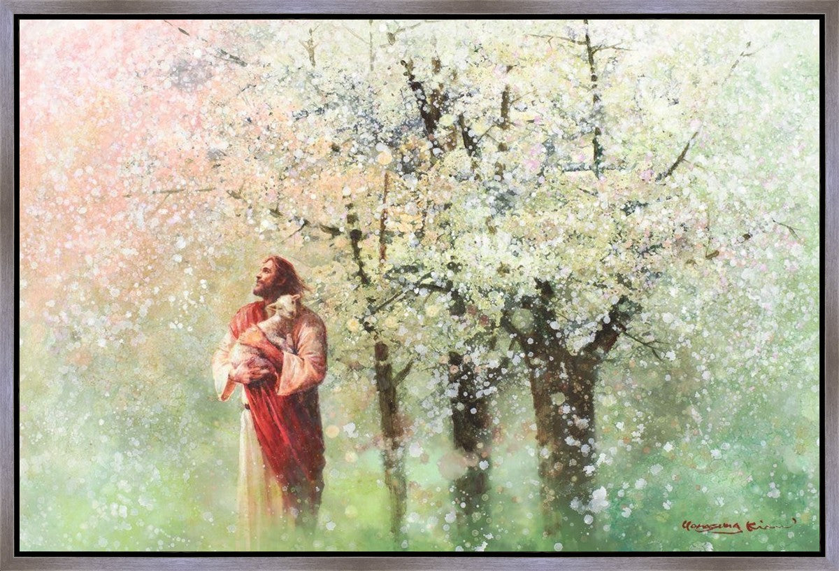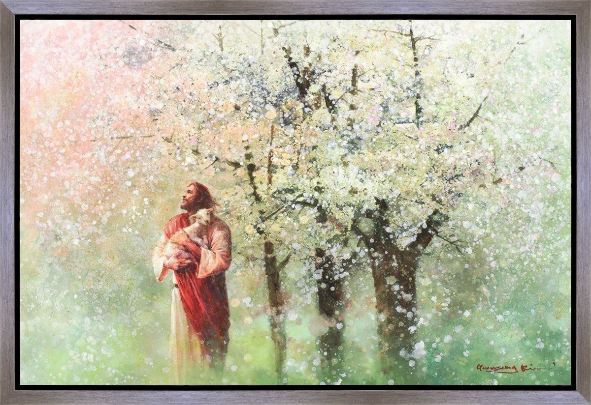Heavenly Blossoms" by Yongsung Kim portrays Jesus clad in a red robe cradling a lamb near a blossoming tree, symbolizing divine care and renewal.