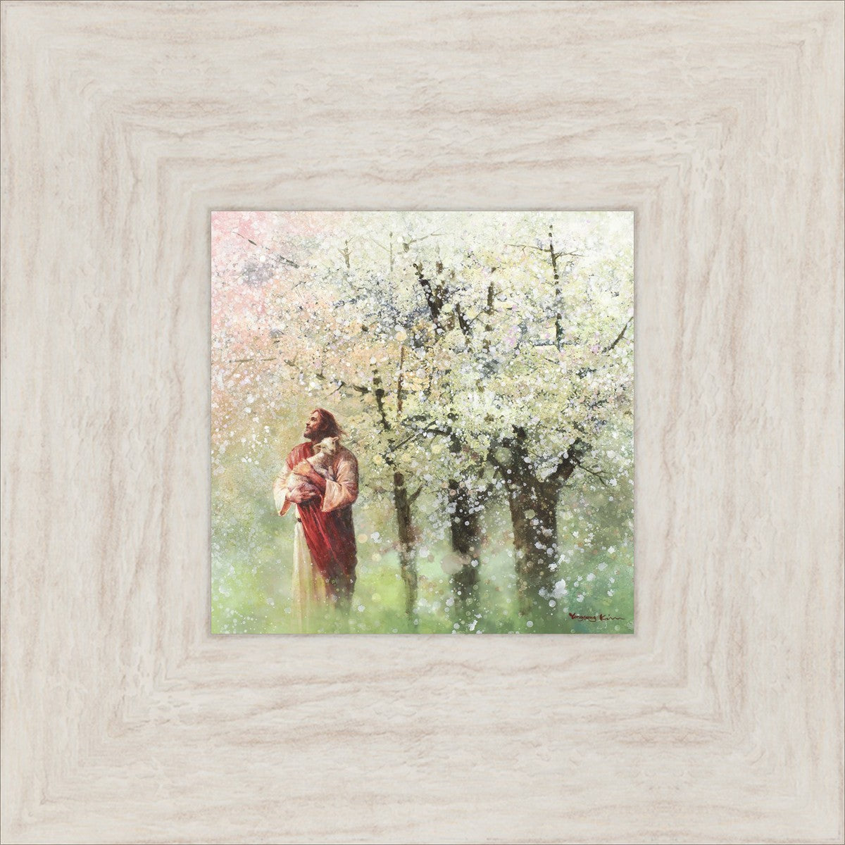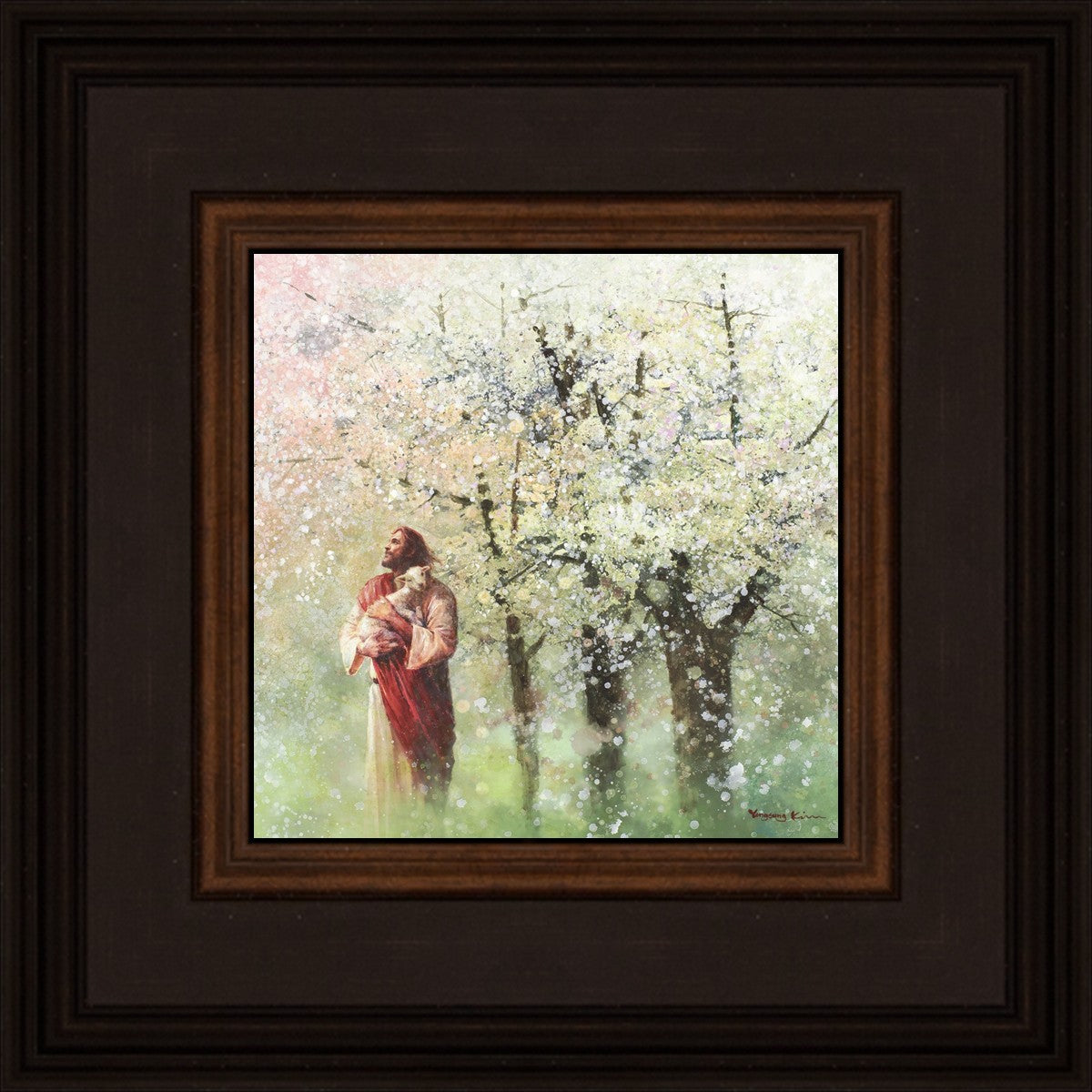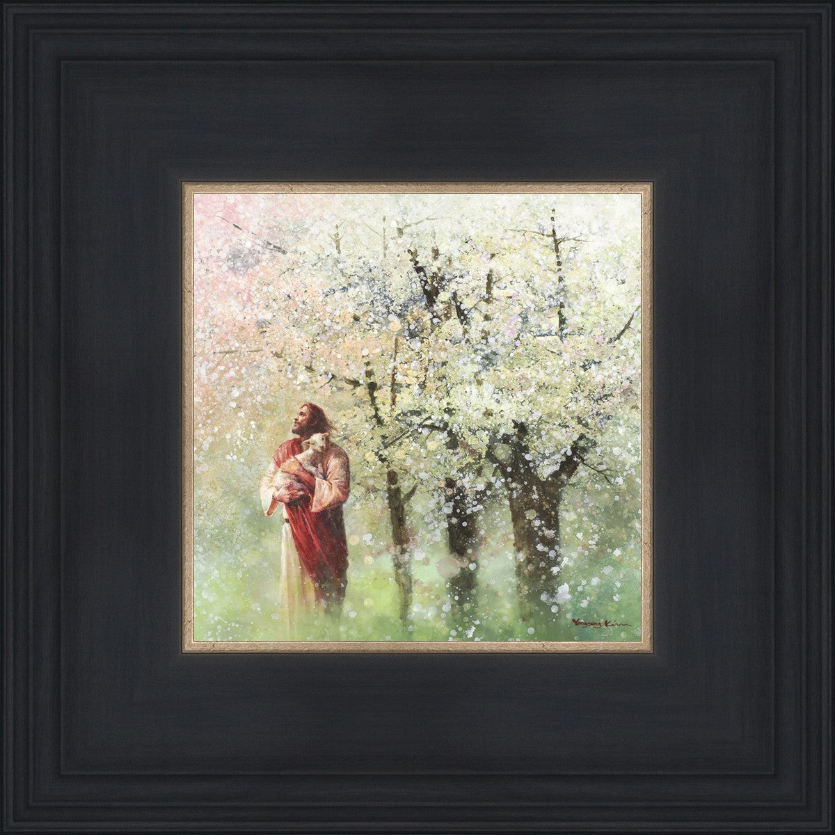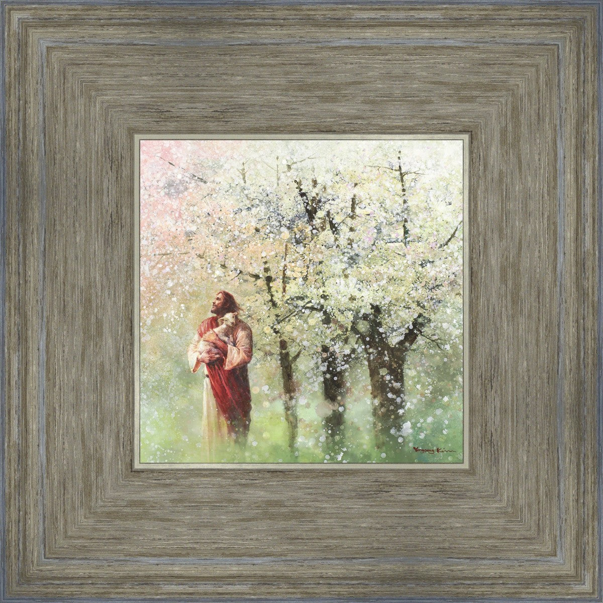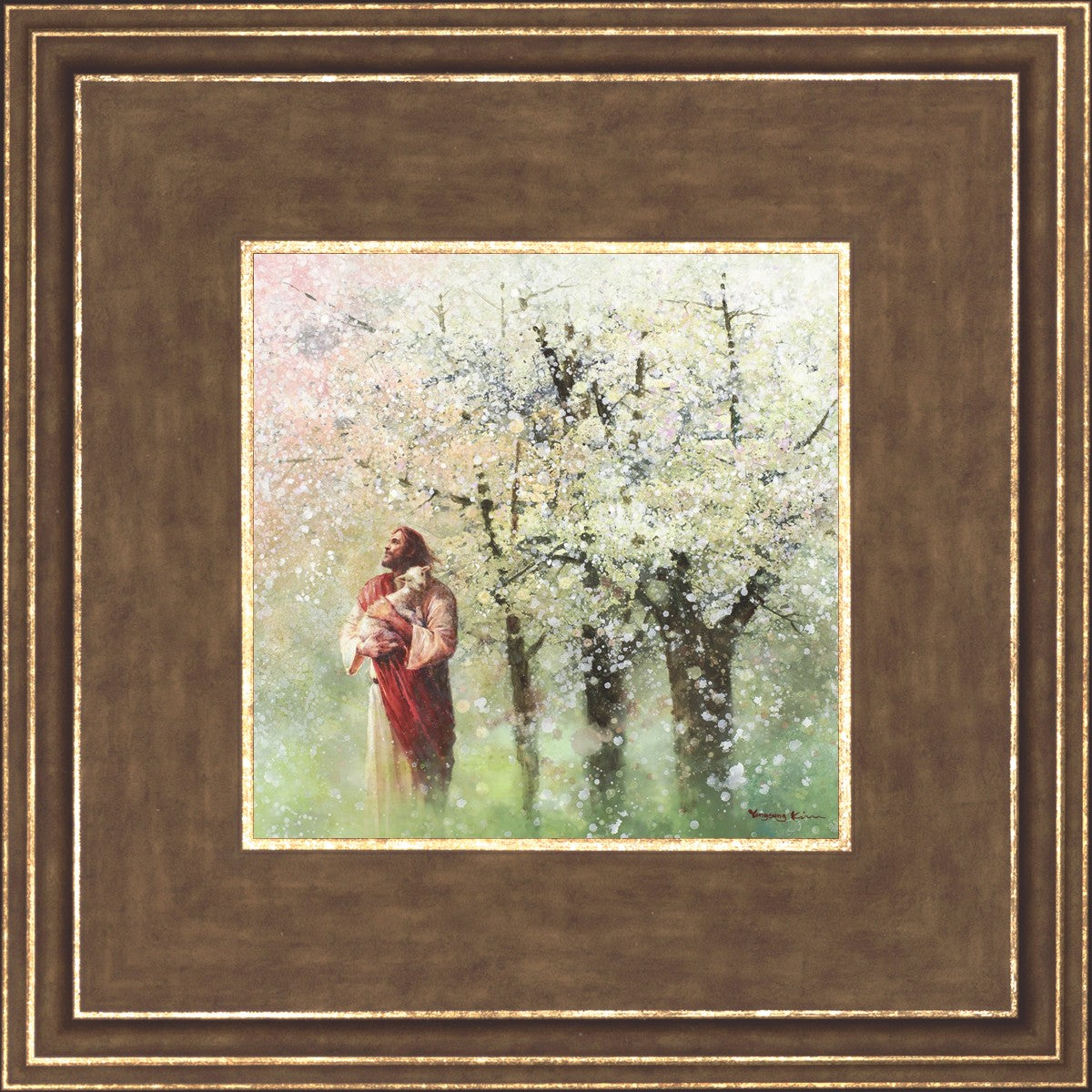 Heavenly Blossoms" by Yongsung Kim portrays Jesus clad in a red robe cradling a lamb near a blossoming tree, symbolizing divine care and renewal.