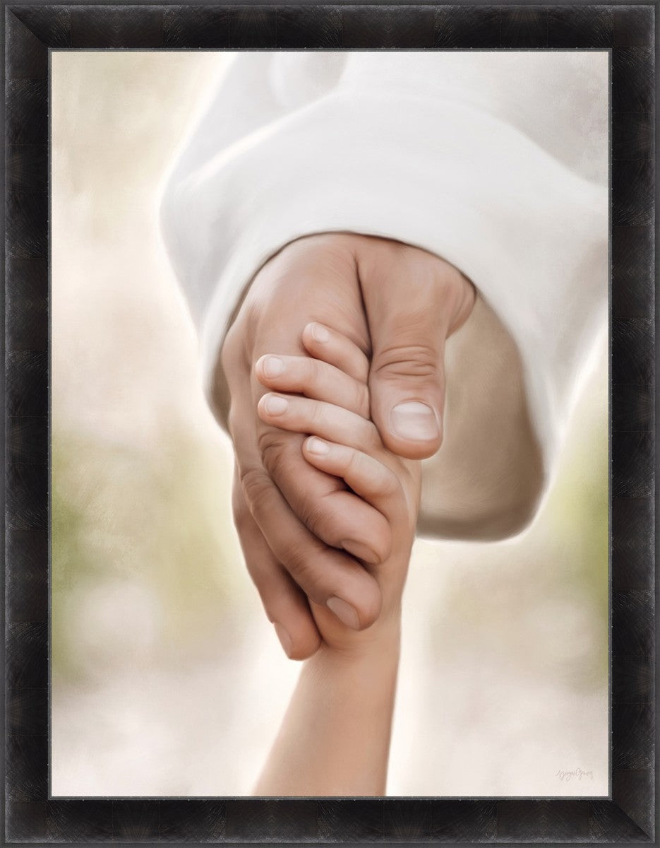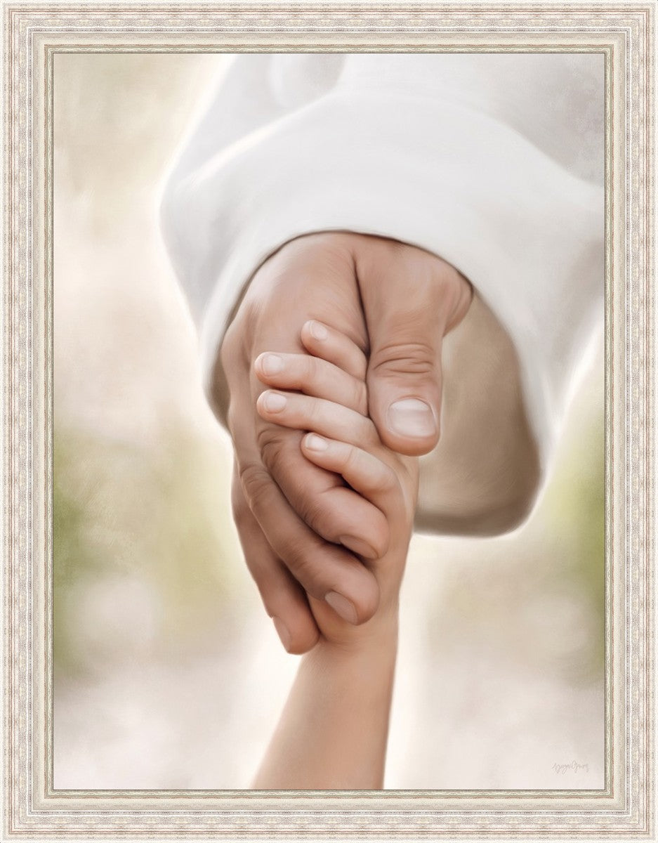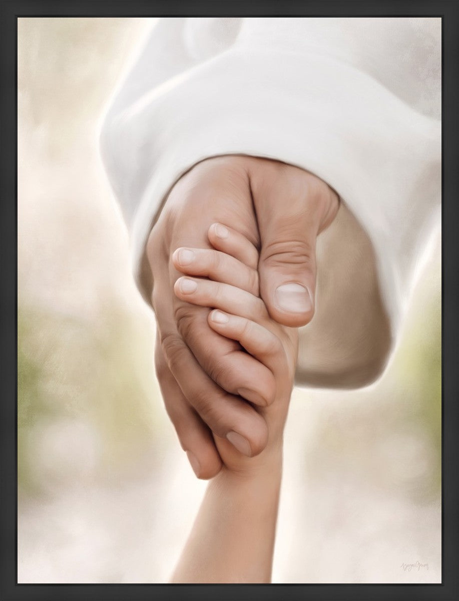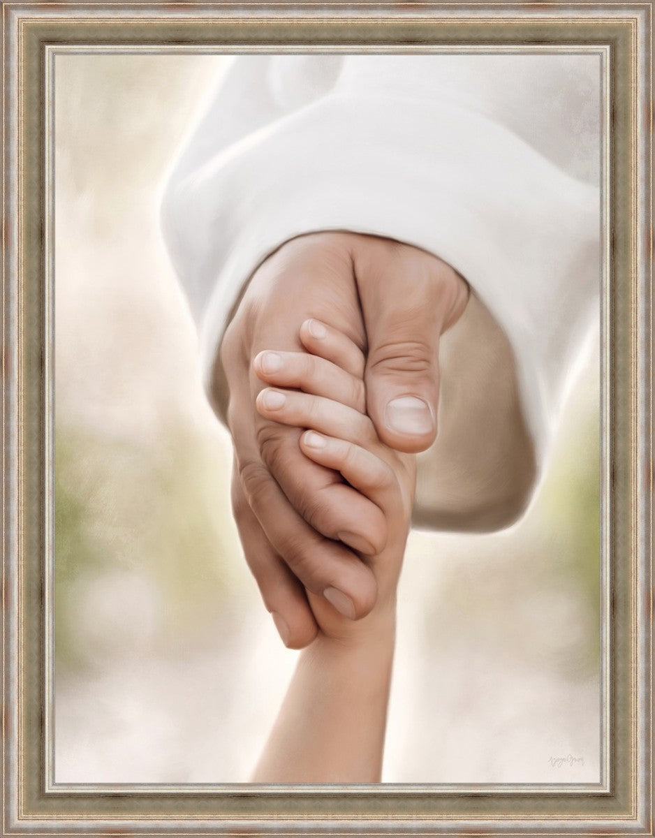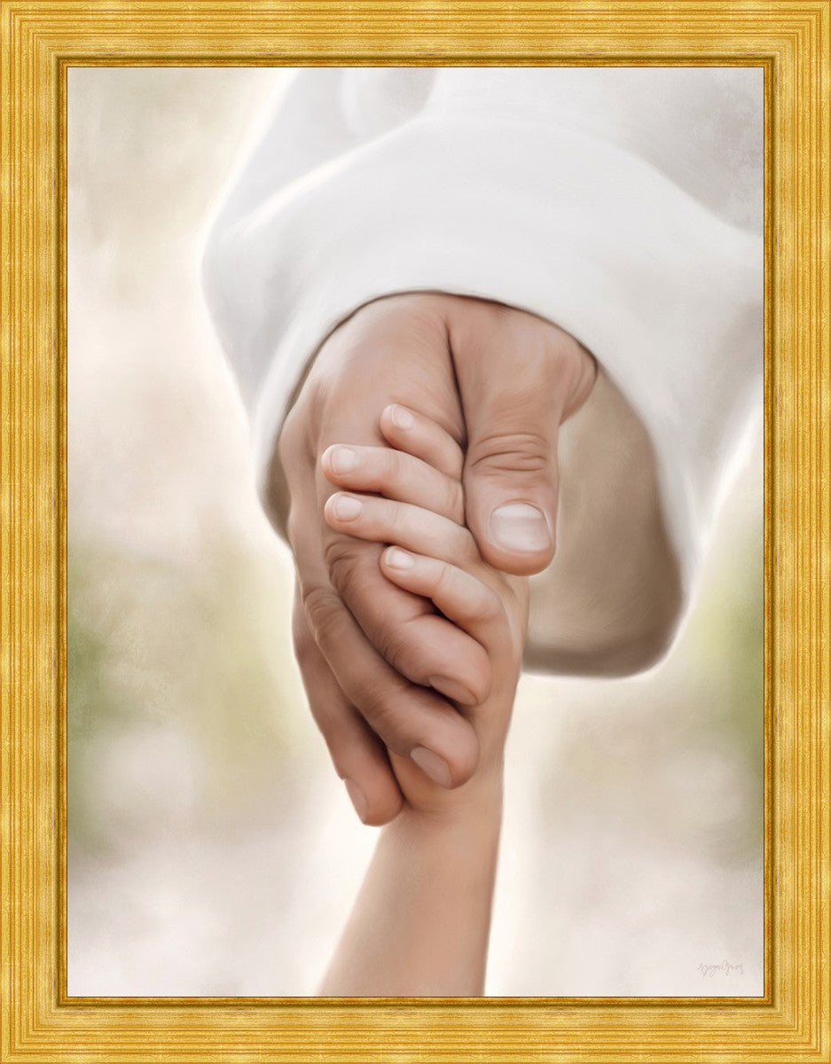 A beautiful painted portrait of the Savior holding a little child's hand as they walk.