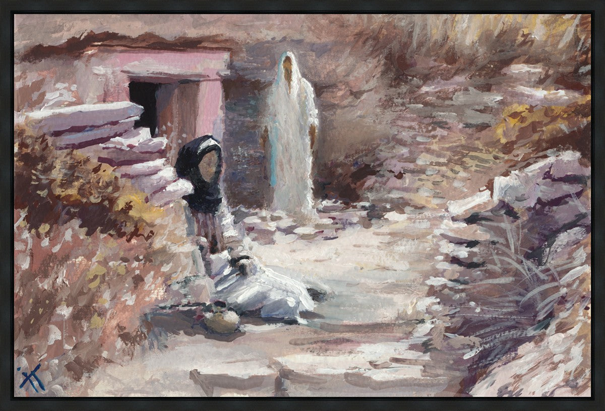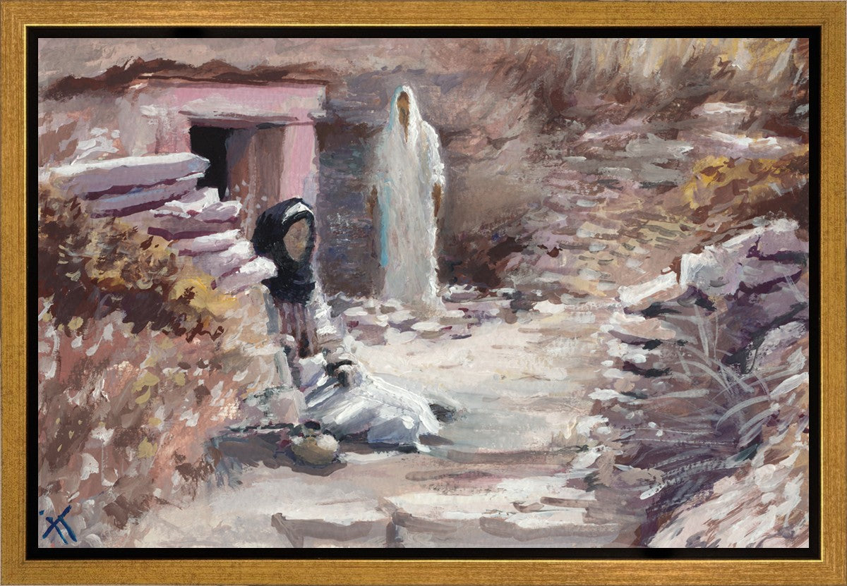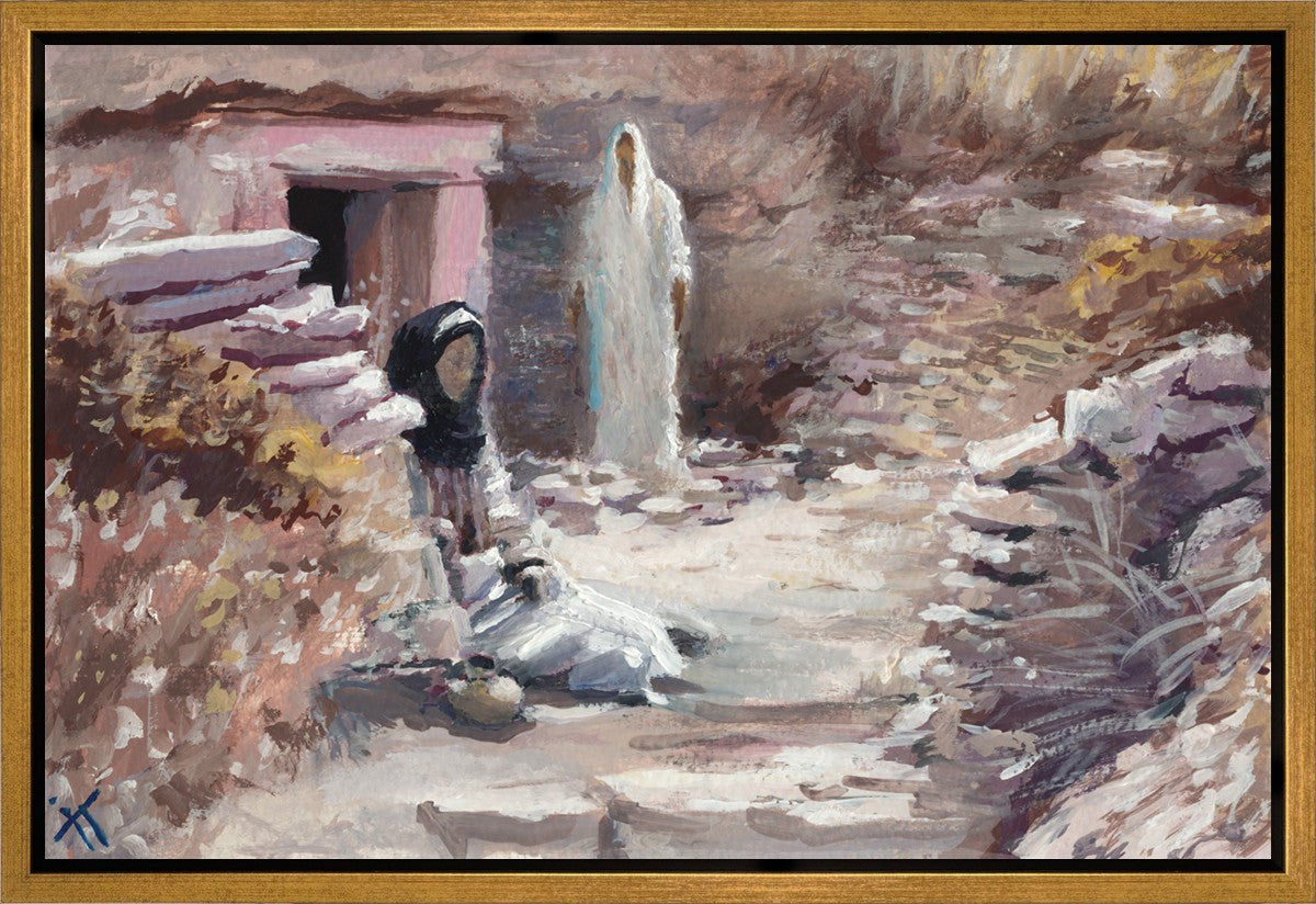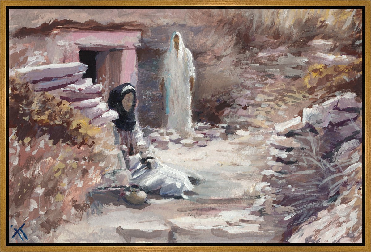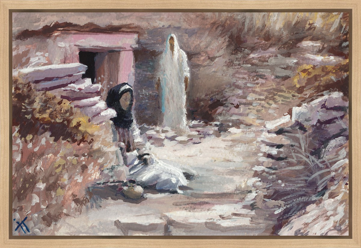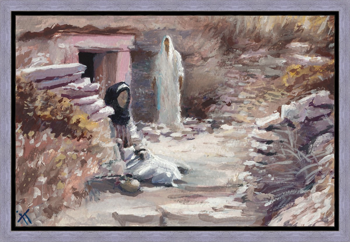 This painting was a consolation gift to a sister in our Stake whose husband died. Sooner or later each of us will experience death of loved ones and will ask oneself the question "Will I still see you again?" The image of the resurrected Christ appearing to Mary is an attempt to give hope and comfort in the midst of grief and loss. This painting depicts the touching moment between grief and hopelessness and everlasting joy. It serves as a reminder that even in the darkest moments of life, there is hope and light, and that our loved ones who have passed away are not truly gone, but live on in the heavenly spheres.