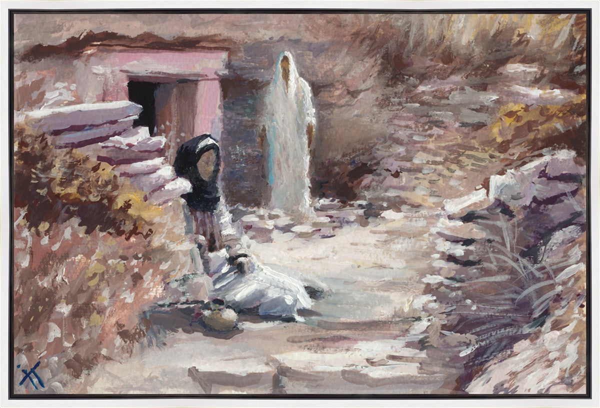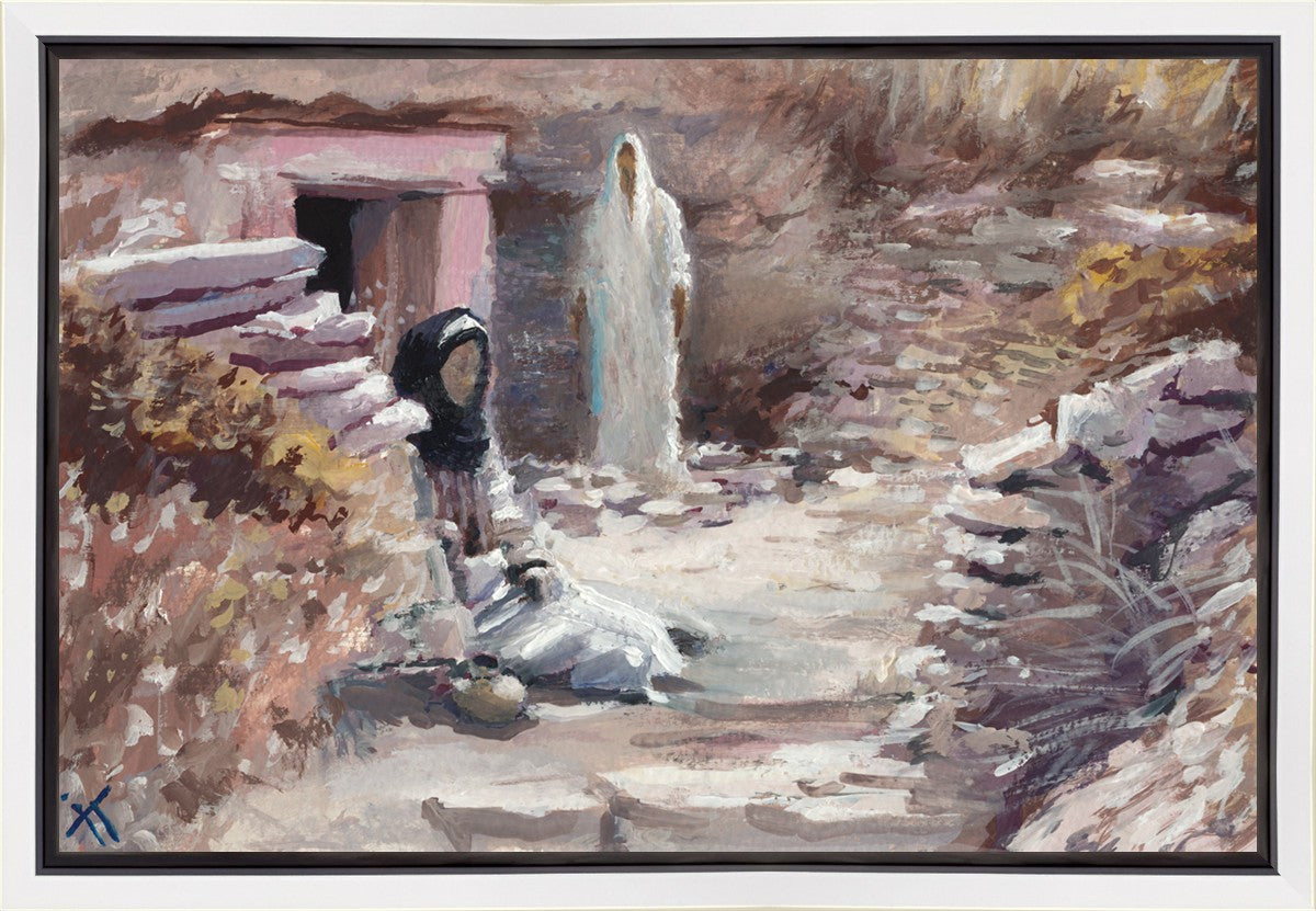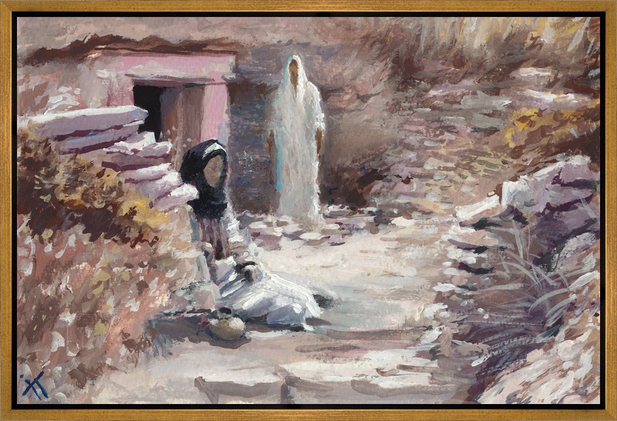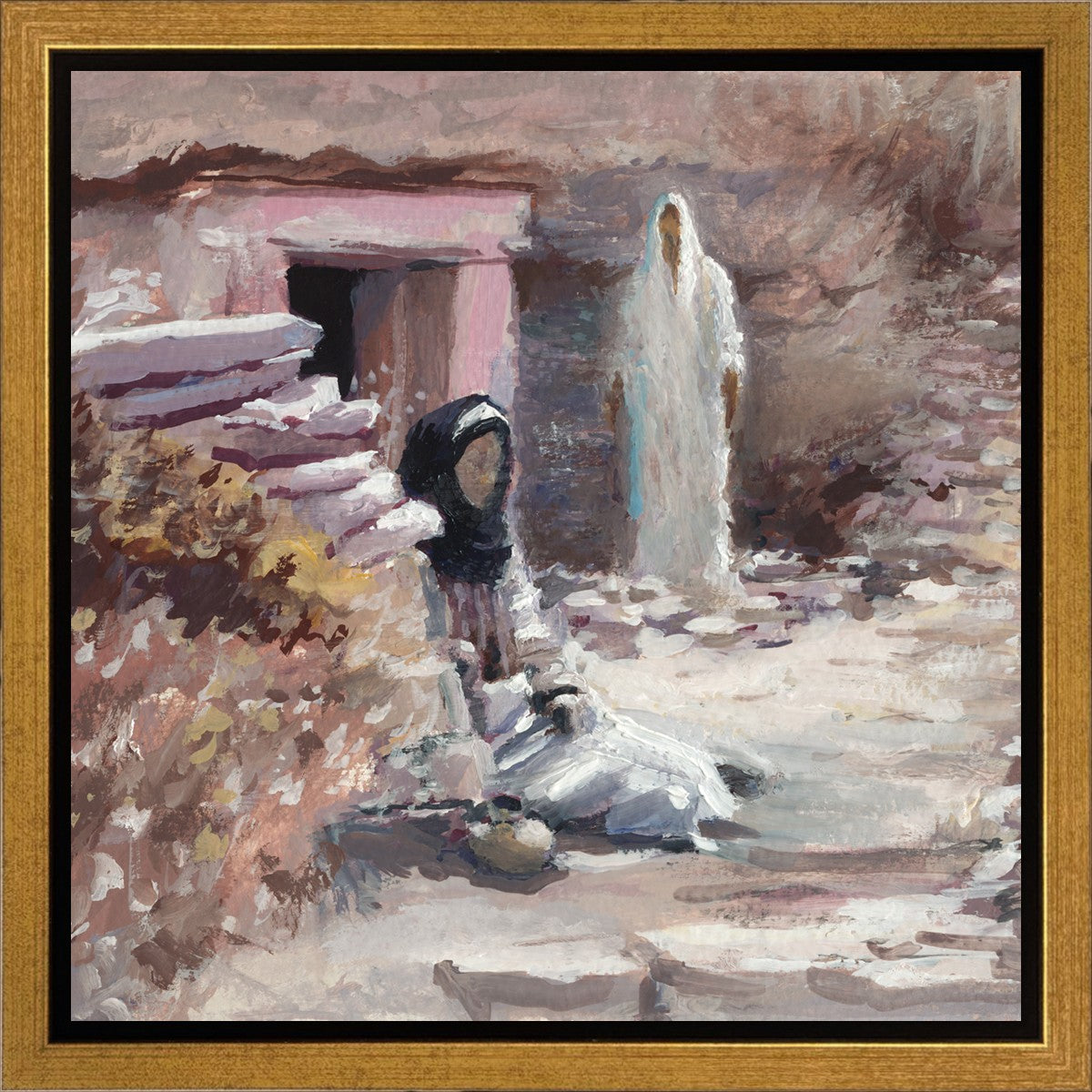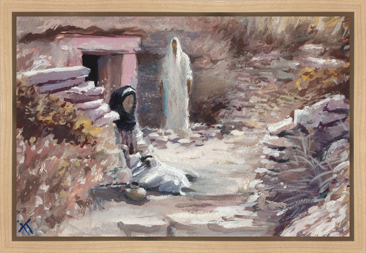 This painting was a consolation gift to a sister in our Stake whose husband died. Sooner or later each of us will experience death of loved ones and will ask oneself the question "Will I still see you again?" The image of the resurrected Christ appearing to Mary is an attempt to give hope and comfort in the midst of grief and loss. This painting depicts the touching moment between grief and hopelessness and everlasting joy. It serves as a reminder that even in the darkest moments of life, there is hope and light, and that our loved ones who have passed away are not truly gone, but live on in the heavenly spheres.