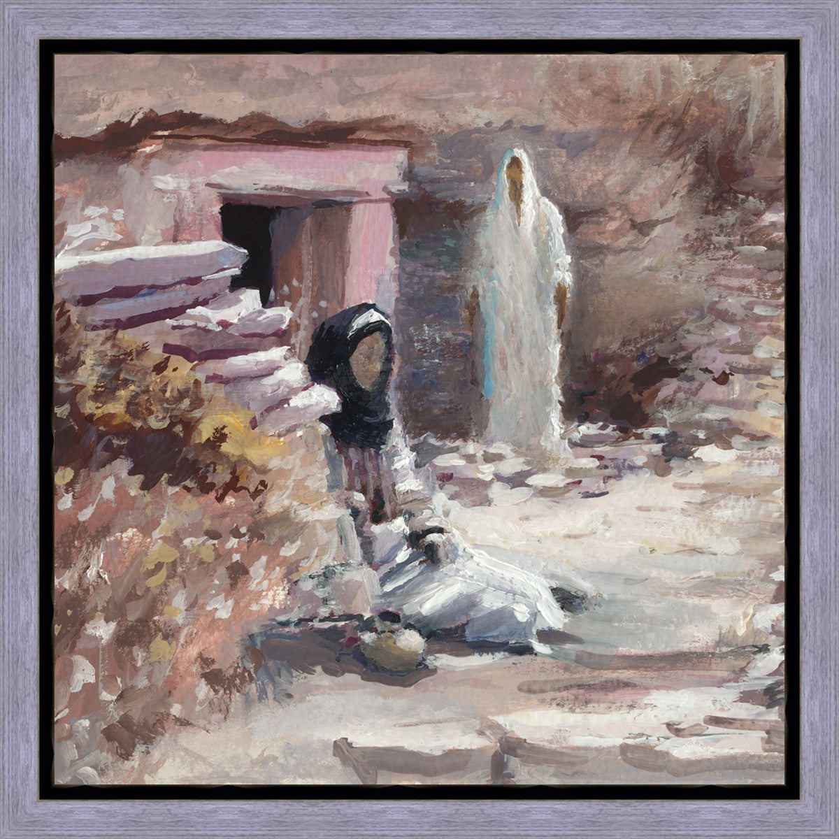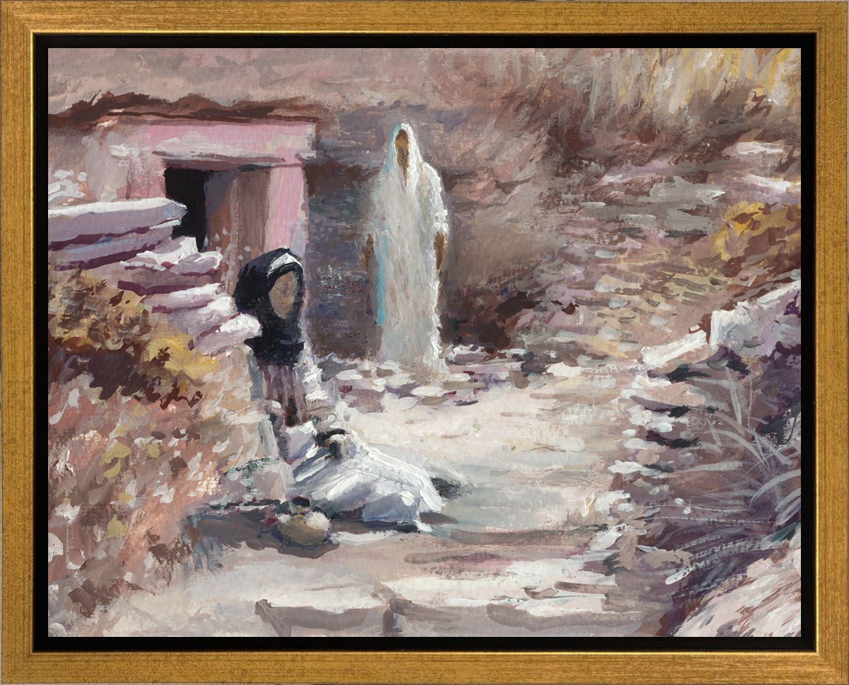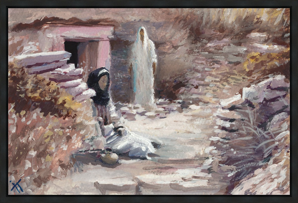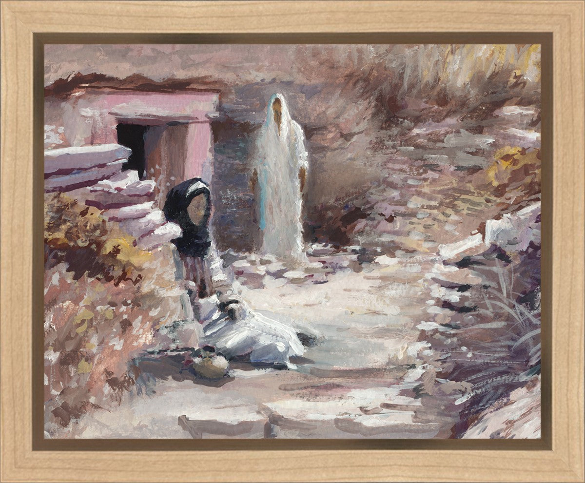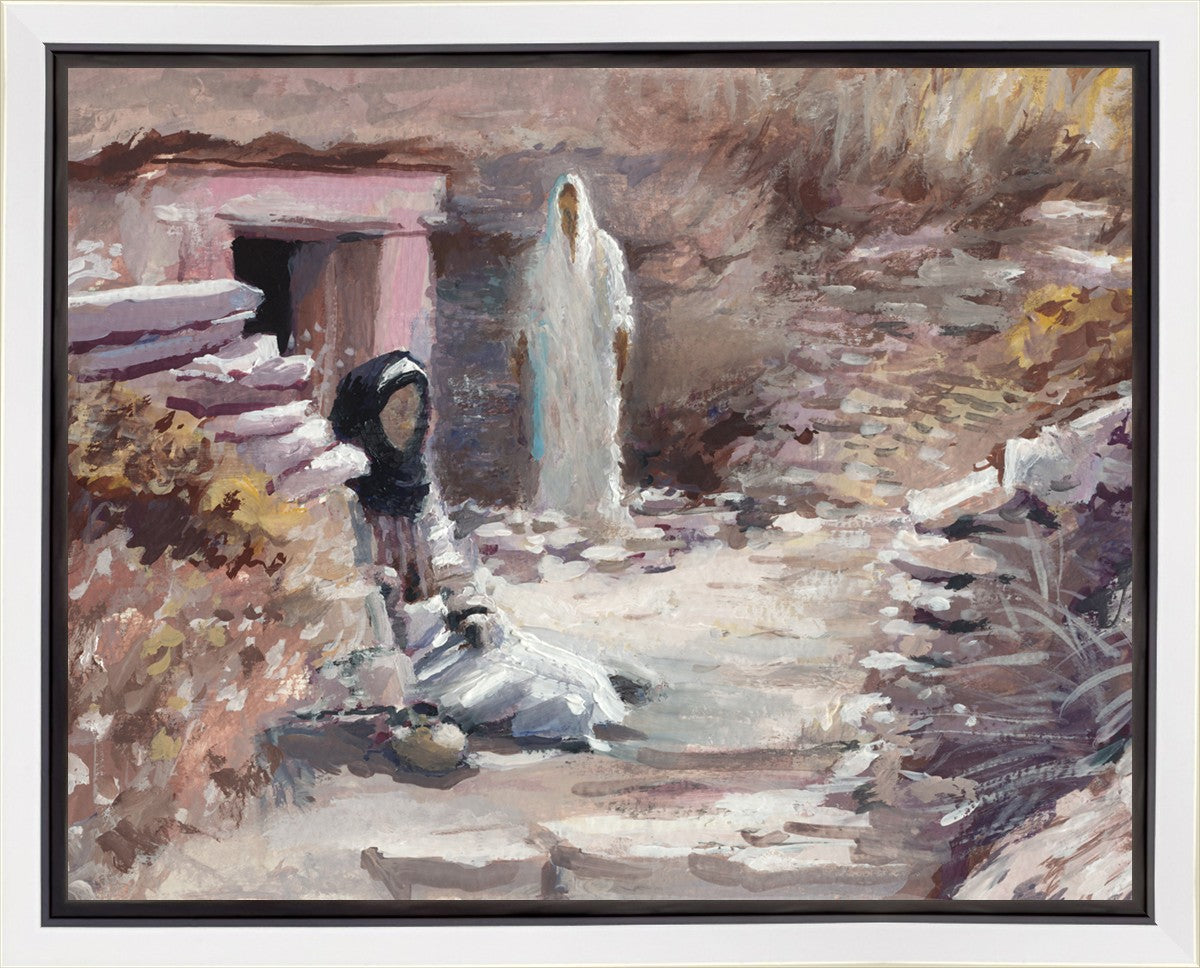 This painting was a consolation gift to a sister in our Stake whose husband died. Sooner or later each of us will experience death of loved ones and will ask oneself the question "Will I still see you again?" The image of the resurrected Christ appearing to Mary is an attempt to give hope and comfort in the midst of grief and loss. This painting depicts the touching moment between grief and hopelessness and everlasting joy. It serves as a reminder that even in the darkest moments of life, there is hope and light, and that our loved ones who have passed away are not truly gone, but live on in the heavenly spheres.