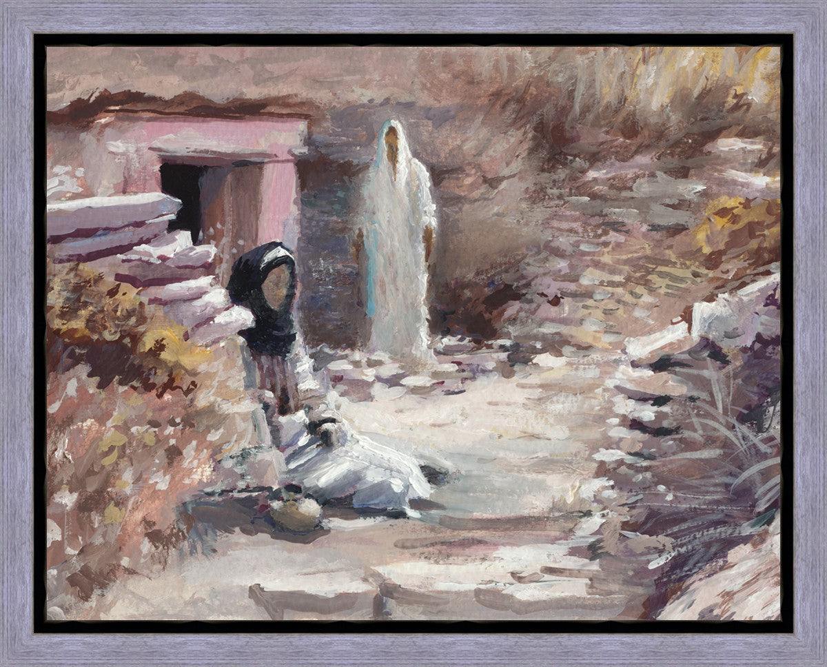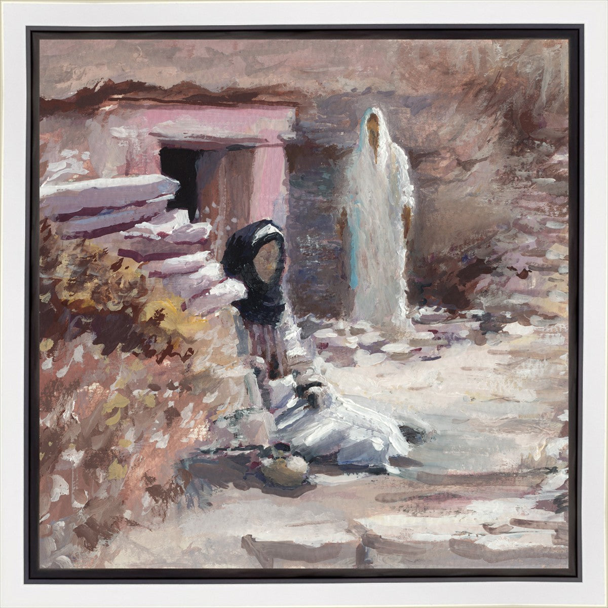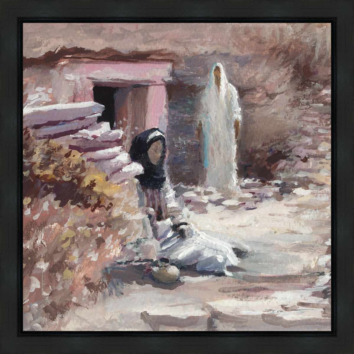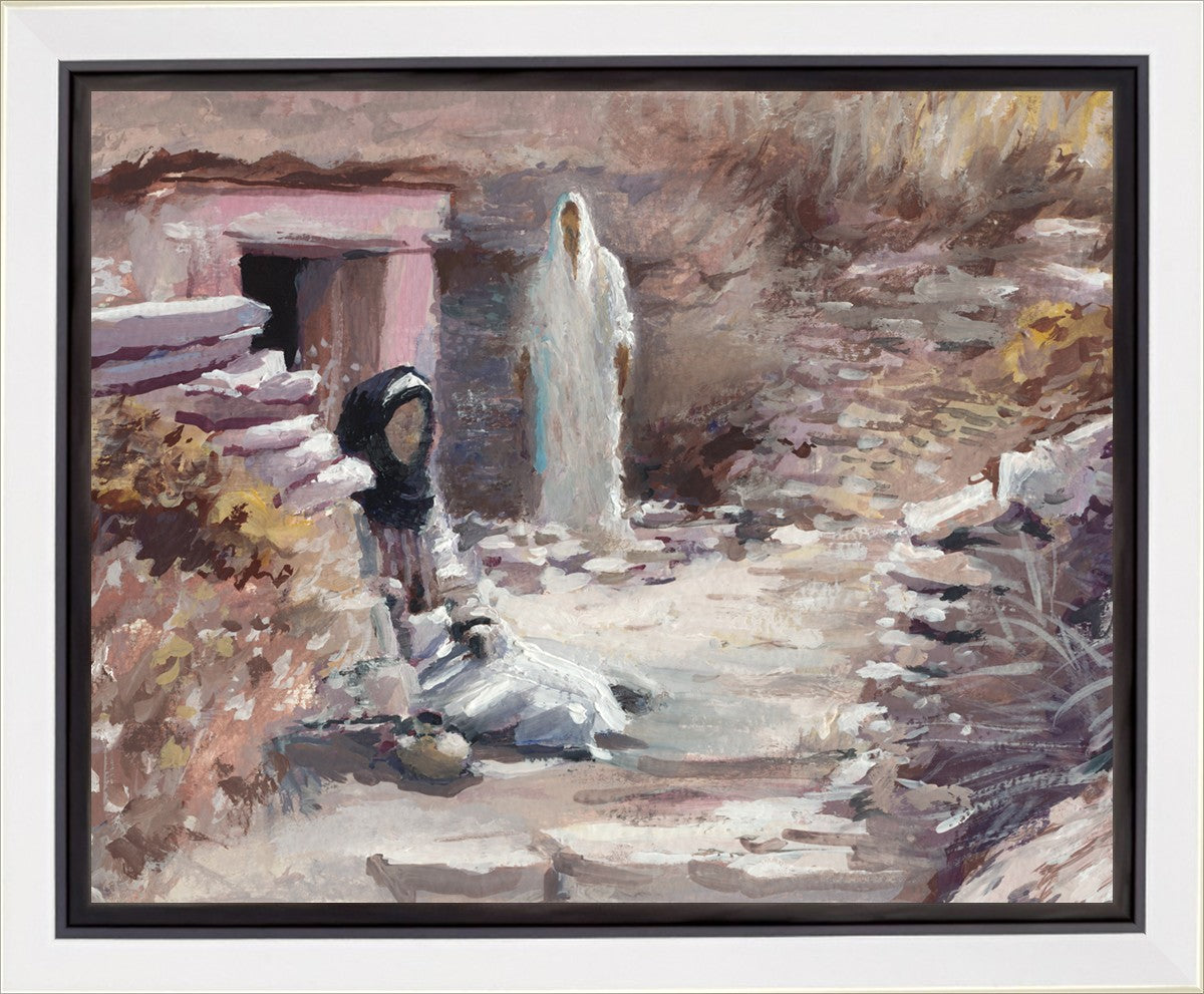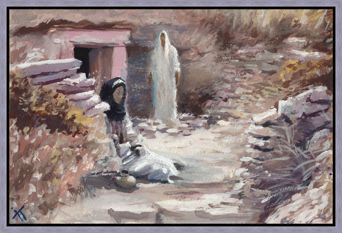 This painting was a consolation gift to a sister in our Stake whose husband died. Sooner or later each of us will experience death of loved ones and will ask oneself the question "Will I still see you again?" The image of the resurrected Christ appearing to Mary is an attempt to give hope and comfort in the midst of grief and loss. This painting depicts the touching moment between grief and hopelessness and everlasting joy. It serves as a reminder that even in the darkest moments of life, there is hope and light, and that our loved ones who have passed away are not truly gone, but live on in the heavenly spheres.