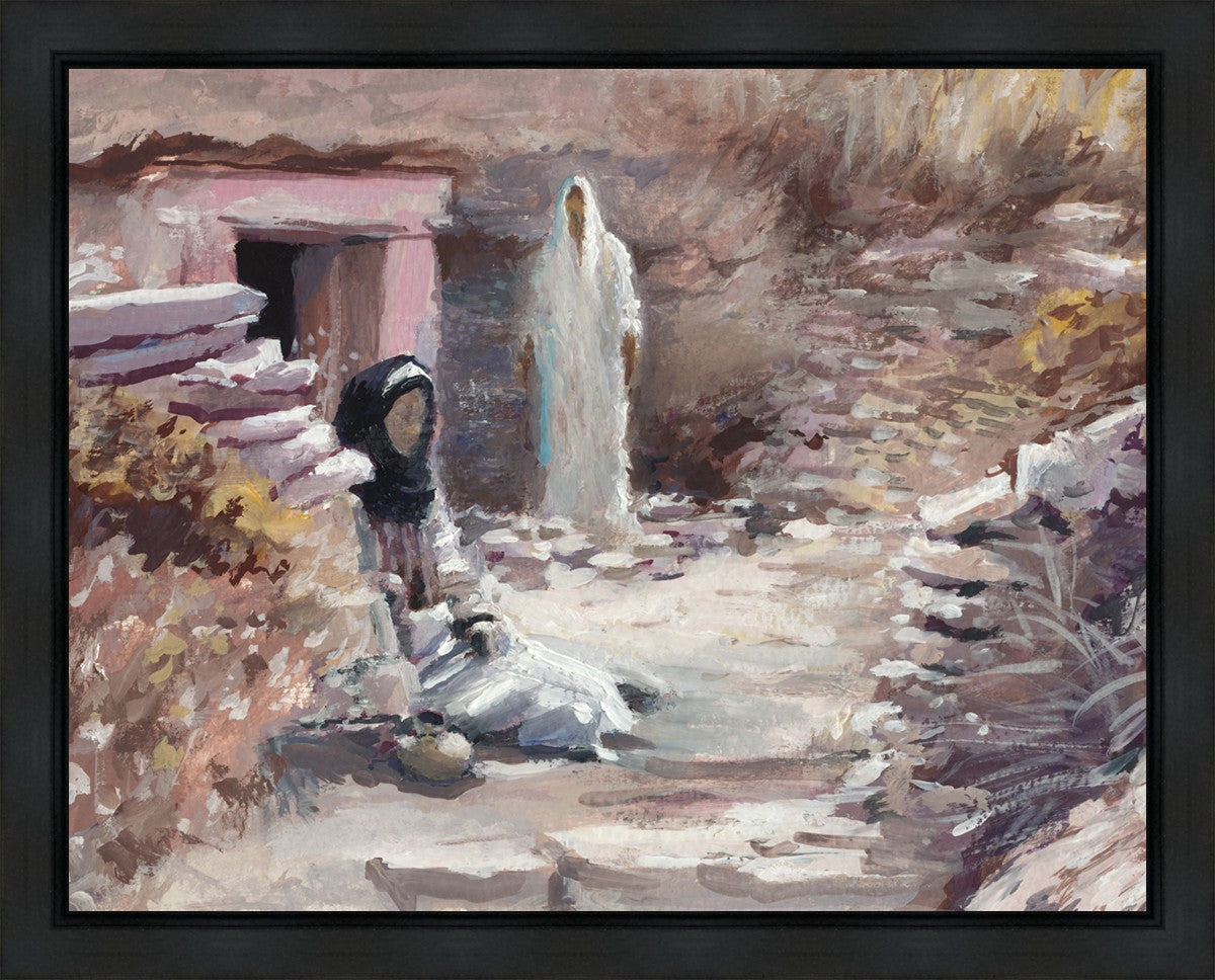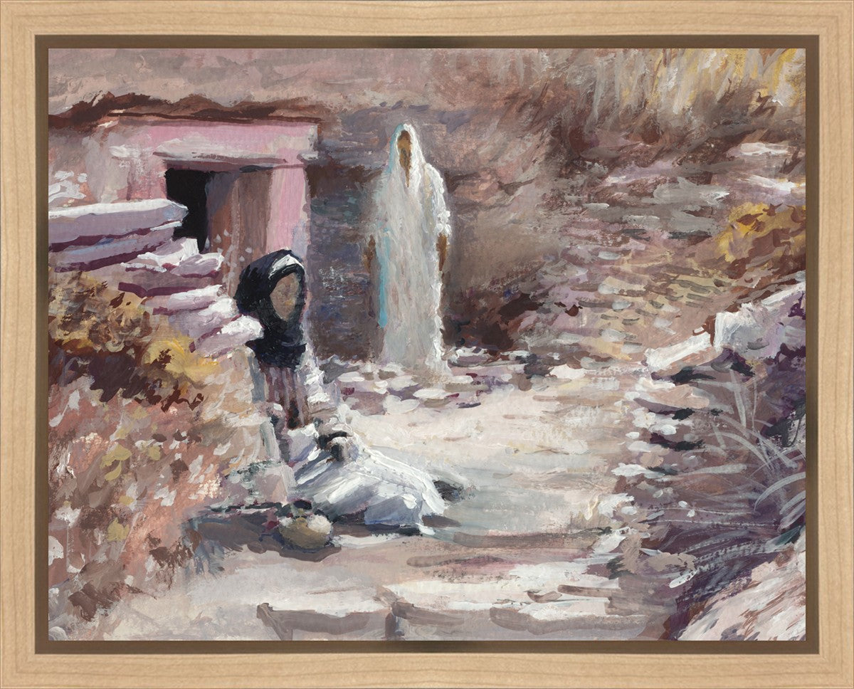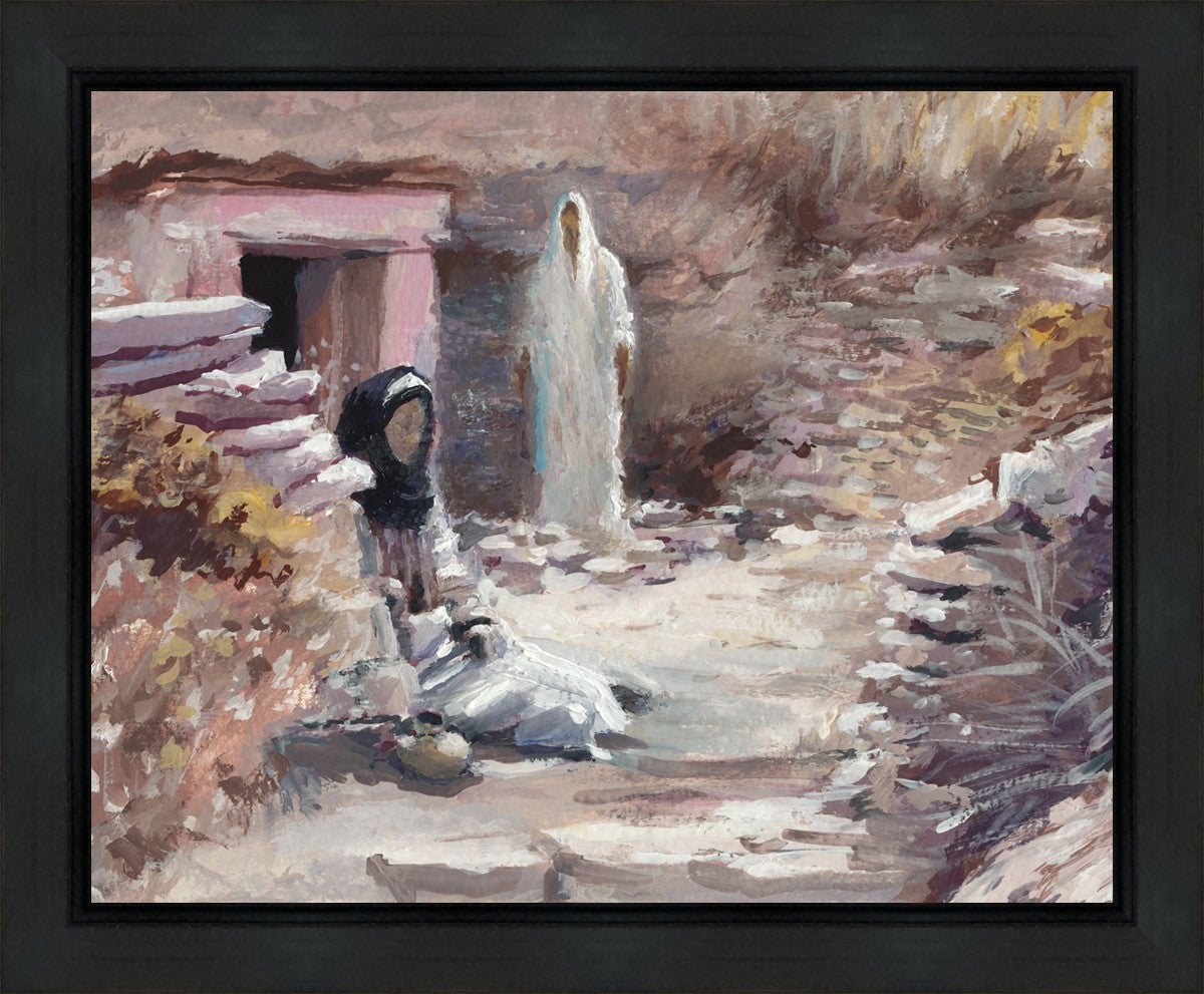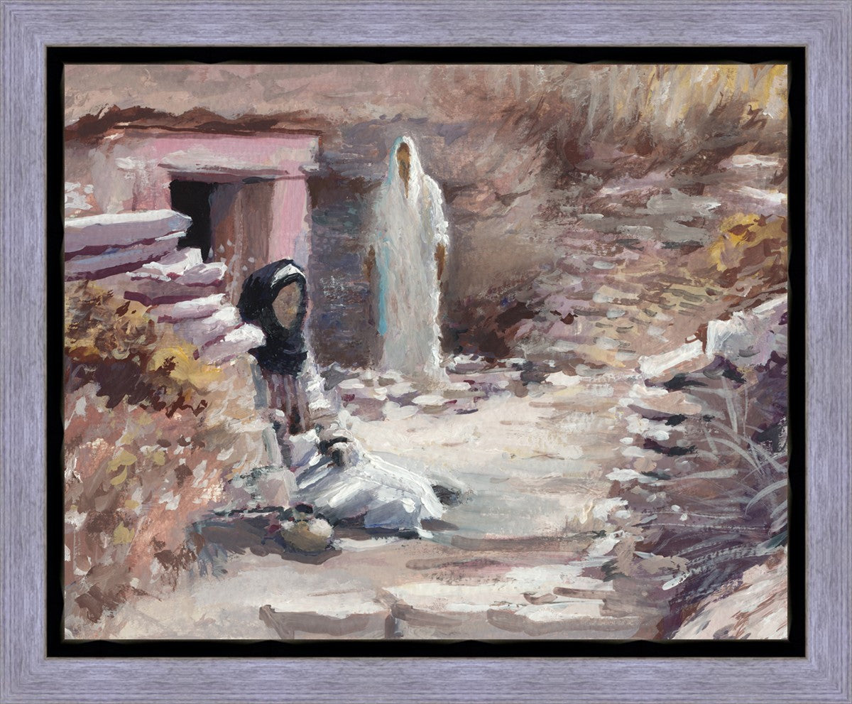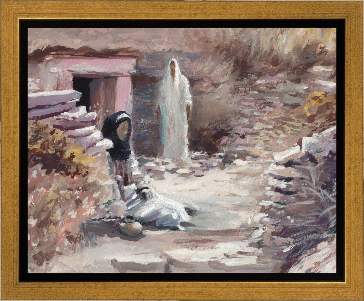 This painting was a consolation gift to a sister in our Stake whose husband died. Sooner or later each of us will experience death of loved ones and will ask oneself the question "Will I still see you again?" The image of the resurrected Christ appearing to Mary is an attempt to give hope and comfort in the midst of grief and loss. This painting depicts the touching moment between grief and hopelessness and everlasting joy. It serves as a reminder that even in the darkest moments of life, there is hope and light, and that our loved ones who have passed away are not truly gone, but live on in the heavenly spheres.