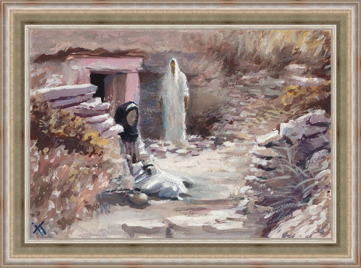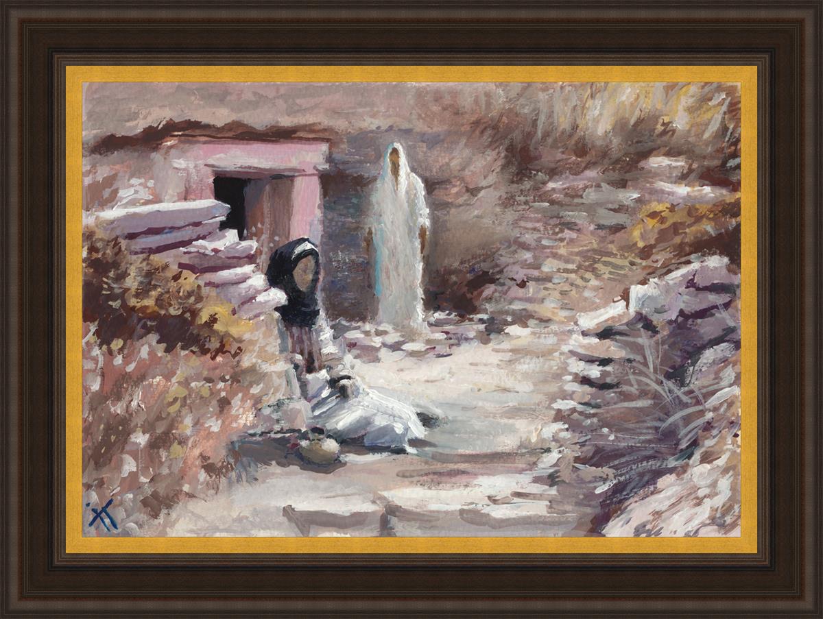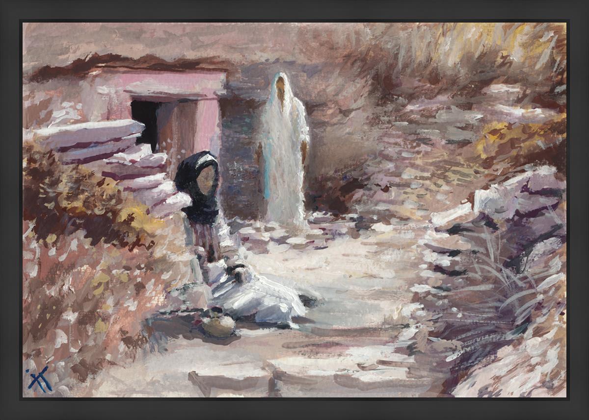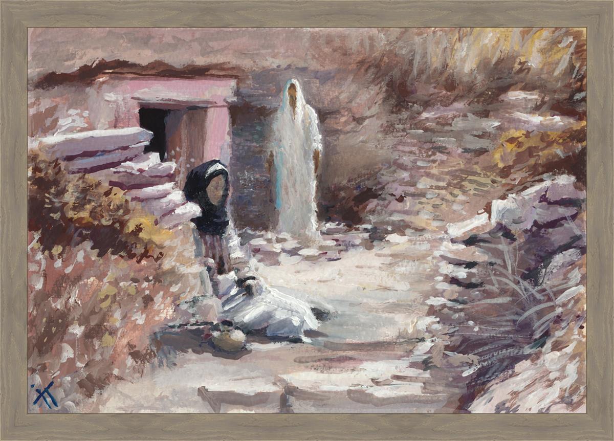 This painting was a consolation gift to a sister in our Stake whose husband died. Sooner or later each of us will experience death of loved ones and will ask oneself the question "Will I still see you again?" The image of the resurrected Christ appearing to Mary is an attempt to give hope and comfort in the midst of grief and loss. This painting depicts the touching moment between grief and hopelessness and everlasting joy. It serves as a reminder that even in the darkest moments of life, there is hope and light, and that our loved ones who have passed away are not truly gone, but live on in the heavenly spheres.