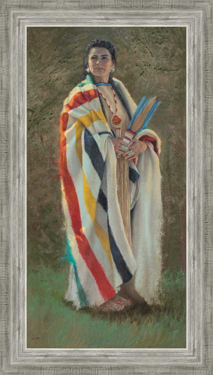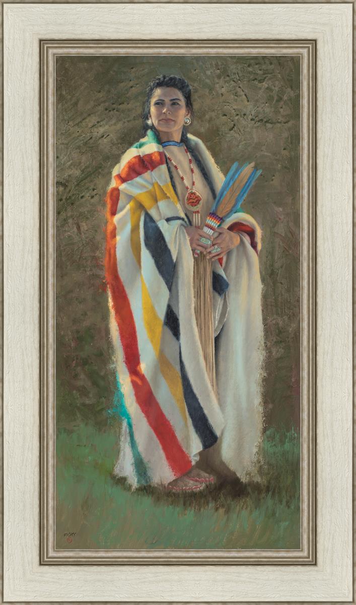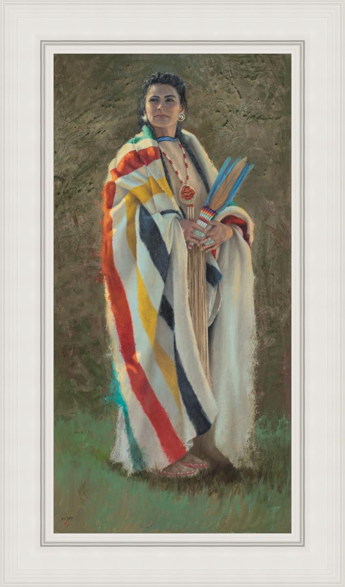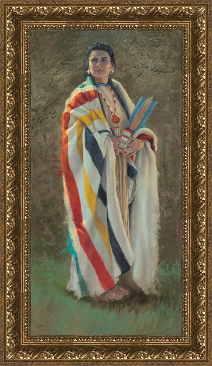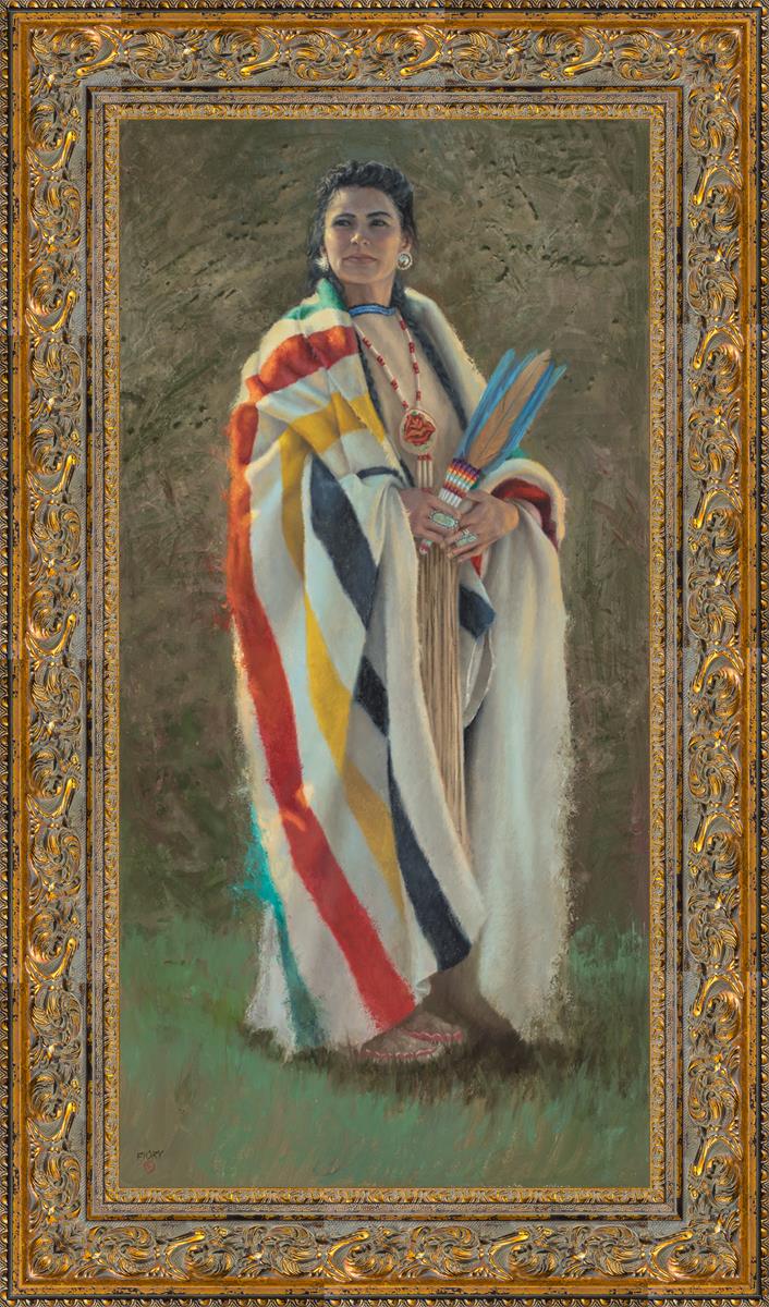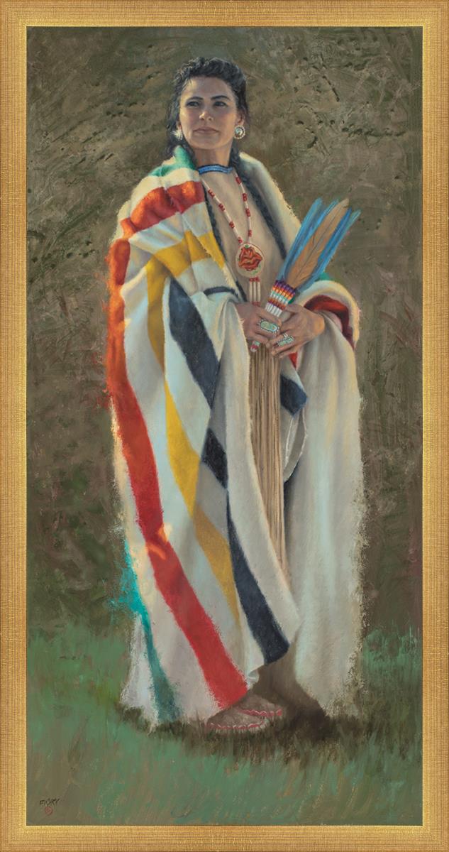 For this piece, I wanted to do another Native American woman in a Hudson Bay blanket. In 2023, I got best of show at a show in Wyoming for a guy in a Hudson Bay blanket that i had painted, and had the idea to paint a female version and take this piece to that same show this year. Though maybe it is more of a contemporary piece because of the fan and the necklace and that they aren't Northern Plains wear. But I thought if she was Southern Plains perhaps the fan could have come from Mexico or something as a trade item, as I am sure things got passed around quite a bit between the different groups of people and their cultures.