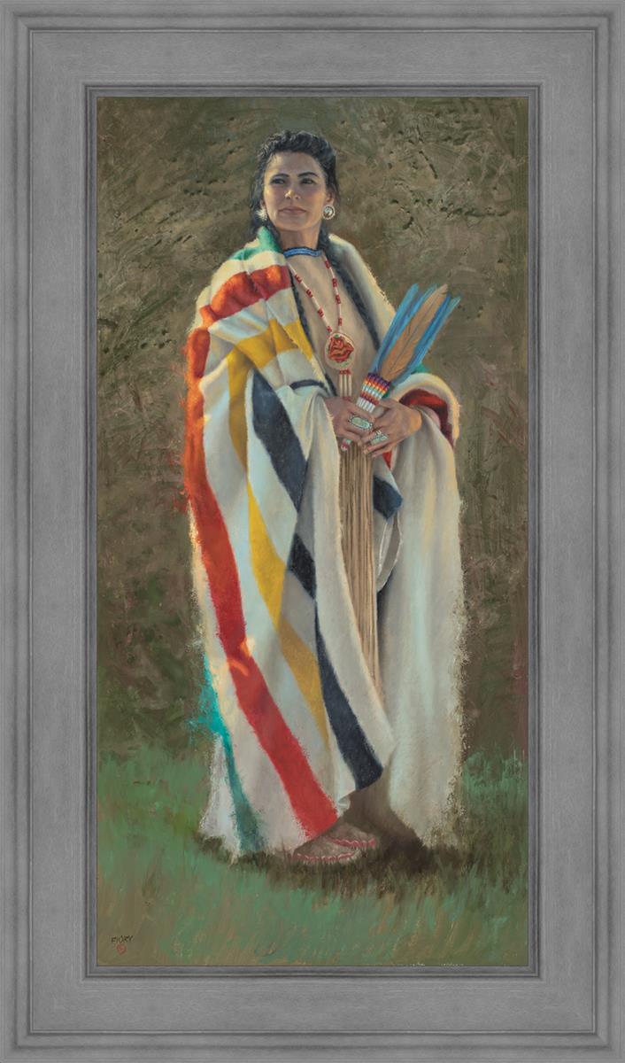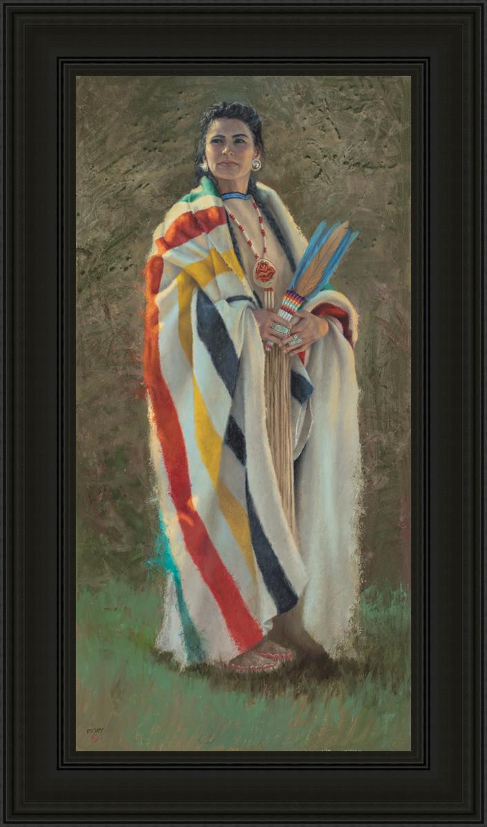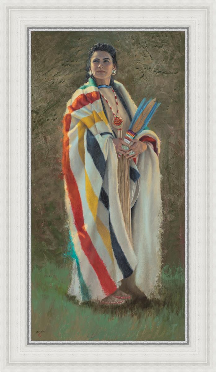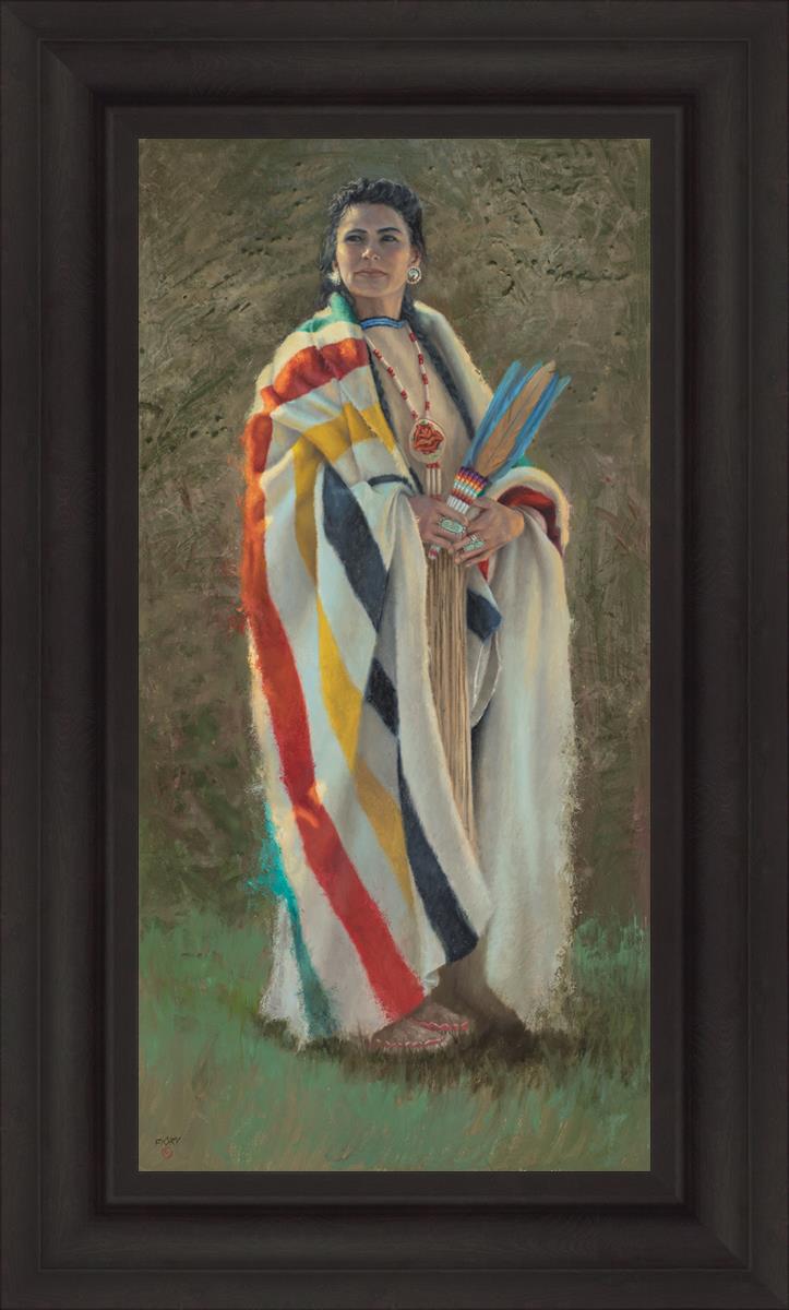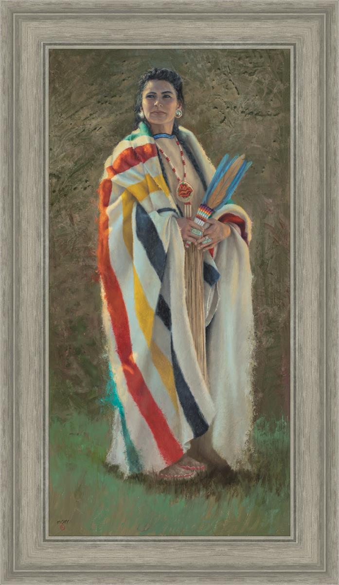 For this piece, I wanted to do another Native American woman in a Hudson Bay blanket. In 2023, I got best of show at a show in Wyoming for a guy in a Hudson Bay blanket that i had painted, and had the idea to paint a female version and take this piece to that same show this year. Though maybe it is more of a contemporary piece because of the fan and the necklace and that they aren't Northern Plains wear. But I thought if she was Southern Plains perhaps the fan could have come from Mexico or something as a trade item, as I am sure things got passed around quite a bit between the different groups of people and their cultures.