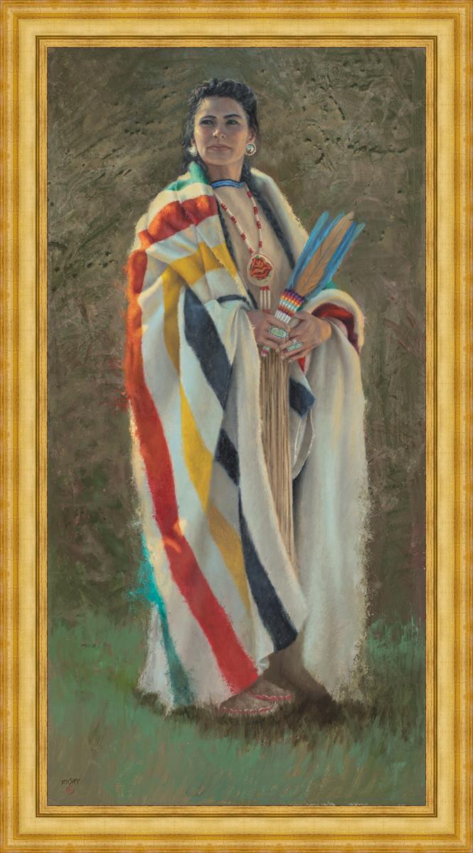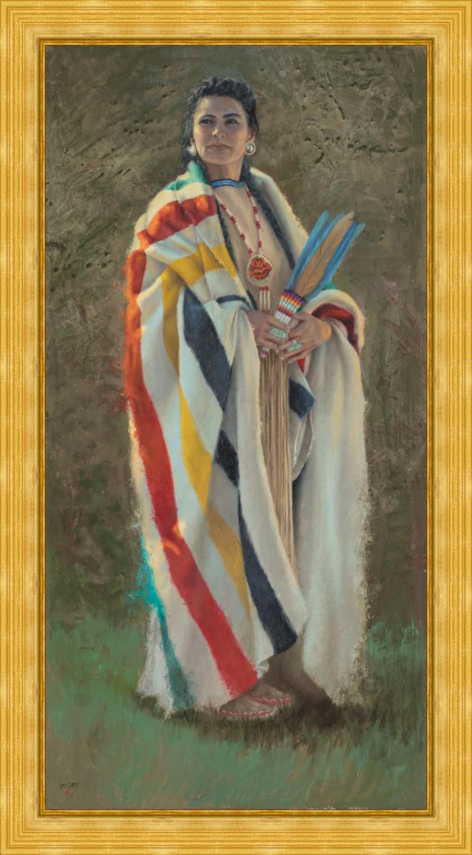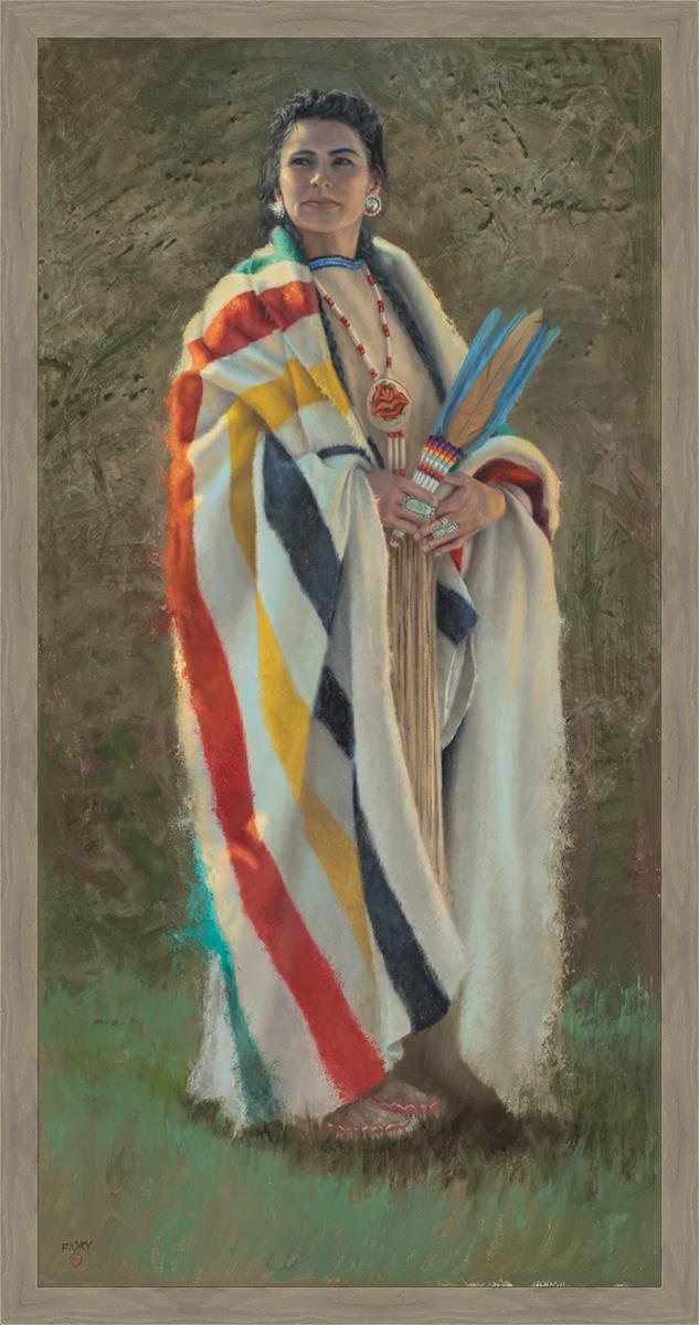 For this piece, I wanted to do another Native American woman in a Hudson Bay blanket. In 2023, I got best of show at a show in Wyoming for a guy in a Hudson Bay blanket that i had painted, and had the idea to paint a female version and take this piece to that same show this year. Though maybe it is more of a contemporary piece because of the fan and the necklace and that they aren't Northern Plains wear. But I thought if she was Southern Plains perhaps the fan could have come from Mexico or something as a trade item, as I am sure things got passed around quite a bit between the different groups of people and their cultures.