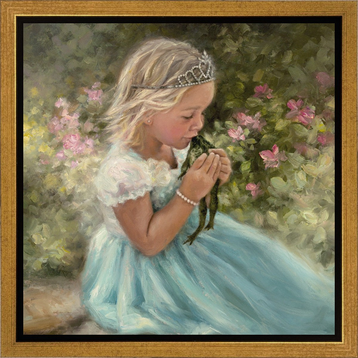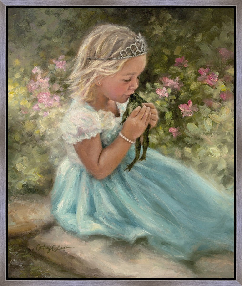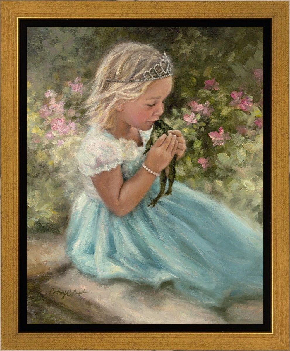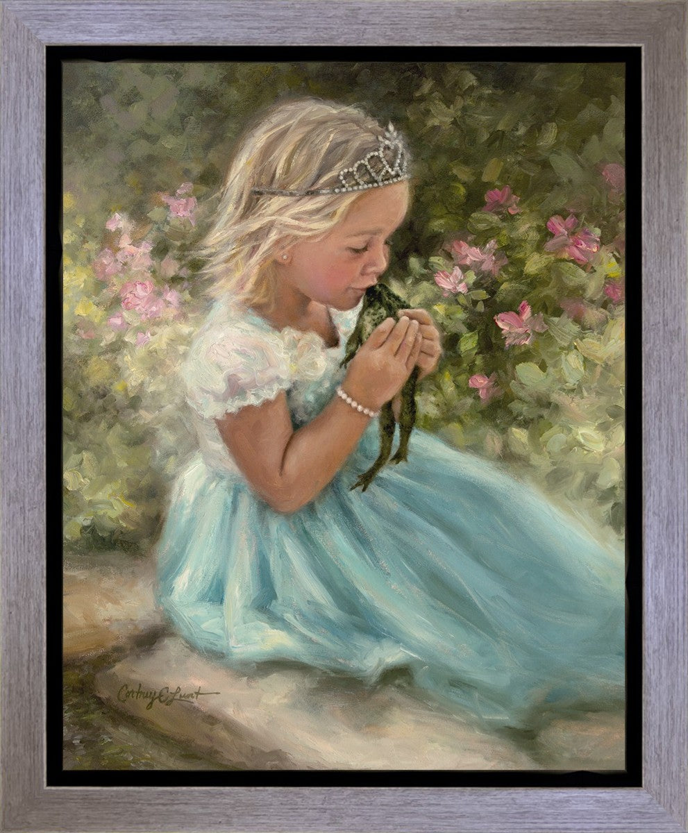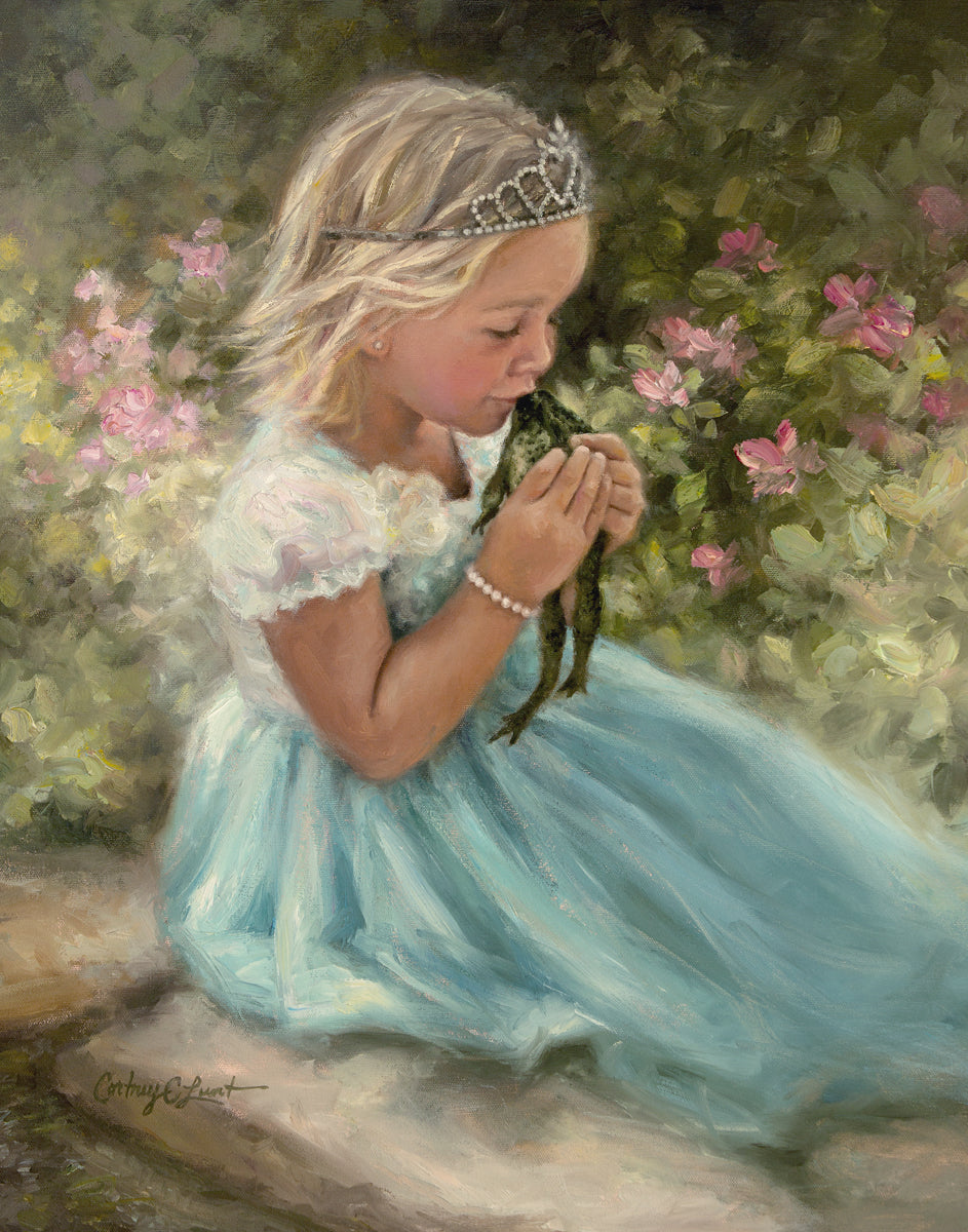 Little girls believe they are princesses. This girl, in particular, had no fear of kissing this toad! She was fully confident that her kiss could make something happen, and she knew she was special in her little gown. For some reason, when girls get a bit older, they forget to believe. They sometimes forget who they truly are. I hope that this painting can bring back some of that belief.