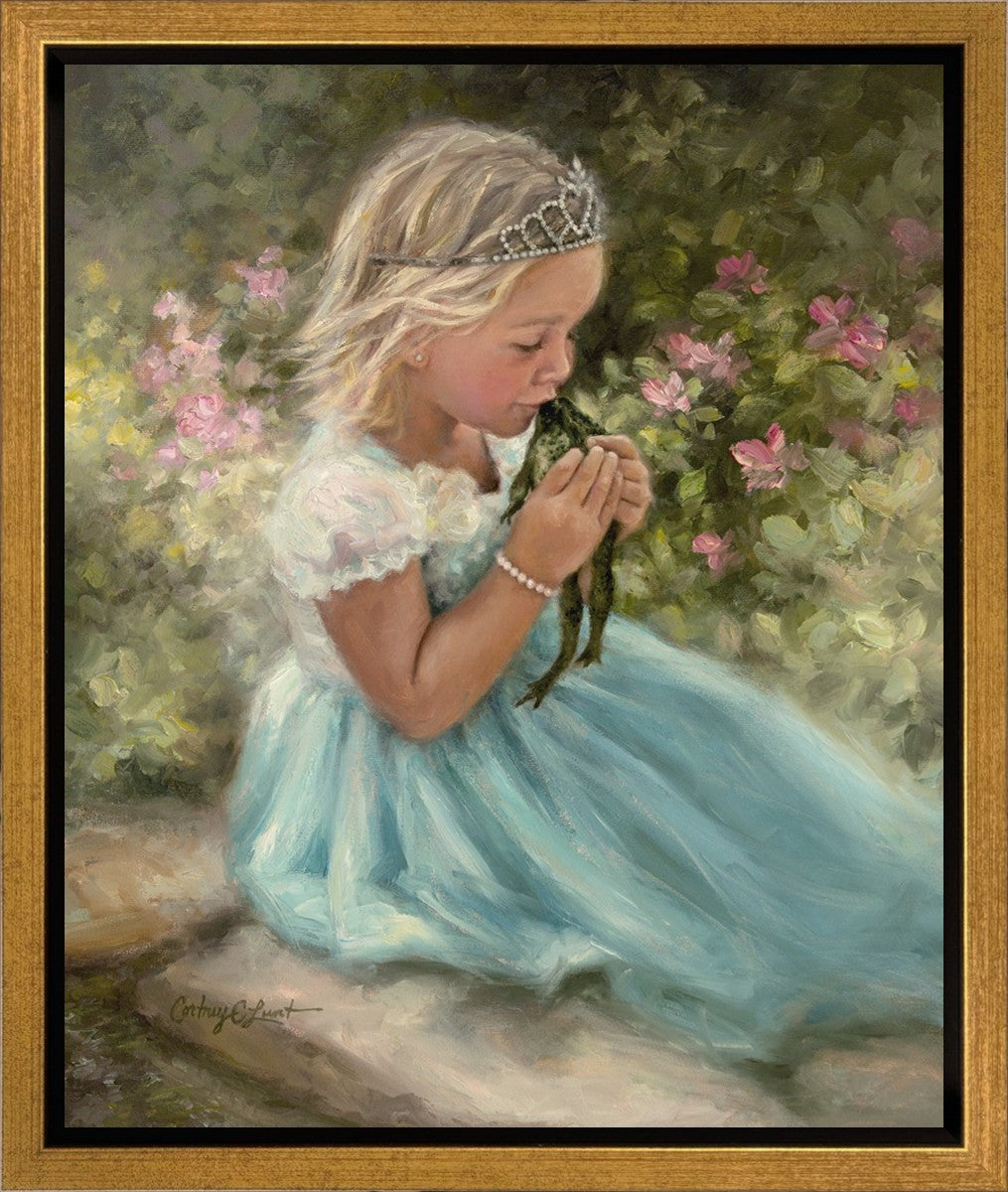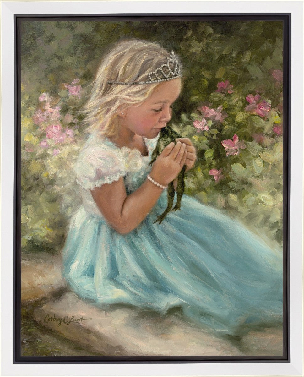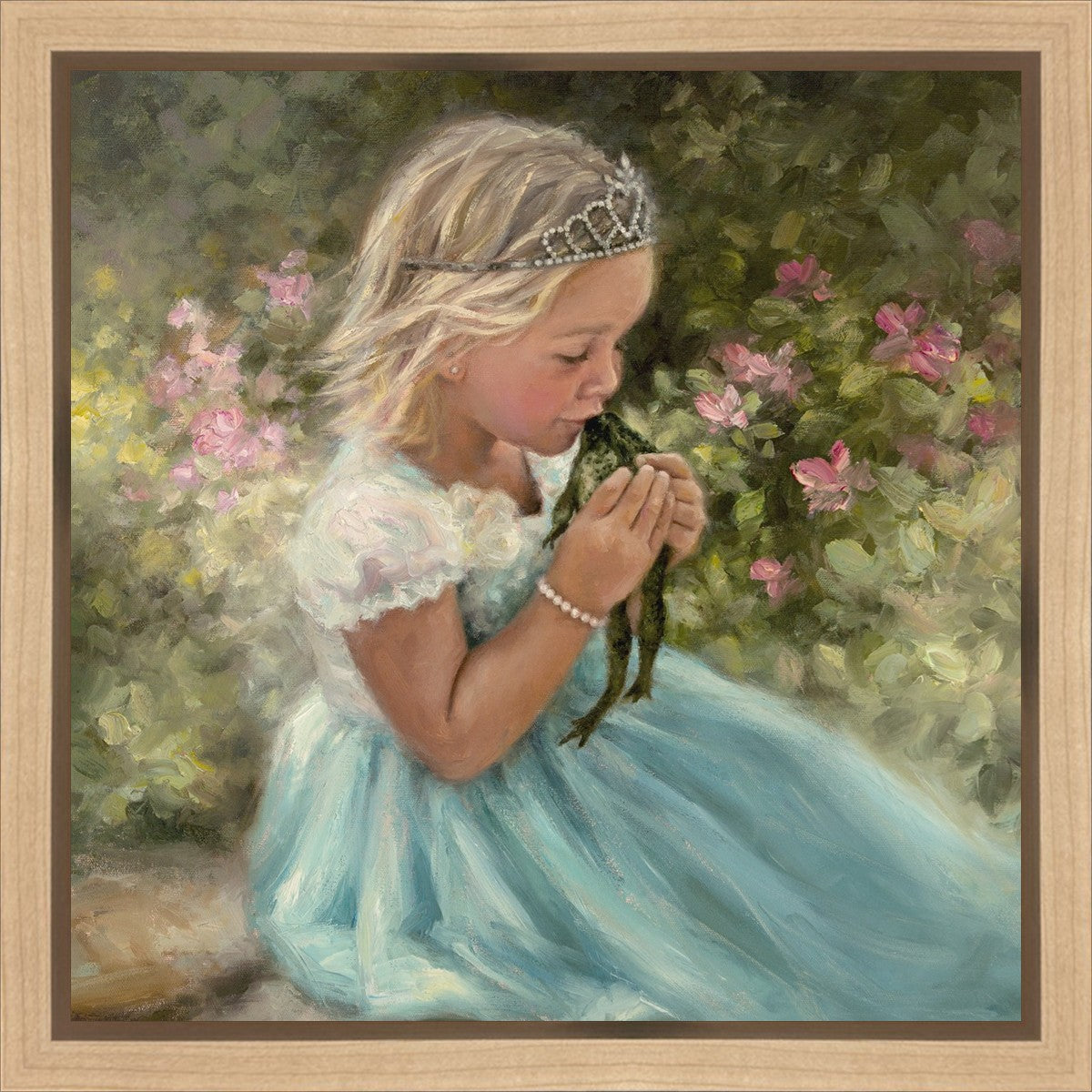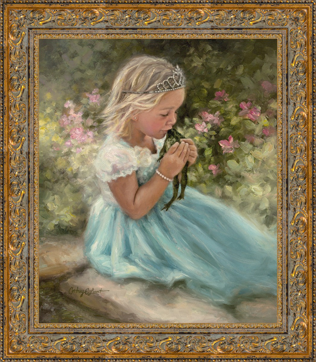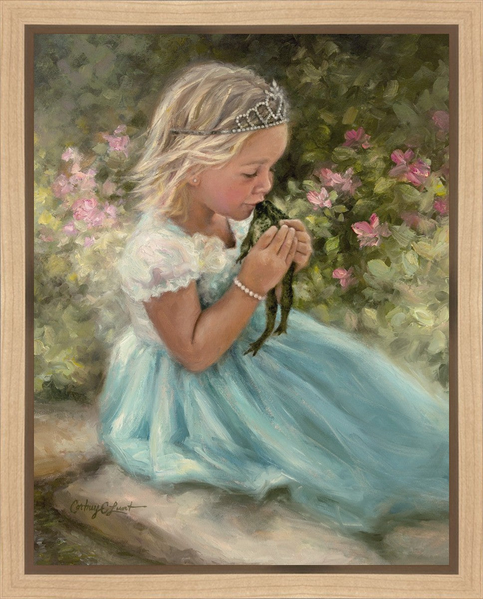 Little girls believe they are princesses. This girl, in particular, had no fear of kissing this toad! She was fully confident that her kiss could make something happen, and she knew she was special in her little gown. For some reason, when girls get a bit older, they forget to believe. They sometimes forget who they truly are. I hope that this painting can bring back some of that belief.