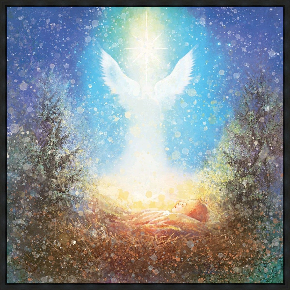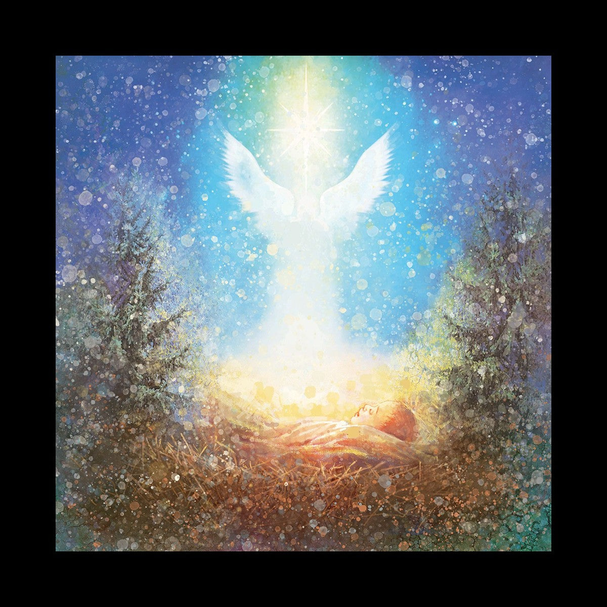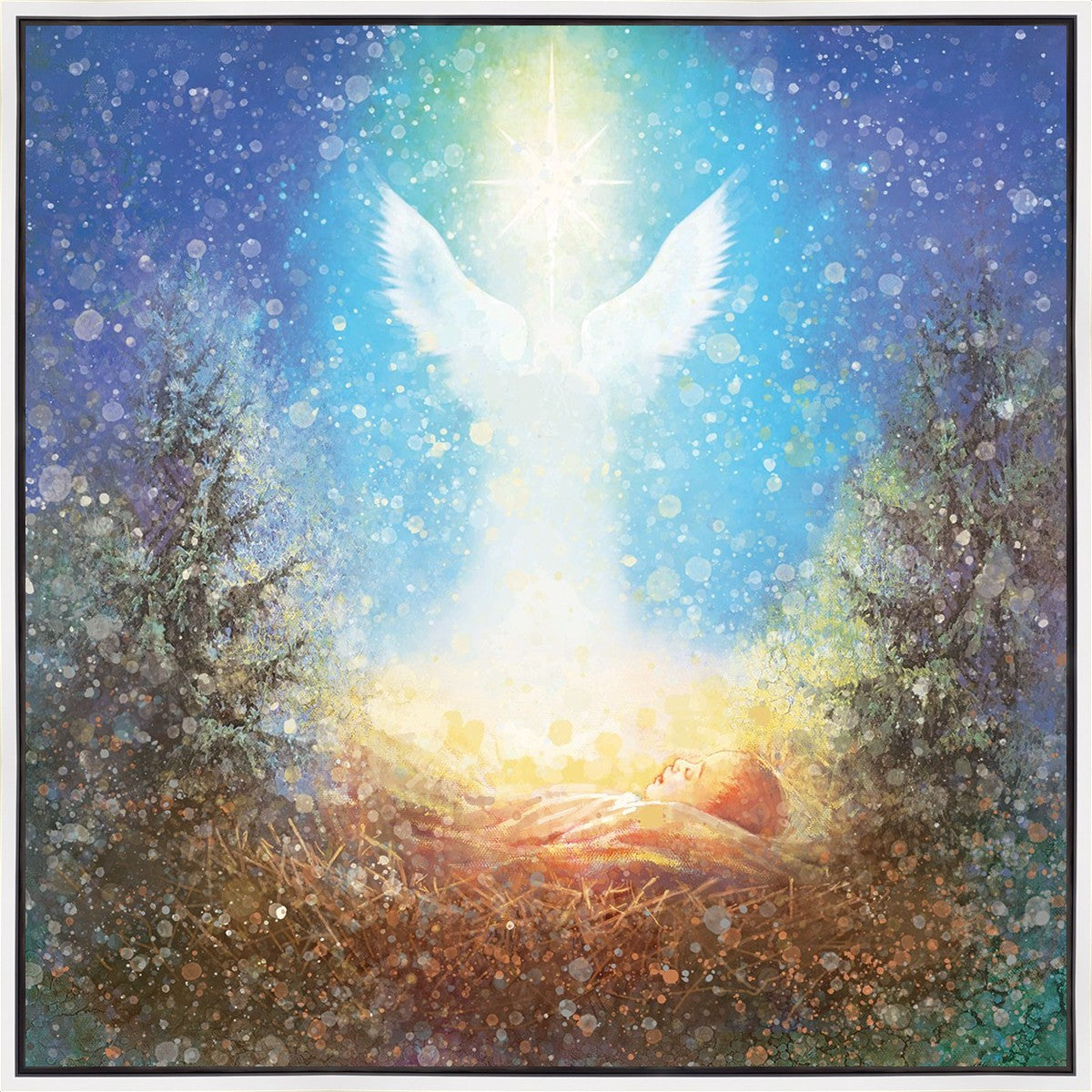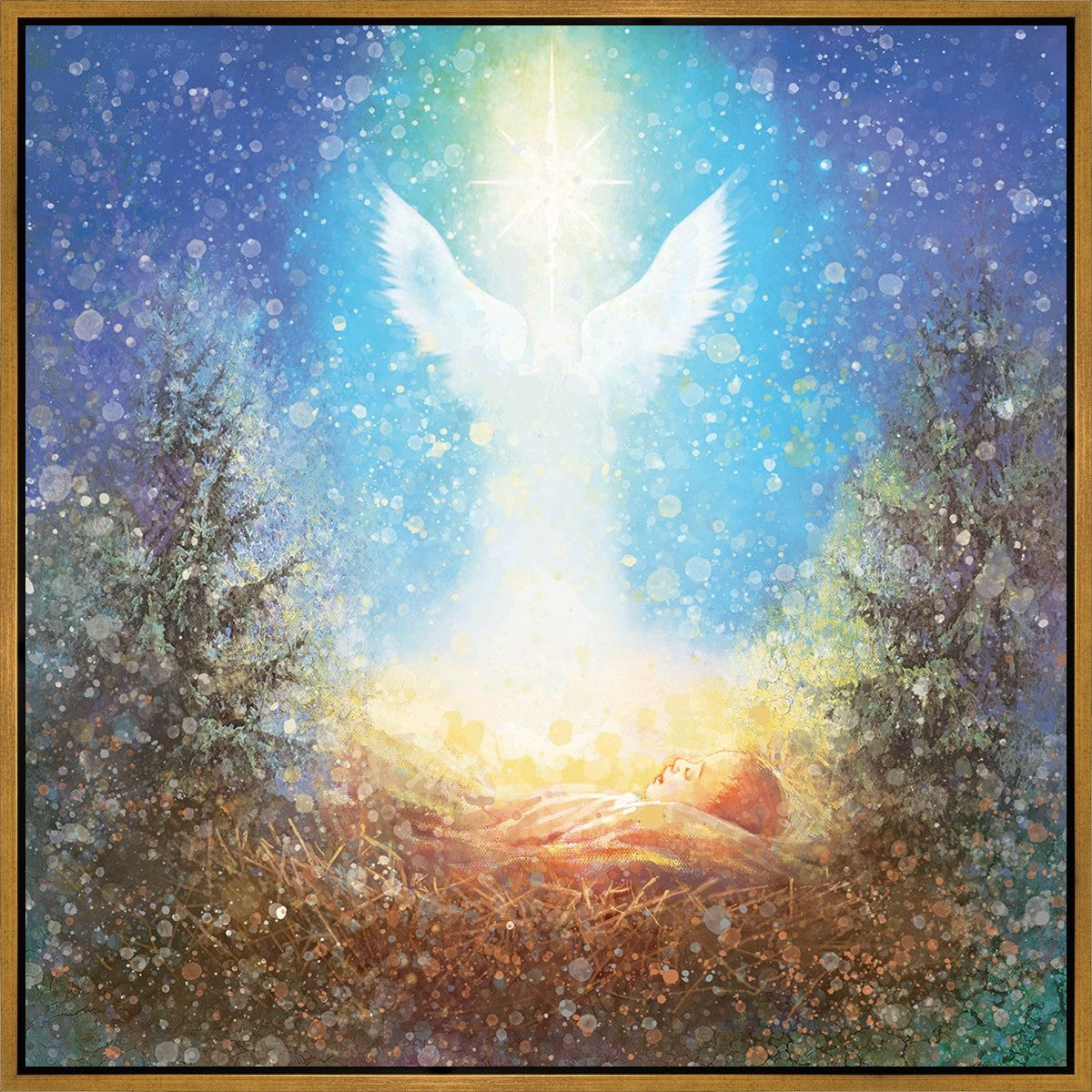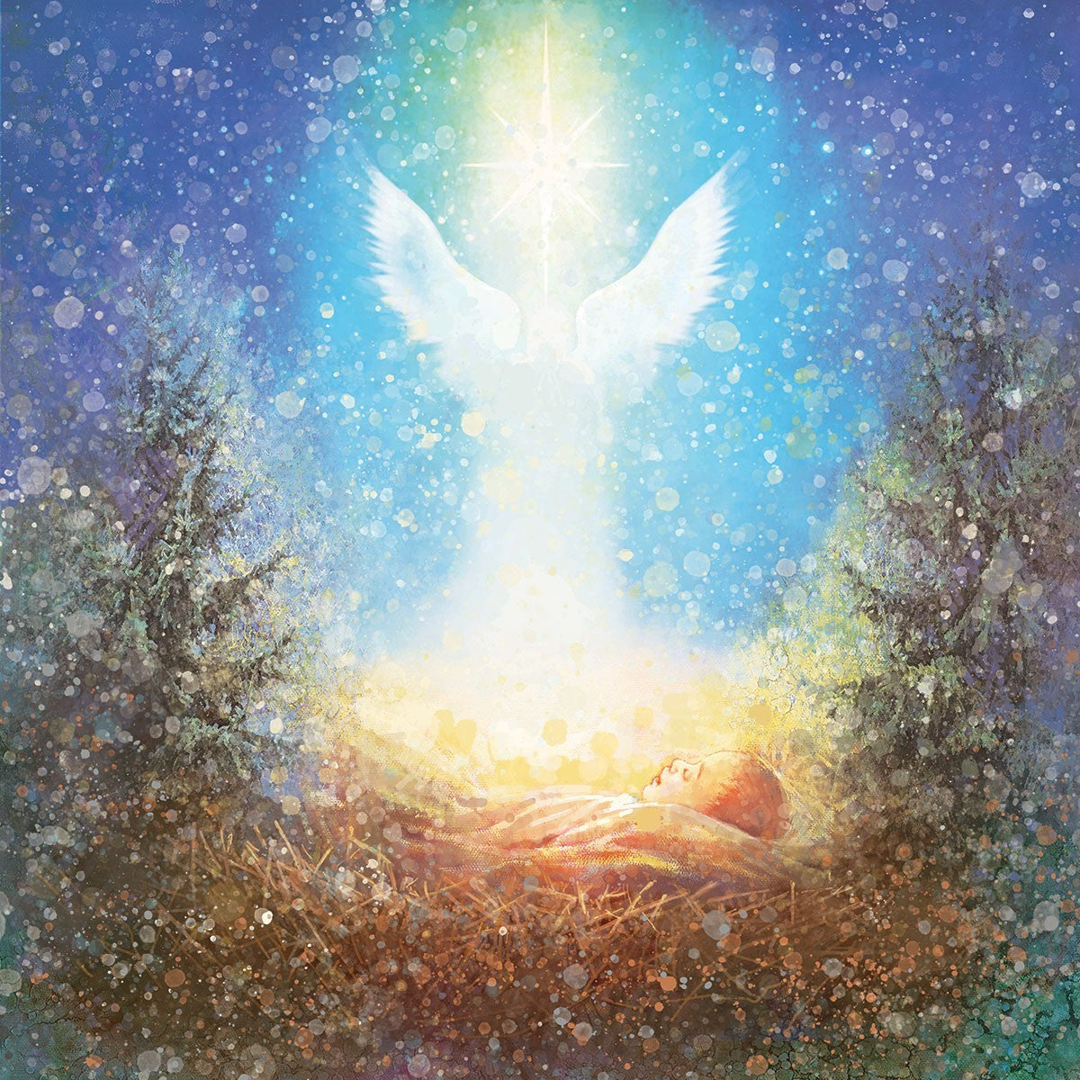 I Bring You Good News by Yongsung Kim features a nativiy with the angel Gabriel appearing above the newborn baby jesus against a colorful, jubuliant background